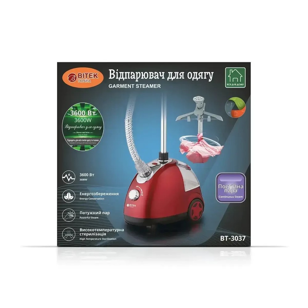 Відпарювач вертикальний для одягу BITEK BT-3037 3600W Парова праска для всіх типів тканини Відпарювач для одягу вертикальний BITEK BT-3037 — це сучасний пристрій, що дає змогу прасувати одяг і домашній текстиль із мінімальними зусиллями. Він забезпечує як горизонтальне, так і вертикальне відпарювання, що робить його незамінним помічником у побуті. Відпарювач безпечний для всіх типів тканин, включно з найтоншими та найделікатнішими, як синтетичними, так і натуральними. Вплив пари на тканину щадний, що продовжує термін експлуатації одягу. Переваги: Щадний вплив: Пара не робить тиску на тканину, як розпечена поверхня праски, завдяки чому речі слугують довше. Зручність: Можна відпарювати одяг прямо на вішалці, не використовуючи прасувальну дошку. Безпека: Відпарювач не залишає плям, не створює заломів і не деформує структуру тканини. Делікатне прасування: Безпечно відпарює одяг із декоративними елементами, як-от рюші, стрази, наклейки, вишивка, бісер, склярус та інші прикраси. Швидкість: Прасування відбувається швидше та більш гладко, ніж під час використання традиційної праски. Багатофункціональність: Має функції прасування, стерилізації, вирівнювання зморщок і пиловидалення. Швидке нагрівання: Ефективне нагрівання за 36 секунд. Характеристики: Максимальний об'єм води: 1,5 л Номінальна напруга: 200 В, 50 Гц Номінальна потужність: 3600 Вт Час безперервної роботи: 60 хв Розміри: 37,5х28х33 см