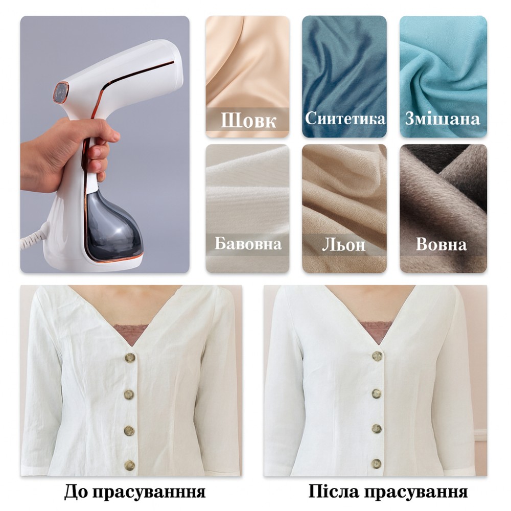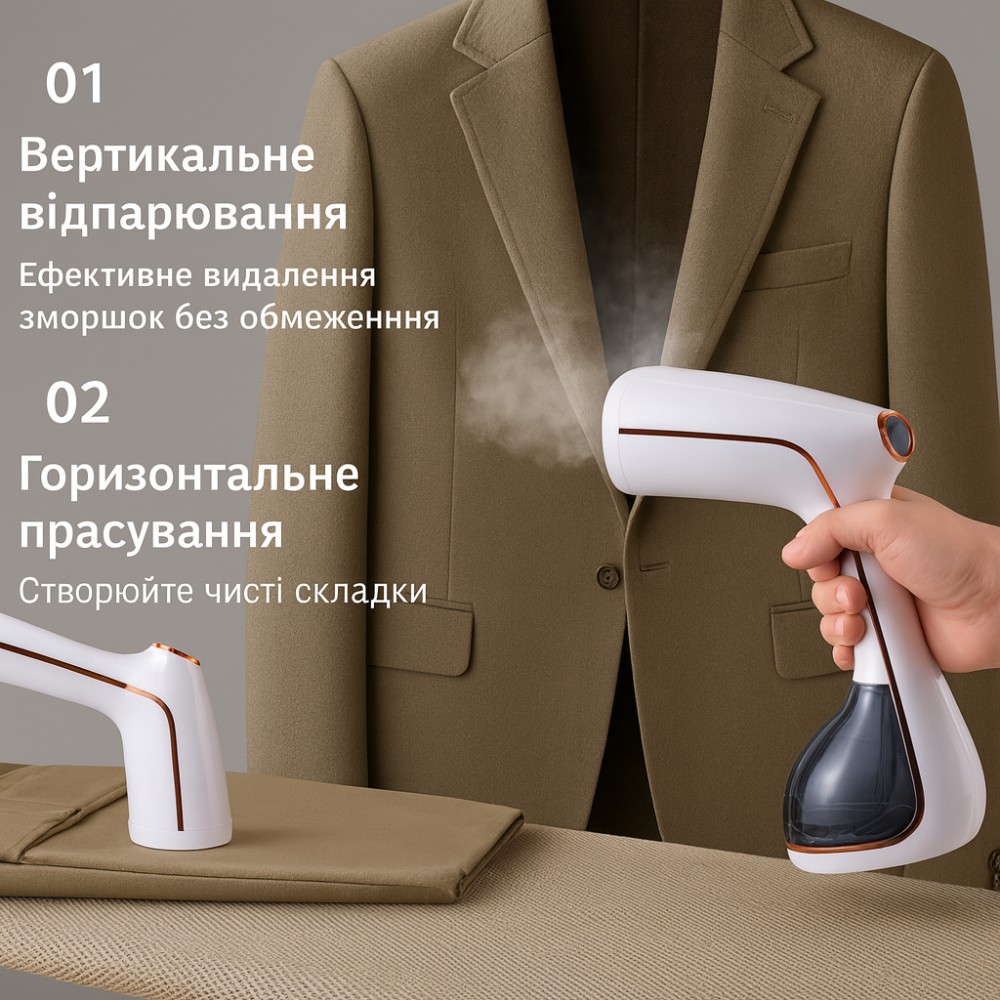 Опис товару Ручний відпарювач потужністю 1500 Вт — це незамінний помічник для швидкого та делікатного догляду за речами будинку або в поїздках. Компактний пристрій дає змогу миттєво розпрасувати складки, освіжити текстиль і усунути неприємні запахи без використання громіздкої прасувальної дошки, заощаджуючи ваш час і сили. Переваги та особливості: Висока потужність: 1500 Вт забезпечують швидке нагрівання та стабільне подавання пари, що дає змогу справлятися навіть зі щільними тканинами. Швидка готовність до роботи: Пристрій нагрівається менш ніж за 30 секунд, що ідеально для ранкових зборів. Безпека для тканин: Парове оброблення не деформує волокна, підходить для шовку, синтетики, бавовни, вовни та льону. Сталева підошва: Робоча поверхня з неіржавкої сталі забезпечує легке ковзання й довговічність приладу. Місткий резервуар: Ємність для води об'ємом 280 мл дає змогу відпарити кілька речей поспіль без доливання. Функція фіксації подавання пари: Кнопку вмикання можна зафіксувати для безперервної роботи, щоб не тримати палець у напруженні. Компактність і ергономіка: Зручна ручка та легка вага роблять використання комфортним, а габарити дають змогу легко упакувати прилад у валізу. Універсальність: Підходить не тільки для одягу, але й для оброблення штор, м'яких меблів і дитячих іграшок (термічна дезінфекція). Технічні характеристики: Тип: ручний відпарювач Потужність: 1500 Вт Об'єм резервуара для води: 280 мл Матеріал підошви: нержавіюча сталь Час нагрівання: ~30 секунд Живлення: мережа 220 В Індикація роботи: є (світловий індикатор) Автоматичне вимкнення: у разі браку води або перегрівання Комплектація ручний відпарювач насадка-щітка для чищення одягу мірний стаканчик (опціонально) інструкція користувача заводське паковання