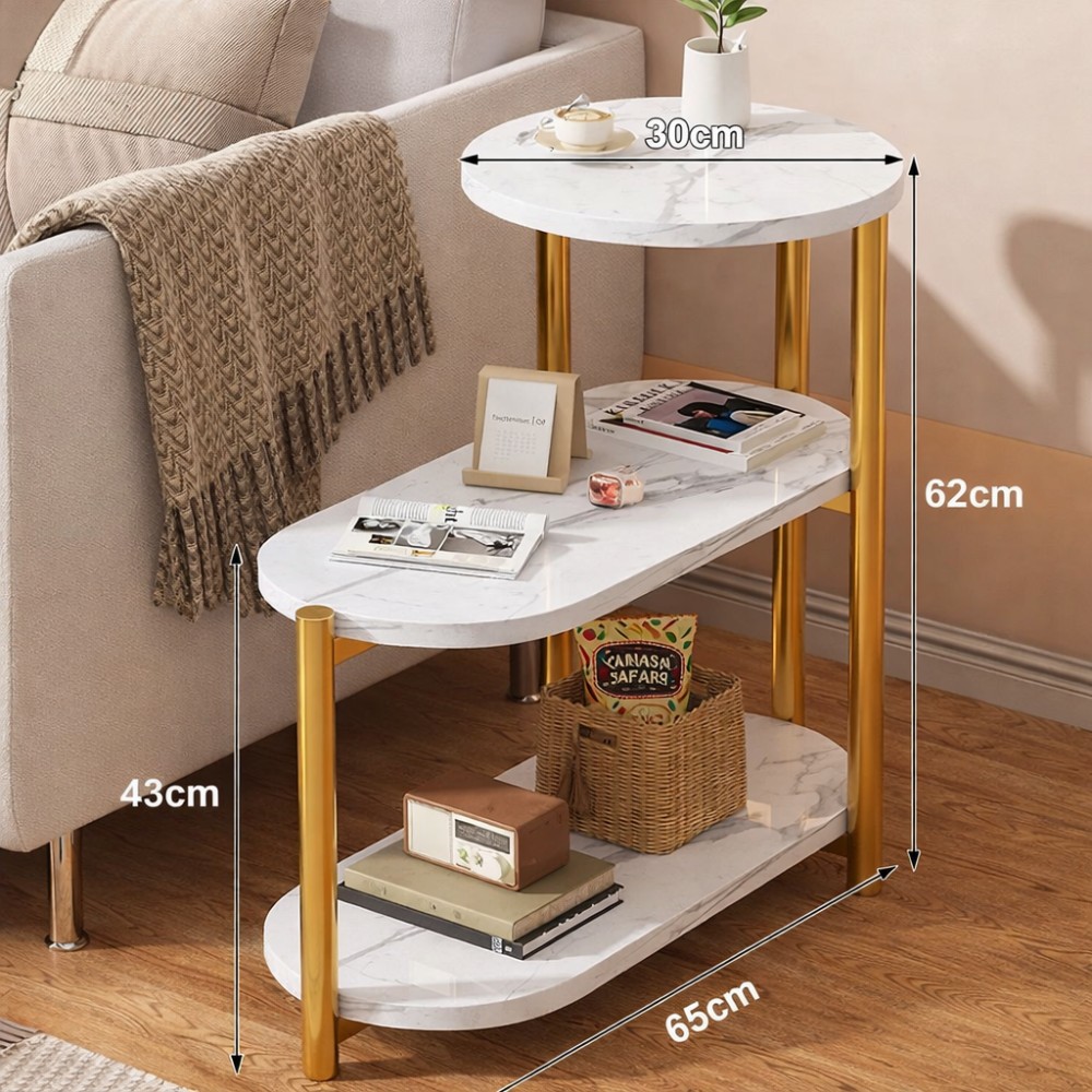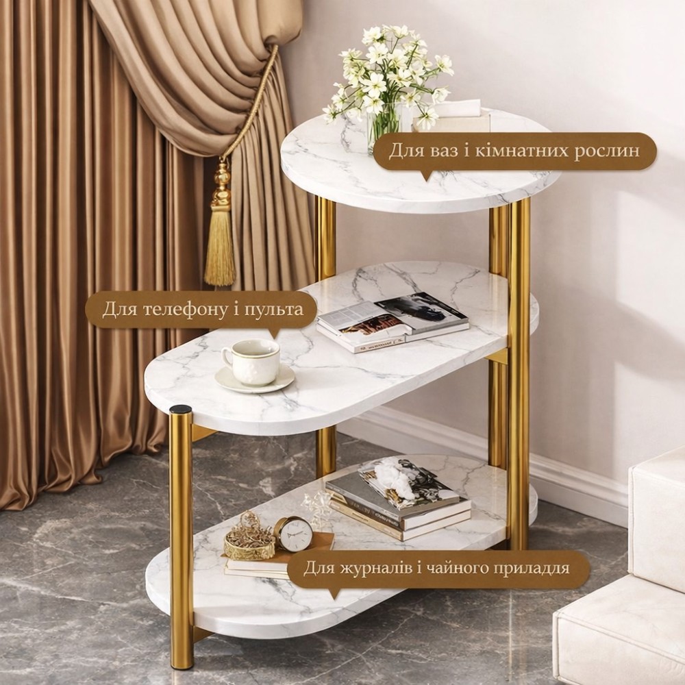 Стильний триярусний журнальний столик DASH-5497 — це поєднання сучасної естетики, функціональності та преміального вигляду. Ідеально підходить для вітальні, спальні або лаунж-зони. Біла стільниця з мармуровим візерунком у поєднанні із золотими металевими опорами створює елегантний акцент в інтер’єрі. Завдяки трьом рівням столик не лише прикрашає простір, а й забезпечує зручне зберігання. ???? Переваги моделі: 3 яруси для зручного зберігання Преміальний мармуровий дизайн Стійкий металевий каркас золотого кольору Компактна форма — підходить навіть для невеликих кімнат Ідеальний як журнальний або приставний столик ???? Характеристики: Модель: DASH-5497 Тип: журнальний / приставний столик Кількість ярусів: 3 Матеріал стільниць: МДФ з мармуровим покриттям Каркас: метал Колір стільниць: білий мармур Колір ніжок: золото Розміри: 65 × 30 × 62 см ???? Підійде для: зберігання книг і журналів декору (вази, свічки, статуетки) кави та чаю організації простору біля дивана