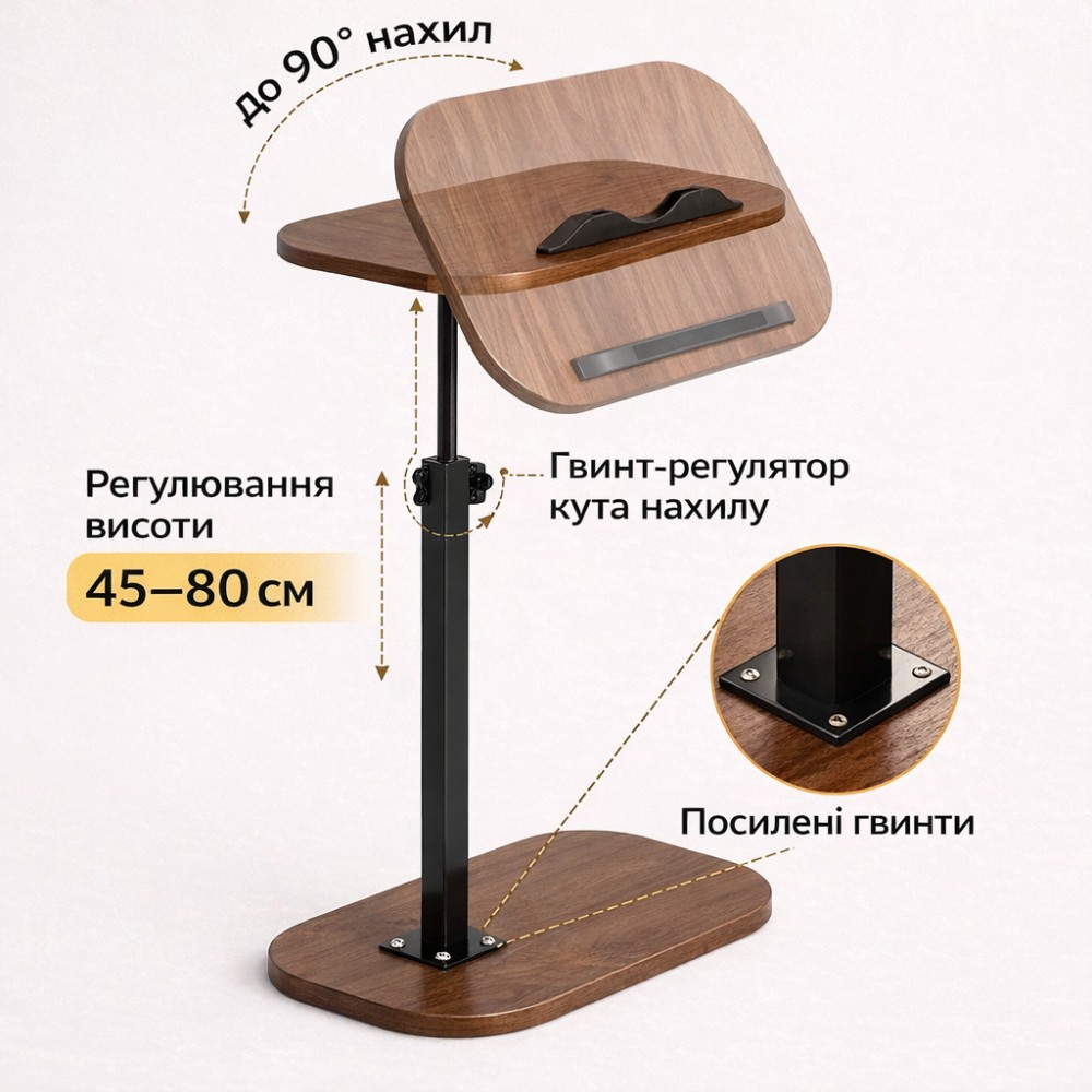 Функціональний журнальний столик Grant — зручний приставний столик до дивана, ліжка або крісла. Завдяки компактним розмірам він займає мінімум місця, водночас забезпечує повноцінну робочу або комфортну зону для відпочинку. Овальна стільниця розміром 40×30 см підходить для ноутбука, книги, планшета або чашки. Основа такого ж розміру 40×30 см легко заходить під меблі, щоб столик можна було підсунути максимально близько до людини, що сидить або лежить. Висота столика регулюється в діапазоні від 45 до 80 см, що дає змогу адаптувати його під різні сценарії: робота за ноутбуком, читання, перегляд фільмів або перекус. Стільниця повертається на 360° і має можливість нахилу до 90° — можна вибрати зручний кут для екрана або книги. Запотібний упор на стільниці не дає телефону, планшету або іншим предметам зісковзувати під час нахилу. Стільниця та основа виготовлені з МДФ в кольорі темне дерево, опорна стійка та кріплення — з металу. Посилене кріплення гвинтами забезпечує стійкість і надійність конструкції під час повсякденного використання. Столик органічно вписується у вітальню, спальню або домашній кабінет. Комплектація Журнальний столик із регульованою висотою та поворотною стільницею — 1 шт. Характеристики: Тип: журнальний/приставний столик Бренд: Grant Форма стільниці: овальна Розмір стільниці: 40×30 см Розмір основи: 40×30 см Регулювання висоти: 45-80 см Поворот стільниці: 360° Нахил стільниці: до 90°, з упором для фіксації предметів Матеріал стільниці та основи: МДФ Матеріал стійки: метал Колір стільниці та основи: темне дерево Колір стійки та кріплень: чорний
