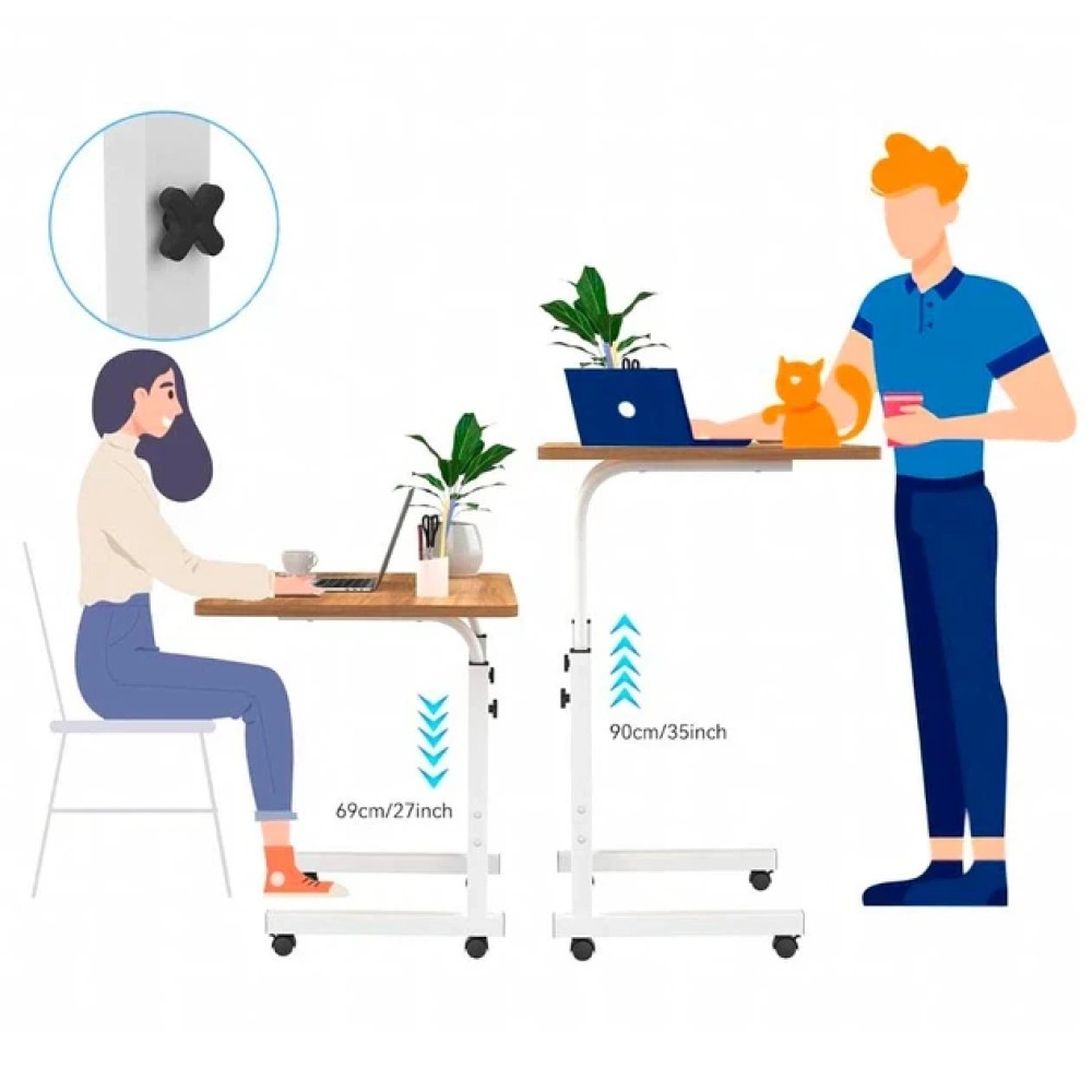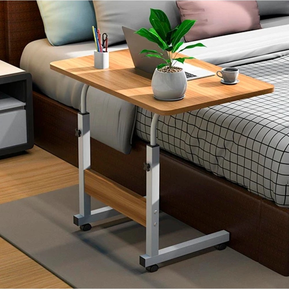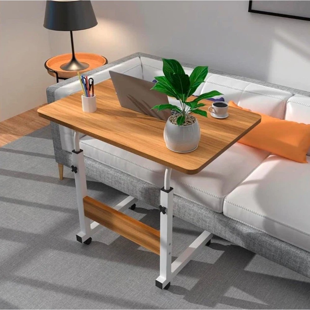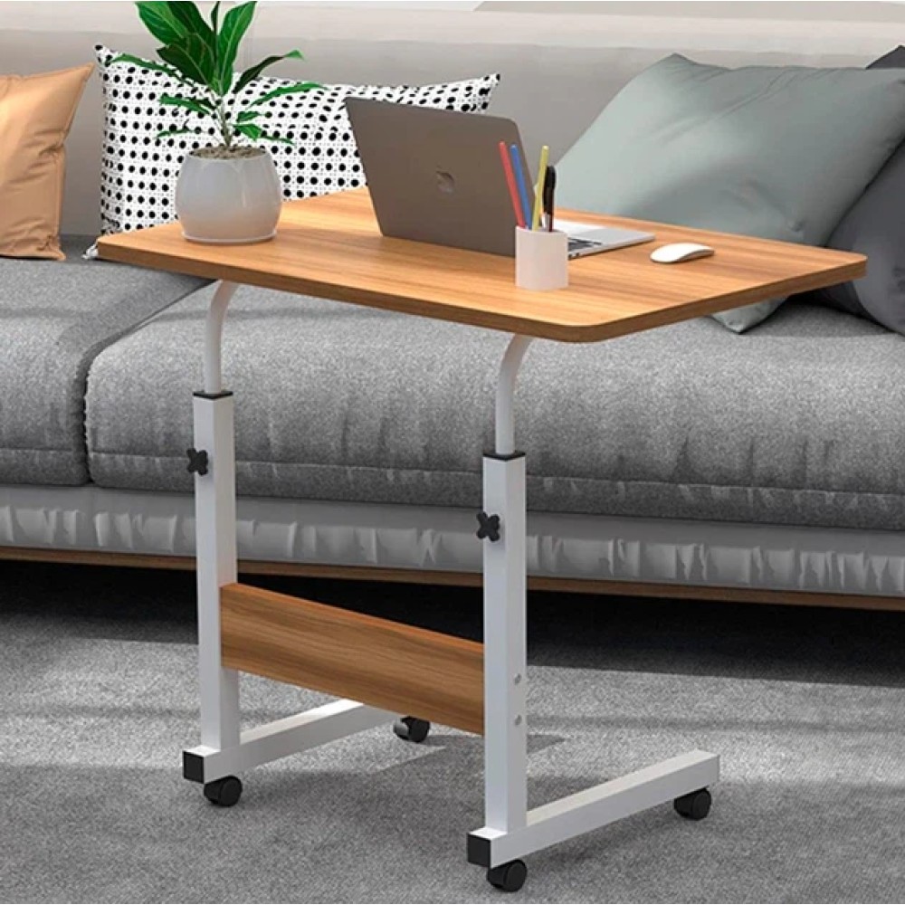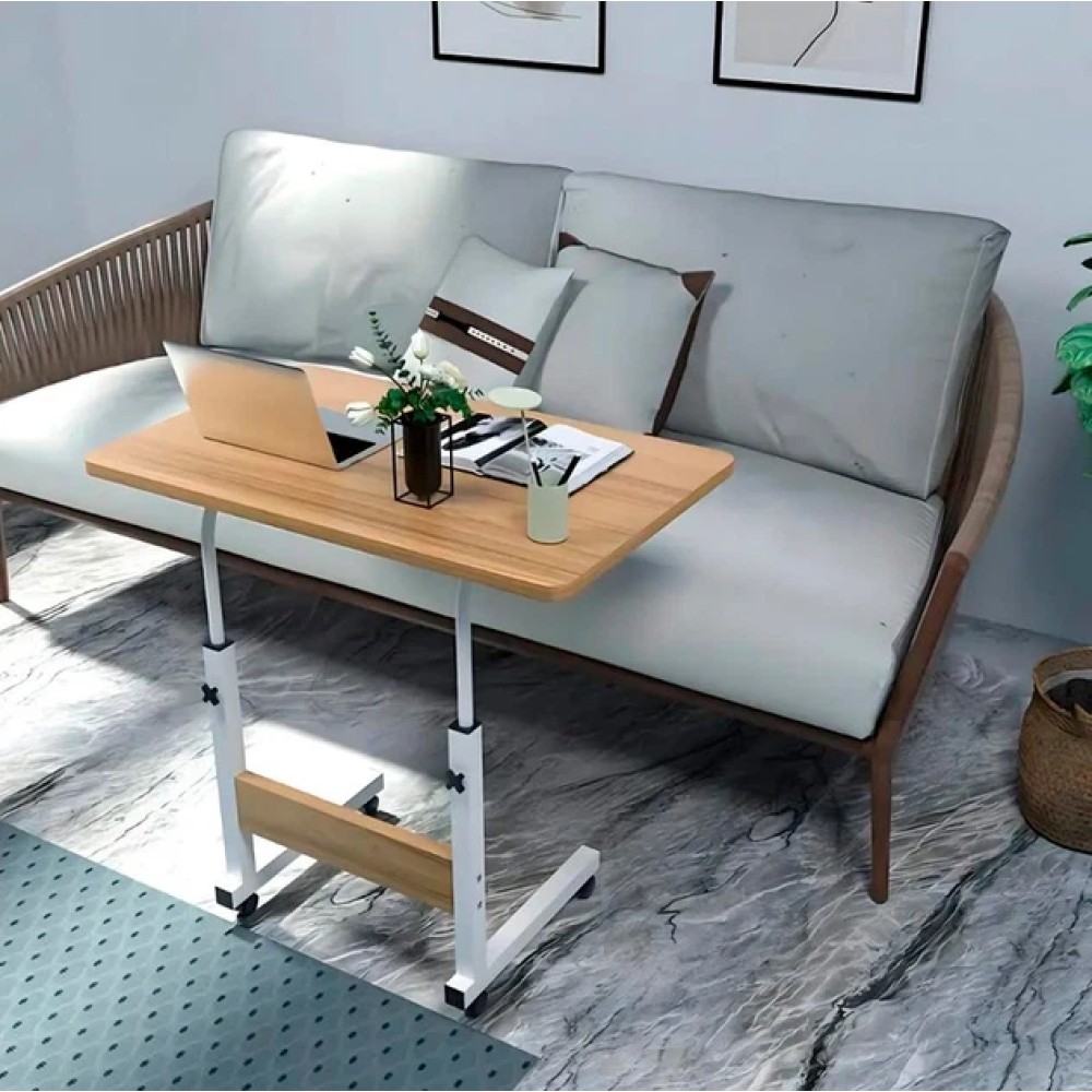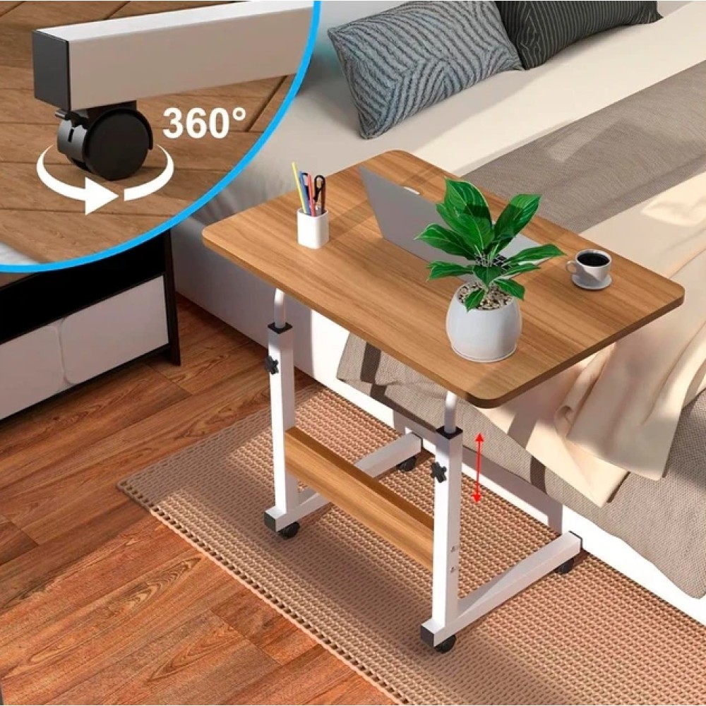 Мобільний комп'ютерний столик — це універсальний приставний стіл для роботи з ноутбуком, навчання, читання або приймання їжі. Конструкція дає змогу зручно заїжджати столиком під ліжко або диван, що робить його практичним рішенням для спальні, вітальні або робочого простору. Стіл обладнаний колесами з фіксаторами, завдяки чому його легко переміщати кімнатою й надійно закріплювати в потрібному положенні. Конструкція й особливості Формат: приставний столик (П-подібна конструкція) Регулювання висоти від 69 до 90 см Розмір стільниці: 40 × 60 см Матеріал каркаса: метал Матеріал стільниці: дерев'яна / МДФ із деревною текстурою Колеса: 4 колеса з фіксаторами (гальмами) Телескопічні опори дають змогу налаштувати висоту столу під ліжко, диван або робоче крісло. Використання Столик підходить для: роботи з ноутбуком навчання та читання приема пищи використання вдома або в офісі Завдяки коліс стіл можна легко підкотити впритул до користувача та зафіксувати. Переваги формату Регульована висота під різні завдання Мобільність і простота переміщення Фіксатори коліс для стійкості Компактна, але зручна робоча поверхня Підходить для використання біля ліжка та дивана Характеристики Тип: мобільний комп'ютерний/приставний стіл Розмір стільниці: 40 × 60 см Висота: регульована, 69-90 см Каркас: метал Стільниця: МДФ із дерев'яною текстурою Колеса: 4 шт., з фіксаторами Стан: новий