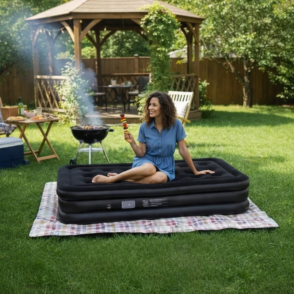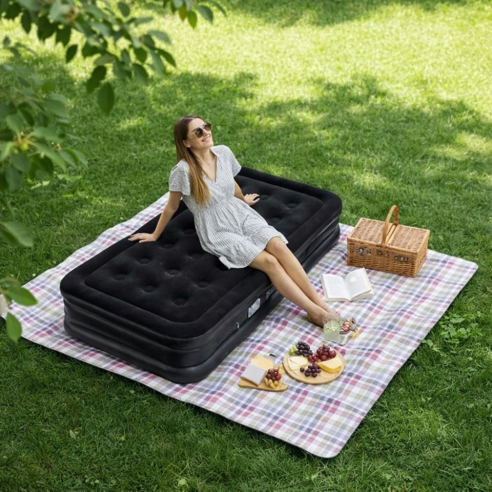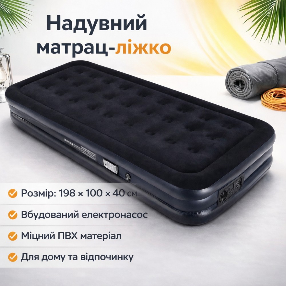 Опис Надувний матрац-ліжко AND LY-1128 розміром 198×100×40 см являє собою зручне спальне місце, яке підходить для відпочинку вдома, на дачі, у поїздках і на природі. Матрац виготовлений із міцного ПВХ-матеріалу, стійкого до стирання та механічних навантажень. Вбудований насос дає змогу швидко надути та здути виріб без додаткових пристроїв. Матрац-ліжко забезпечує стабільну опору для тіла та комфортний відпочинок завдяки оптимальній висоті та щільності матеріалу. Виріб легко складається й займає мінімальне місце в складеному вигляді, що робить його зручним для транспортування і зберігання. Переваги Міцний матеріал, стійкий до зношування Швидко надувається і здувається Велика поверхня для комфортного відпочинку Підходить для використання вдома та на природі Характеристики Тип: надувний матрац-ліжко Розмір: 198×100×40 см Матеріал: міцний ПВХ Цвет: темно-синій Вбудований насос: є Сфера використання: дім, дача, відпочинок на природі Комплектація Надувний матрац-ліжко Вбудований насос Ремкомплект Інструкція з експлуатації