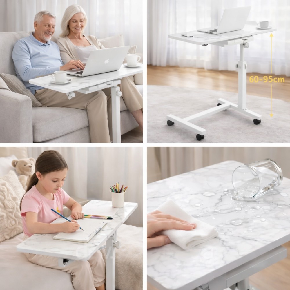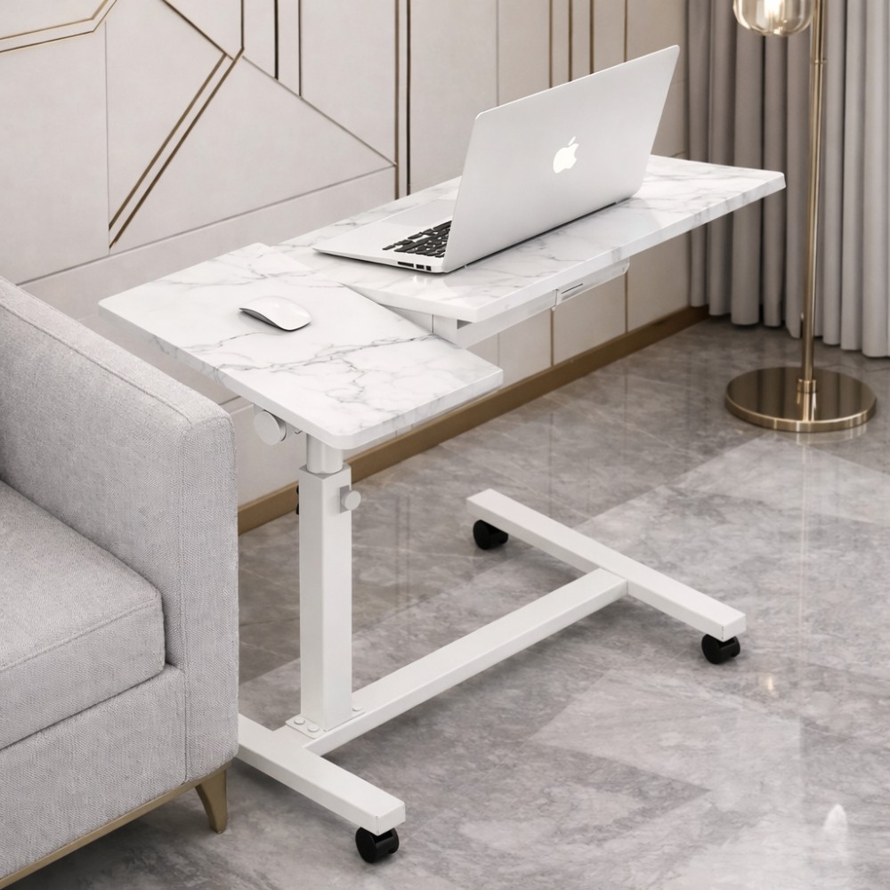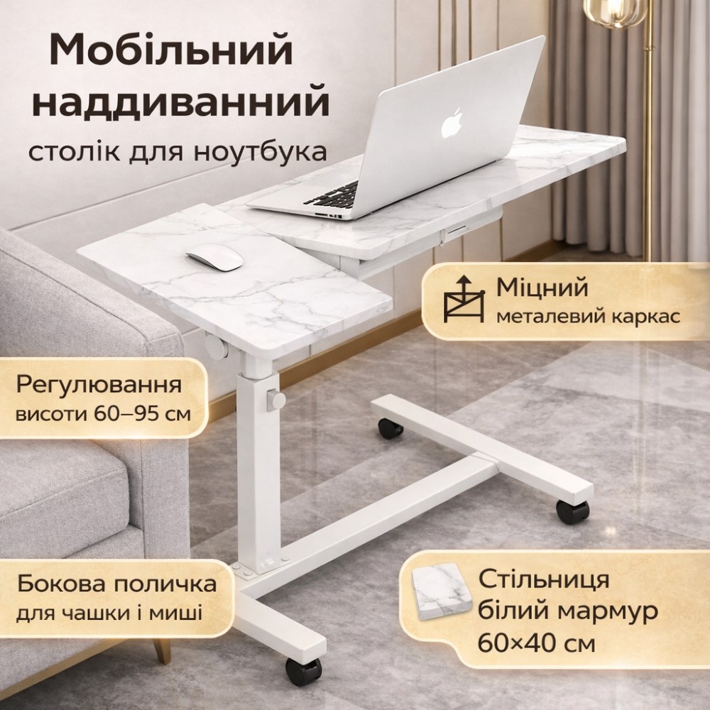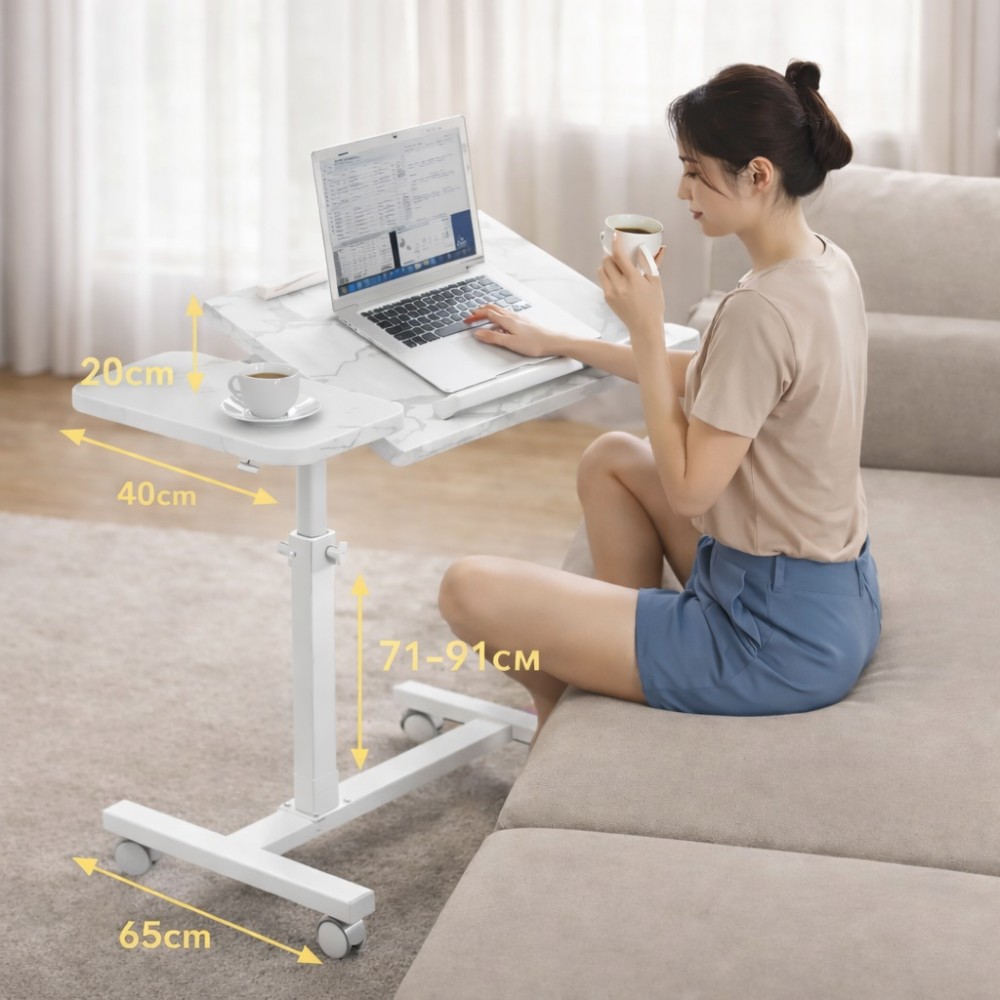 Наддаваний столик DASH-64200 — мобільний стіл для роботи з ноутбуком удома, призначений для використання поруч із диваном, кріслом або ліжком. Конструкція та матеріали Основна стільниця: ДСП із мармуровим візерунком, розмір 60×40 см Додаткова бічна полиця: для миші, чашки або аксесуарів Каркас: металевий, пофарбований у білий колір Основа: П-подібна конструкція для заїзду під диван Колеса: 4 поворотні колеса для вільного переміщення Регулювання Регулювання висоти в діапазоні 60-95 см Дає змогу налаштувати стіл під висоту дивана, крісла або положення сидячи на підлозі. Використання Столик підходить для: роботи за ноутбуком удома віддаленої роботи поруч із диваном навчання та занять для дорослих і дітей використання з напоями та канцелярією Бічна полиця розширює робочий простір і дає змогу розділити зони: ноутбук — окремо, миша або чашка — окремо. Дизайн Світла мармурова стільниця в поєднанні з білим металевим каркасом робить столик нейтральним і відповідним для сучасних інтер'єрів: вітальня, спальня, кабінет. Характеристики Модель: DASH-64200 Тип: наддувний столик для ноутбука Матеріали: метал, ДСП Розмір стільниці: 60×40 см Додаткова полиця: ~20 см Регулювання висоти: 60-95 см Ширина основи: 65 см Кількість коліс: 4 Колір: білий / мармур Комплектація Надяганий столик DASH-64200 Технічне паковання