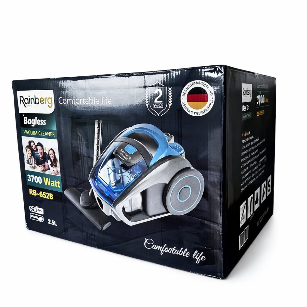 Контейнерний циклонний пилосос Rainberg RB-652B призначений для сухого прибирання житлових приміщень без використання мішків для збирання пилу. Весь пил і сміття збираються у знімний пластиковий контейнер об'ємом 2,5 літра, який легко очищається після завершення прибирання. Модель обладнана потужним електродвигуном 3700 Вт із силою всмоктування 600 Вт, що дає змогу ефективно прибирати пил, дрібне сміття та шерсть хатніх тварин із твердих підлогових покриттів і килимів. Циклонна система фільтрації забезпечує стабільну тягу навіть у разі заповнення контейнера. Для очищення вихідного повітря використовується HEPA-фільтр, що затримує дрібні частинки пилу. Регулятор потужності, розташований на корпусі, дає змогу адаптувати роботу пилососа під різні типи поверхонь. Пилосос обладнаний металевою телескопічною трубою, гнучким шлангом із поворотом 360°, а також системою автоматичного змотування мережевого кабелю завдовжки 3 метри. Конструкція корпусу забезпечує зручне переміщення під час прибирання. Характеристики: Тип: контейнерний пилосос без мішка Модель: Rainberg RB-652B Потужність двигуна: 3700 Вт Потужність всмоктування: 600 Вт Об'єм контейнера: 2,5 л Фільтрування: HEPA Регулювання потужності: на корпусі Тип прибирання: суха Живлення: 220 В / 50 Гц Довжина шнура: 3 м Матеріал труби: метал Колір: синій Комплектація Пилосос Rainberg RB-652B Гнучкий шланг Металева труба Насадка для підлоги та килимів Щілинна насадка Контейнер для пилу Інструкція Паковання