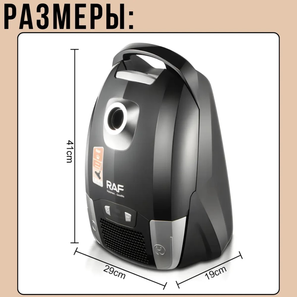 Побутовий пилосос з телескопічною трубою й автозмотуванням шнура RAF R.8702B 1700W Побутовий пилосос RAF R.8702B призначений для ефективного сухого прибирання у квартирі або будинку. Потужність 1600-1700 Вт забезпечує високу силу всмоктування, даючи змогу швидко видаляти пил, сміття та шерсть тварин із різних поверхонь. Місткий пилозбірник об'ємом 3,5 літра підходить для прибирання великих приміщень без частого очищення, а мішок, що миється, знижує витрати на обслуговування. Пилосос обладнаний телескопічною трубою, яка регулюється за довжиною і полегшує прибирання важкодоступних місць. Автоматичне змотування кабелю спрощує зберігання пристрою, а індикатор роботи дає змогу контролювати його стан. До комплекту входять універсальна та щілинна насадки, що робить модель зручною для щоденного використання в побуті. Переваги: Висока потужність: забезпечує ефективне всмоктування пилу та сміття Великий мішок: об'єм 3,5 л підходить для тривалого прибирання Телескопічна труба: регулювання довжини під зріст користувача Автозмотування шнура: спрощує зберігання після прибирання Індикатор роботи: візуальний контроль увімкнення пилососа Універсальна насадка: підходить для підлоги та килимів Щілинна насадка: зручна для кутів і вузьких місць Характеристики: Тип пристрою: побутовий пилосос Тип прибирання: суха Потужність: 1600-1700 Вт Об'єм пилозбірника: 3,5 л Тип мішка: багаторазовий мішок, що миється Напруга живлення: 230 В Частота: 50 Гц Щілинна насадка: є Тип труби: телескопічна Матеріал труби: метал Автозмотування кабелю: є Індикатор роботи: є Колір корпусу: чорний Розміри: 41×29×19 см