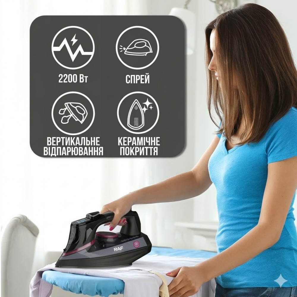 Праска парова з вертикальним відпарюванням і керамічною підошвою RAF R.1195R Праска RAF R.1195R призначений для ефективного та комфортного прасування повсякденного одягу та текстилю. Потужність 2200 Вт забезпечує швидке нагрівання та стабільну роботу, даючи змогу легко справлятися зі щільними та пересушеними тканинами. Керамічна підошва забезпечує плавне ковзання по матеріалу, рівномірно розподіляючи тепло та знижуючи ризик пошкодження волокон. Модель обладнана функцією подавання пари, паровим ударом і вертикальним відпарюванням, що робить праску зручною не тільки для прасування на дошці, але й для освіження одягу на вішалці, штор і делікатних виробів. Вбудований резервуар для води об'ємом 300 мл дає змогу працювати без частих дозаправок. Для безпечного та тривалого використання передбачені автоматичне вимкнення, захист від накипу, система самоочищення та протикраплинна система. Регулятори розташовані на корпусі, що забезпечує простий і швидкий контроль усіх функцій у процесі прасування. Переваги: Потужність 2200 Вт для швидкого нагрівання й ефективного прасування Керамічна підошва з гарним ковзанням Подавання пари та паровий удар для щільних складок Вертикальне відпарювання для одягу та штор Функція розбризкування для додаткового зволоження тканини Автоматичне вимкнення для підвищення безпеки Захист від накипу та система самоочищення Протикрапельна система для акуратного прасування Зручне кульове кріплення мережевого кабелю Характеристики: Тип пристрою: електрична праска Потужність: 2200 Вт Дорожній: немає Матеріал підошви: кераміка Регулювання подавання пари: да Функція відпарювання: да Паровий удар: да Вертикальне відпарювання: да Функція розбризкування (спрей): да Об'єм резервуара для води: 300 мл Автоматичне вимкнення: да Захист від накипу: да Система самоочищення да Протикрапельна система: да Бездротове використання: немає Мережевий кабель: кульове кріплення до корпусу Довжина шнура: 1,8 м Індикатор готовності до роботи: да Розміщення регулятора: на корпусе Автоматичне змотування шнура: немає Розмір: 30 х 10 х 12 см