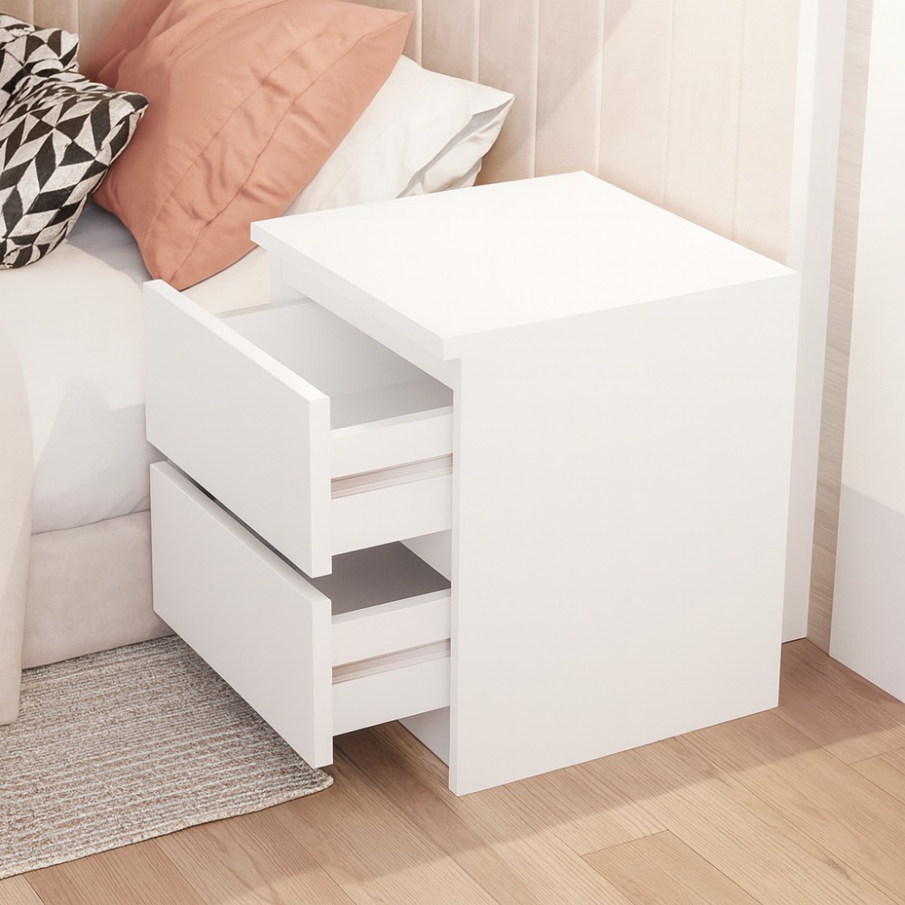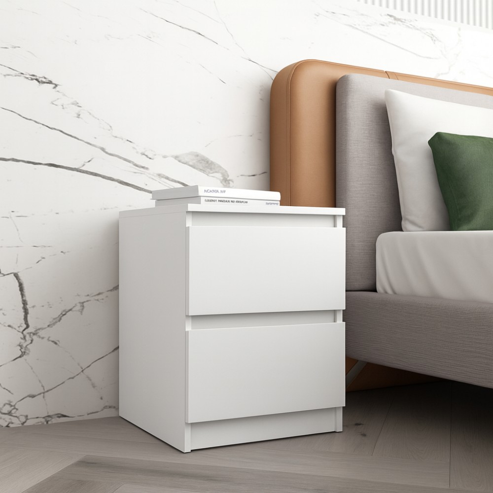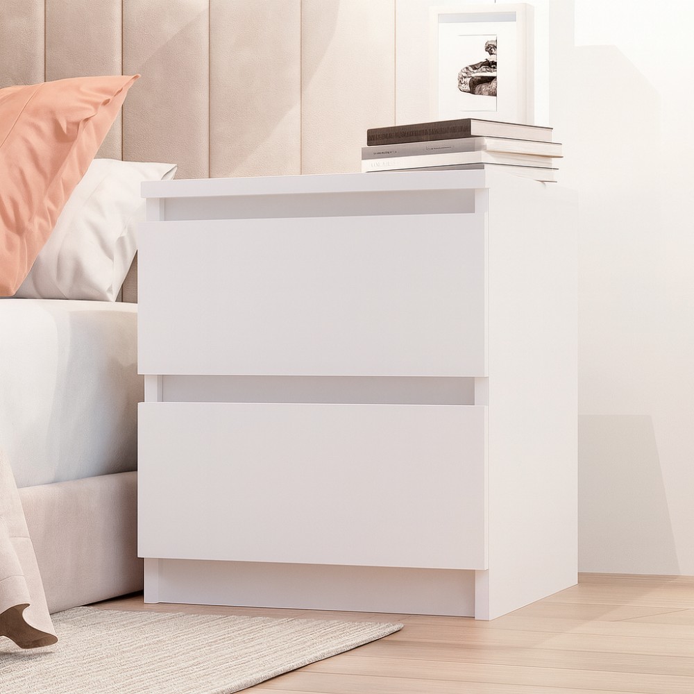 Опис товару Приліжкова тумба без ручок — практичне й акуратне рішення для спальні в сучасному стилі. Компактні розміри дають змогу розмістити її навіть у невеликій кімнаті, а дві шухляди забезпечують зручне зберігання потрібних речей поруч із ліжком. Ключові переваги — Сучасний мінімалістичний дизайн без ручок – Універсальний білий колір, легко поєднується з інтер'єром — Дві місткі шухляди — Компактні розміри — підходить для невеликих спалень – Гладкі фасади, що візуально створюють відчуття порядку — Зручне розміщення поруч із ліжком або диваном Технічні характеристики – Тип виробу: приліжкова тумба – Конструкція: підлогова — Кількість ящиків: 2 – Тип фасадів: без ручок – Матеріал корпусу: ДСП – Матеріал фасадів: ДСП – Колір: білий – Ширина: 32 см – Глибина: 30 см – Висота: 41 см – Стиль: сучасний/мінмалізм Комплектація – Приліжкова тумба – Комплект кріплень – Інструкція зі збирання