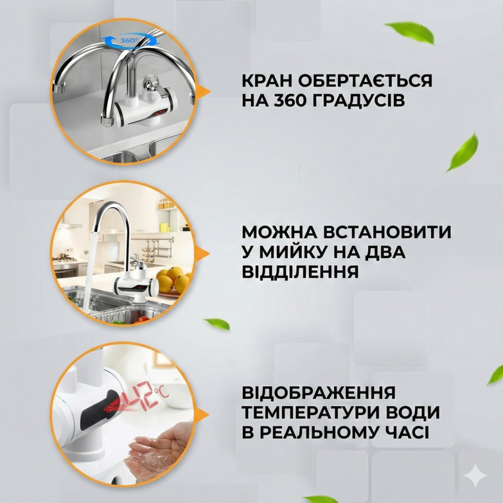 Електричний проточний водонагрівач FM227 призначений для швидкого нагрівання проточної води в умовах кухні або ванної кімнати. Прилад встановлюється замість стандартного змішувача та під'єднується до побутової електромережі. Пристрій починає подавання гарячої води через 2-3 секунди після вмикання, усуваючи потребу очікування. Температура нагрівання регулюється поворотом ручки та виводиться на вбудованому цифровому LCD-дисплеї для точного контролю. Корпус виготовлений із термостійкого пластику та металу, а поворотна конструкція крана дає змогу використовувати його в мийках з однією або двома чашами. Переваги Нагрівання води до 60 °C упродовж декількох секунд Вбудований LCD-дисплей для індикації температури Економія води й електроенергії, порівнюючи з накопичувальними бойлерами Простий монтаж, що не вимагає спеціальних навичок або складного обладнання Компактні габарити, що неабияк економлять місце під мийкою Сучасний естетичний зовнішній вигляд Характеристики Модель: FM227 Тип водонагрівача: Кран із підігріванням води Тип водонагрівача: Проточний Потужність: 3 кВт Напруга мережі: 220–240 В Підводка: бічна Способ нагрева: Електричний Спосіб встановлення: Вбудований Форма водонагрівача: Циліндрична Керування: Механічне Комплектація Електричний проточний кран-водонагрівач FM227