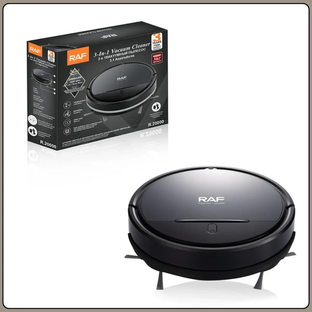 Робот-пилосос для сухого прибирання з контейнером 1200 мл RAF R.20000 2000 мА·год Робот-пилосос RAF R.20000 призначений для автоматичного сухого прибирання приміщень і підходить для щоденного підтримання чистоти в будинку або квартирі. Компактний корпус заввишки всього 8 см дає пристрою легко заїжджати під меблі, ліжка та шафи, ефективно збираючи пил і дрібне сміття з твердих покриттів і килимів із невисоким ворсом. Пластиковий корпус стійкий до подряпин і розрахований на регулярну експлуатацію. Модель обладнана акумулятором ємністю 2000 мА·год, який забезпечує стабільну роботу без під'єднання до мережі. Контейнерний пилозбірник великого обсягу спрощує обслуговування й не вимагає використання мішків. Робот-пилосос автоматично здійснює прибирання, знижуючи потребу ручної праці та заощаджуючи час користувача. Переваги: Автоматичне прибирання: виконує сухе очищення підлоги без участі користувача Компактна висота: легко заїжджає під меблі та у важкодоступні зони Контейнерний мішок: не вимагає купівлі змінних мішків Великий об'єм контейнера: рідше потрібне очищення пилозбірника Достатня потужність всмоктування: ефективно збирає пил і дрібне сміття Акумуляторне живлення: працює без дротів і обмежень щодо розміщення Швидке заряджання: повний заряд приблизно за 3 години Характеристики: Тип пристрою: робот-пилосос Модель: RAF R.20000 Тип прибирання: суха Потужність всмоктування: 600-800 Па Тип мішка: контейнерний без мішка Об'єм пилозбірника: 1200 мл Напруга живлення: 220-240 В Частота: 50-60 Гц Ємність акумулятора: 2000 мА·год Час заряджання: приблизно 3 години Матеріал корпусу: пластик Колір корпусу: чорний Розміри: 32×8×32 см