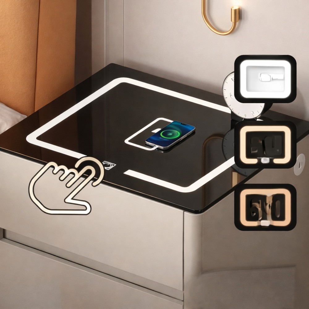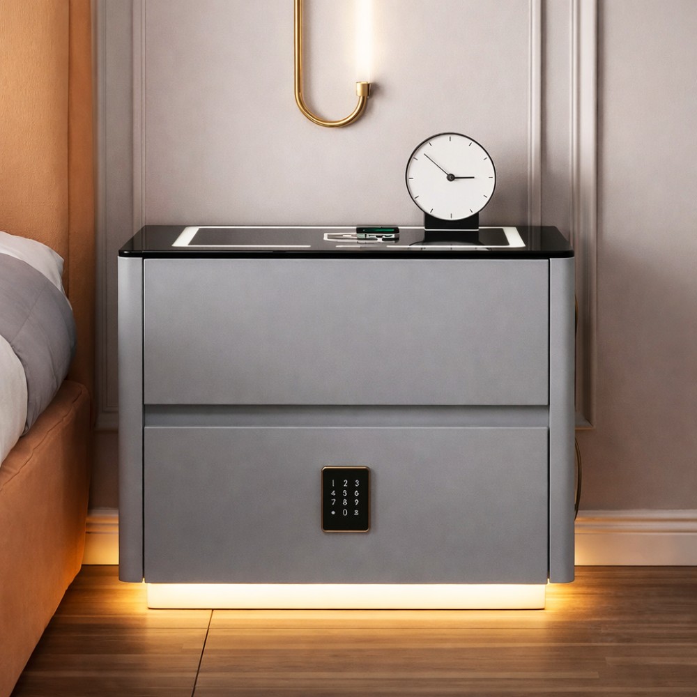 Багатофункціональна смарт-тумба QYJXF02 з вбудованим сейфом Підлогова приліжкова тумба, яка поєднує в собі надійний сейф для особистих речей, станцію для заряджання ґаджетів і локальне освітлення. Що входить до комплекту: Смарт-тумба в зборі (1 шт.) Заводське паковання Конструкція та матеріали: Зовнішнє оздоблення (екошкіра): Корпус обтягнутий зносостійкою сірою екошкірою. Вона захищає меблі від потертостей, пом'якшує кути та легко очищається від пилу. Система зберігання й безпека: Тумба обладнана вбудованим прихованим сейфом з електронним кодовим замком на фасаді. Дає змогу надійно зберігати документи, готівку або інші цінні речі прямо біля ліжка. Додатково є звичайне відділення для дрібниць. Електронний функціонал: Заряджання пристроїв (бездротова + USB): На верхній скляній панелі розташована зона для бездротового заряджання смартфонів. На бічній панелі передбачені USB-порти для під'єднання дротів. Сенсорна LED-підсвітка: Вбудоване контурне світло керується за допомогою сенсорної панелі на стільниці. Зручно використовувати як нічник Мультимедіа (Bluetooth): Вбудований збоку динамік дає змогу під'єднувати телефон через Bluetooth і слухати музику або подкасти безпосередньо через тумбу.