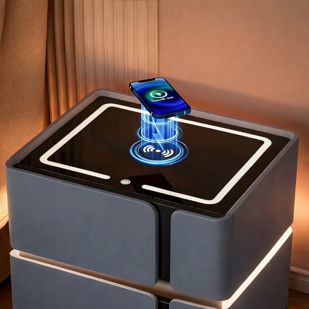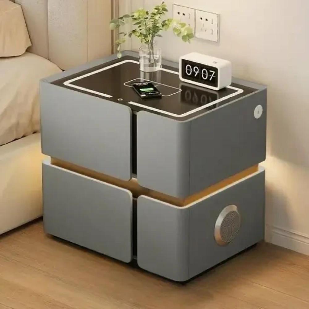 Багатофункціональна смарт-тумба SZXF01 для спальні Підлогова приліжкова тумба, яка об'єднує систему зберігання, локальне освітлення й станцію для заряджання ґаджетів із мультимедіа. Призначена для встановлення біля ліжка. Що входить до комплекту: Розумна тумба в зборі (1 шт.) Заводське паковання (1 шт.) Матеріали та конструкція: Каркас (МДФ): Формує жорстку прямокутну базу, що забезпечує стійкість меблів на підлозі. Зовнішнє оздоблення (екошкіра): Корпус повністю обтягнутий зносостійкою екошкірою сірого кольору. Матеріал пом'якшує кути, не вбирає вологу та легко очищається від пилу вологою серветкою. Зберігання (2 ящики): Дві місткі шухляди призначені для прихованого зберігання особистих речей, книг або дротів. Електронний функціонал (інтегрований у корпус): Сенсорна LED-підсвітка: Світловий контур вбудований у верхню панель. Включається дотиком і замінює класичну настільну лампу в нічну пору. Bluetooth динамік: Акустична система виведена на бічну панель. Дає змогу синхронізувати смартфон і виводити звук (музику, аудіокниги) безпосередньо через тумбу. Заряджання пристроїв (USB): Вбудовані порти на бічній панелі й інтегрована зона на скляній стільниці дають змогу заряджати смартфони та планшети прямо біля ліжка без використання подовжувачів.