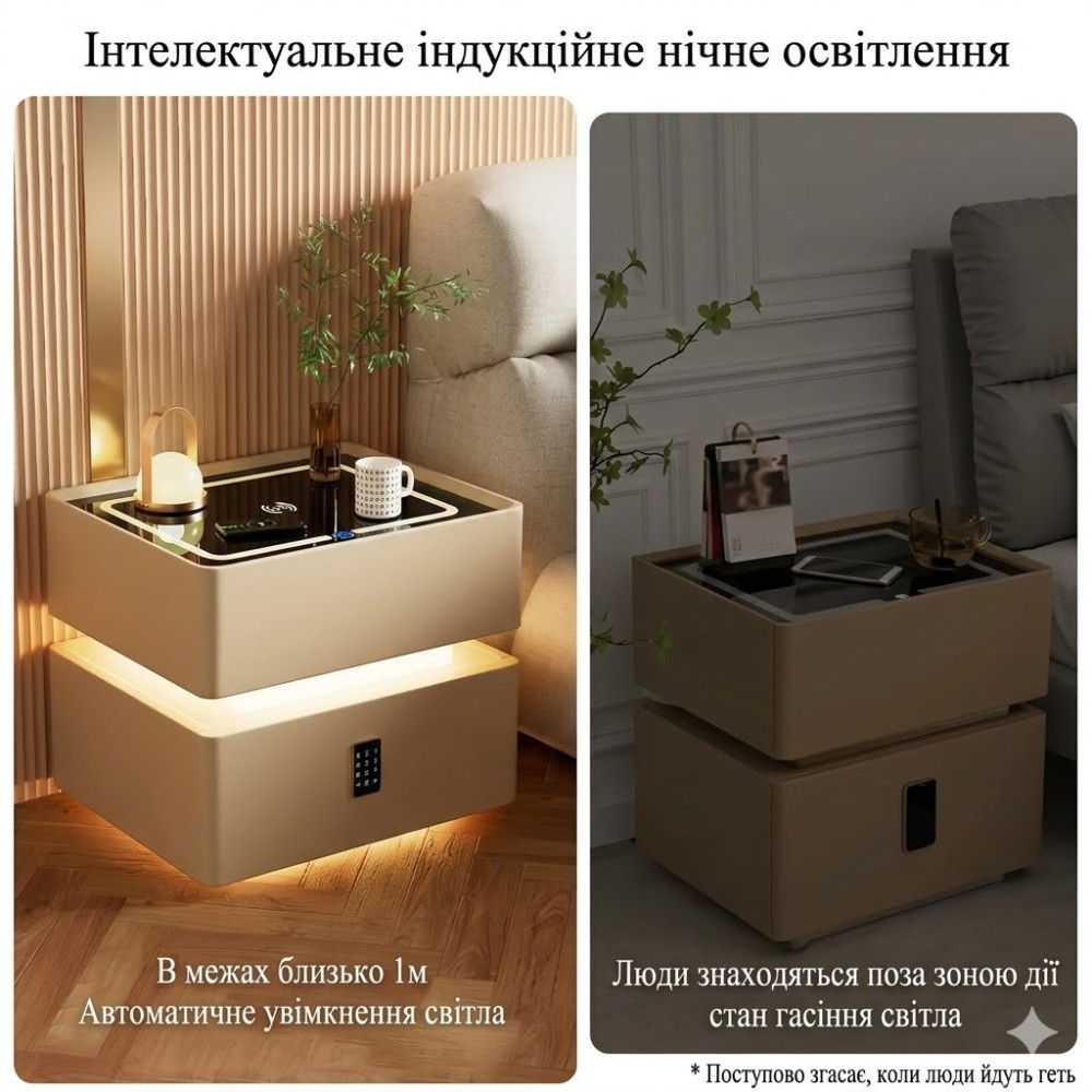 Інноваційна смарт-тумба 8001 з вбудованим сейфом і мультимедіа Підлогова тумба преміумкласу з дворівневим дизайном. Об'єднує в собі надійний сейф, станцію для заряджання ґаджетів і акустичну систему. Що входить до комплекту: Смарт-тумба в зборі (1 шт.) Заводське паковання Матеріали та конструкція: Зовнішнє оздоблення (екошкіра): Корпус повністю обтягнутий зносостійкою екошкірою (доступна в білому та сірому кольорі). Покриття захищає меблі від потертостей, легко очищається від пилу та пом'якшує кути. Стільниця (скло): Верхня панель виготовлена з міцного глянсового скла, на якому розташовані сенсорні елементи керування й зона заряджання. Система зберігання (2 секції): 1. Верхній висувний ящик — для зручного зберігання повсякденних дрібниць (книг, окулярів, кабелів). 2. Вбудований сейф (нижній блок) — обладнаний електронним кодовим замком на фасаді. Гарантує безпечне зберігання цінних речей, документів і готівок прямо біля ліжка. Електронний функціонал: Заряджання пристроїв (бездротова + USB): На скляній стільниці передбачена вбудована зона для бездротового заряджання смартфонів. На бічній панелі розміщені класичні USB-порти для дротового під'єднання. Багаторівнева LED-підсвітка: Керується сенсорними кнопками. Освітлює три зони: контур на стільниці, центральну відкриту нішу та нижню основу тумби. Ідеально замінює нічний світильник. Мультимедіа (Bluetooth): Інтегрований бічний динамік дає змогу під'єднувати смартфон через Bluetooth і виводити звук (музику, аудіокниги, подкасти) безпосередньо через тумбу.