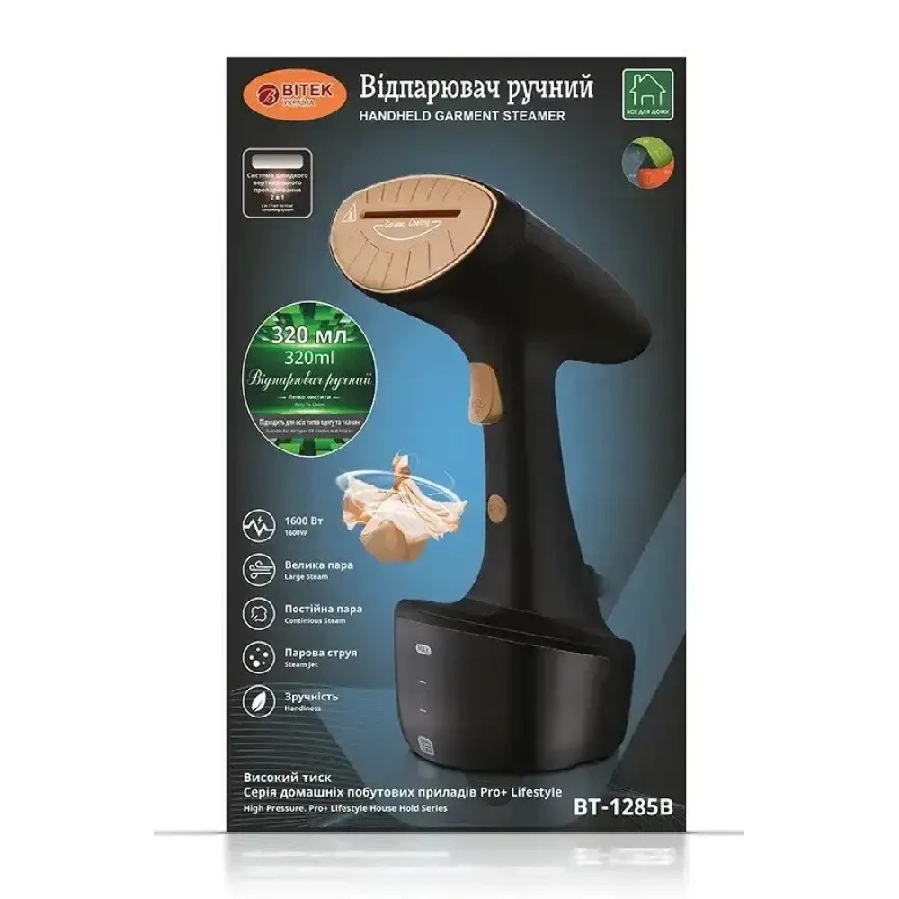 Ручний відпарювач 320 мл для прасування одягу Bitek BT-1285В 1600Вт Чорний Ручний відпарювач Bitek BT-1285B — це зручний і багатофункціональний пристрій для швидкого та якісного розпрасовування одягу, текстилю та інших тканинних виробів. Він ідеально підходить для догляду за речами без використання прасувальної дошки, даючи змогу прасувати одяг прямо на вішалці. Завдяки високій потужності 1600 Вт і інтенсивне подавання пари 30 г/хв, відпарювач ефективно справляється навіть зі щільними тканинами, а температура пари 98 °C допомагає не тільки розпрасовувати складки, а й усувати неприємні запахи, а також знищувати до 99,9% бактерій. Пристрій обладнаний знімним резервуаром для води об'ємом 320 мл, який забезпечує до 60 хвилин безперервної роботи без потреби дозаправляння. Якщо потрібний більший час роботи, можна використовувати місткість більшого обсягу. Відпарювач зручно використовувати не тільки для одягу, але й для догляду за шторами, меблями, постільною білизною і навіть килимовими покриттями. До комплекту входять спеціальні насадки, зокрема м'яка щітка для видалення ворсу. Компактний дизайн, складана ручка та легка вага роблять прилад зручним для зберігання і транспортування. Переваги: Швидке й ефективне відпарювання — висока потужність і подавання пари 30 г/хв згладжують складки на будь-яких тканинах. Дезінфекція й усунення запахів — гаряча пара знищує до 99,9% бактерій і освіжає одяг, усуваючи запахи сигарет, їжі та поту. Зручність використання — можна прасувати речі прямо на вішалці, не використовуючи прасувальну дошку. Підходить для всіх типів тканин — від ніжного шовку до щільного драпа та кашеміру. Знімний резервуар — об'єм 320 мл забезпечує до 60 хвилин роботи, а за потреби можна під'єднати місткість більшого обсягу. Додаткові насадки — у комплекті йде щітка для видалення ворсу та захисна насадка. Безпека — захист від перегрівання, індикатори нагрівання та рівня води, терморегулятор. Компактність і мобільність — легкий корпус, складана ручка та зручна довжина шнура 1,8 м роблять пристрій ідеальним для подорожей. Характеристики: Бренд: Bitek Модель: BT-1285B Тип: Ручний відпарювач Тип керування: Механічний Потужність: 1600 Вт Регулятор витрати пари: На корпусі Напруга: AC 220-240 В, 50-60 Гц Живлення: От сети Максимальне подавання пари: 30 г/хв Температура пари: 98 °C Місткість резервуара для води: 320 мл Можливість під'єднання ємності більшого об'єму: Да Час нагрівання до утворення пари: 25 сек Час безперервної роботи без доливання води: До 60 хвилин Кількість режимів роботи: 2 Матеріал підошви: Неіржавка сталь Матеріал корпусу: Пластик Захист від перегрівання: Є Індикатор нагрівання: Є Індикатор роботи: Є Терморегулятор: Є Індикатор низького рівня води: Є Паркування: Вертикальна Довжина кабелю живлення: 1,8 м Розміри: 27×8×10 см Вага: 1,25 кг Комплектація Відпарювач Bitek BT-1285B Насадка-щітка Захисна насадка-щітка Інструкція з експлуатації Мірний стакан Заводське паковання