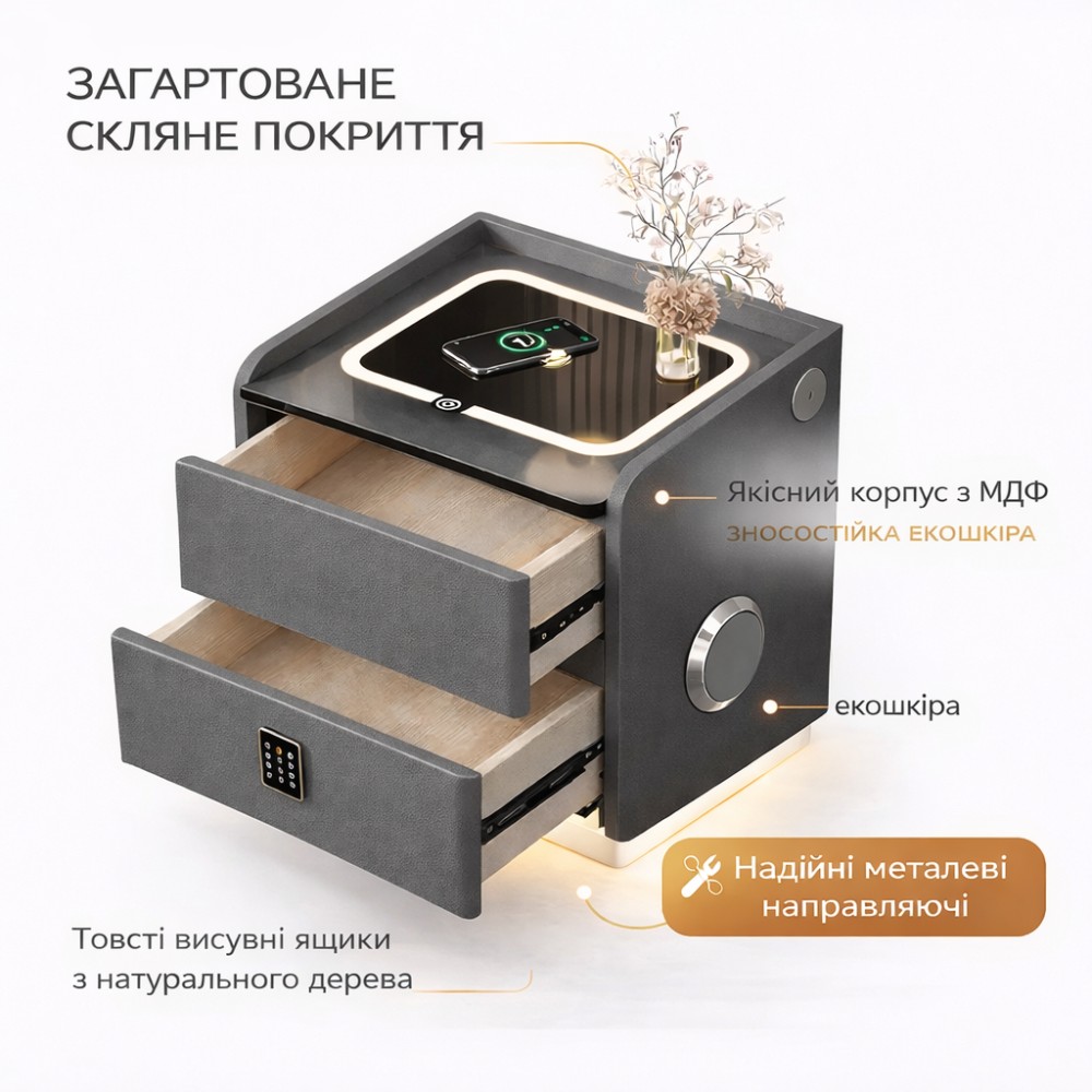 Смарт-тумба YJXF01 — це поєднання преміального дизайну, безпеки та сучасних технологій у вашій спальні. Ця модель має унікальну дворівневу конструкцію з відкритою нішею та вбудованим сейфом, що робить її не просто меблями, а справжньою мультимедійною станцією 3-в-1. Основні переваги та функціонал: Надійний сейф: Нижній блок тумби оснащений повноцінним сейфом із електронним кодовим замком на передній панелі для безпечного зберігання документів та цінних речей. Розумна зарядка: Стільниця із загартованого скла підтримує швидку бездротову зарядку смартфонів. Також на бічній панелі передбачені порти USB та Type-C для заряджання кількох пристроїв одночасно. Мультимедіа: Вбудована Bluetooth-колонка дозволяє відтворювати музику або аудіокниги безпосередньо з вашого телефону з якісним звучанням. Розумне підсвічування: Тумба має три режими освітлення (білий, теплий білий, теплий жовтий), що регулюються сенсорною кнопкою. Передбачено датчик руху: світло вмикається автоматично, коли ви підходите до тумби на відстань до 1 метра, і плавно гасне, коли ви йдете. Преміальні матеріали: Корпус обтягнутий високоякісною екошкірою («котяча лапка»), яка відштовхує воду, стійка до подряпин та легко очищується. Стільниця виготовлена з термостійкого загартованого скла, що не залишає відбитків. Характеристики: Модель: YJXF01 Матеріали: Екошкіра, загартоване скло, метал. Кольори в наявності: Графітовий сірий (Grey). Особливості: Сейф, Bluetooth, Бездротове заряджання, Датчик руху, USB-порти. Ця тумба стане ідеальним доповненням сучасного інтер'єру, забезпечуючи максимальний комфорт та приватність.