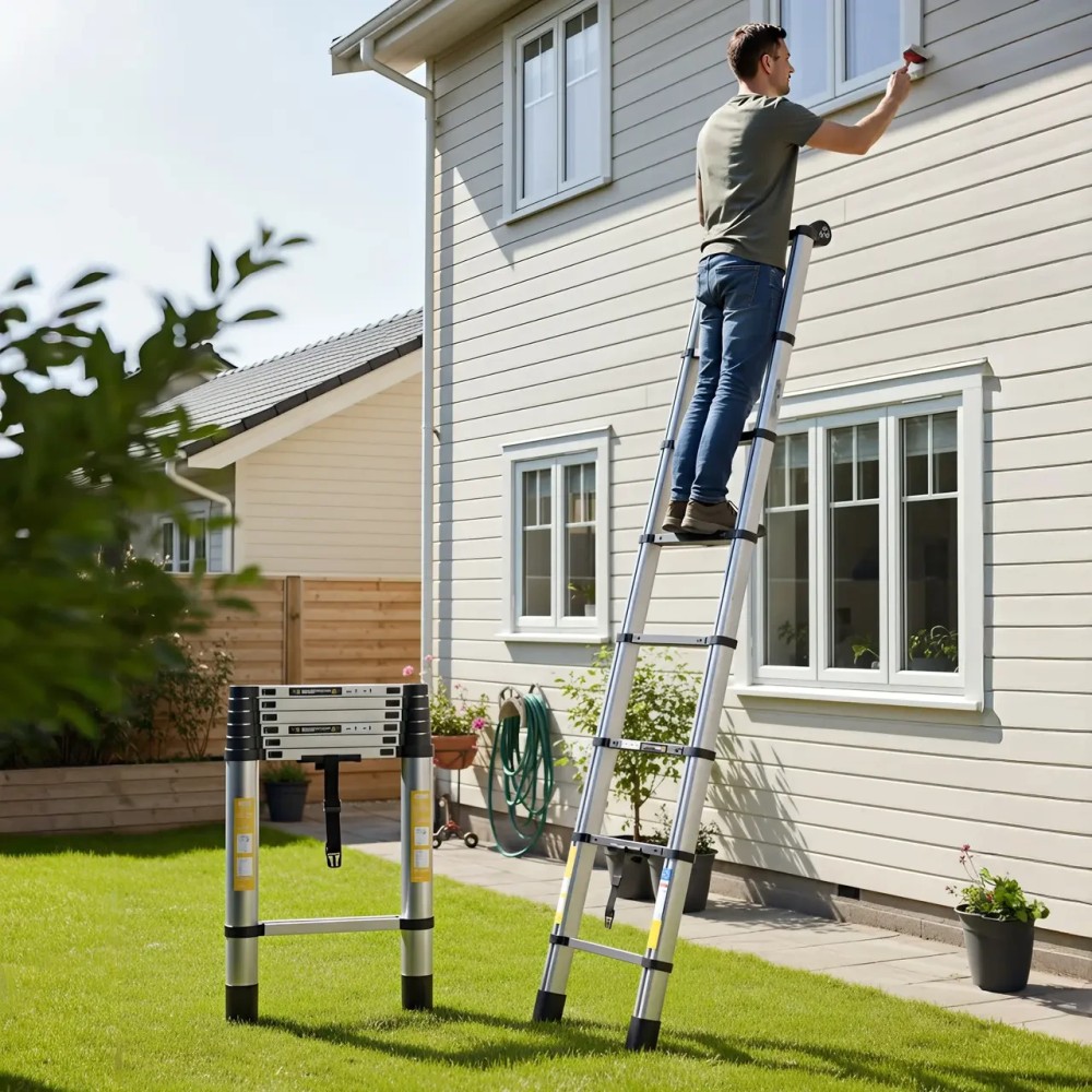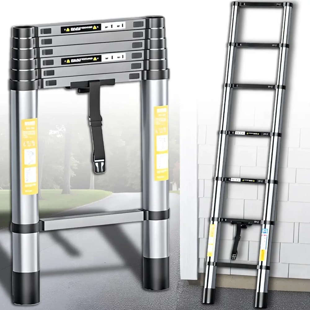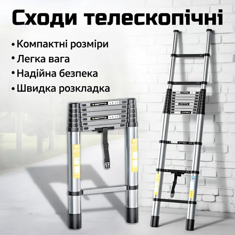 Опис Компактна телескопічна драбина заввишки 2.7 м із міцної хромомолібденової сталі. Швидко розкладається і складається за секунди, регулюється за висотою. Ідеальна для квартири, дому, дачі, ремонту, монтажу та побутових робіт. У складеному вигляді займає мінімум місця (78×45 см), легко поміщається в багажник авто або комору. Протиковзні рифлені щаблі та наконечники гарантують максимальну безпеку та стійкість. Надійна фіксація на будь-якій висоті, витримує до 150 кг. У комплекті зручний ремінець для перенесення та фіксації.Преімучества Миттєве розкладання і складання за кілька секунд Регульована висота для точного припасування під завдання Міцний матеріал — хромомолібденова сталь, стійкий до корозії та навантажень Максимальне навантаження 150 кг — підходить для побутового та напівпрофесійного використання Рифлені протиковзні щаблі + нековзні наконечники для повної безпеки Дуже компактна в складеному вигляді — поміщається в багажник або комору Зручний ремінець для перенесення та фіксації в складеному стані Універсальність — будинок, дача, офіс, монтаж, ремонт Характеристики Тип: телескопічна, приставна (пряма) Висота в розкладеному вигляді: 2.7 м Висота досягнення (робоча): 3.81 м Кількість щаблів: 7 Відстань між щаблями: ≈ 30 см Матеріал: хромомолібденова сталь Максимальне навантаження: 150 кг Вага: ≈ 6.25 кг Розмір у складеному вигляді: ≈ 78 × 45 см Поверхня щаблів: рифлена, протиковзна Наконечники: протиковзні гумові Регулювання висоти: покрокова з надійною фіксацією Колір: сріблястий із чорними елементами Комплектація Телескопічна драбина LN-2,7 Ремінець для фіксації в складеному вигляді та зручному перенесенні