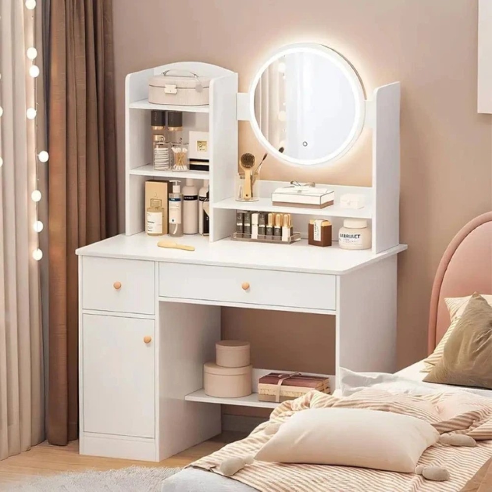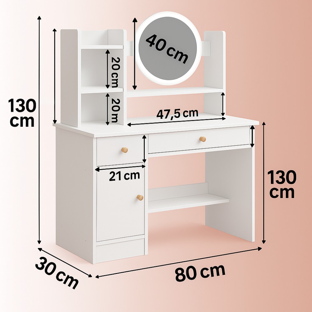 Опис товару Туалетний столик STL-MD 73 — це зручне та стильне місце для щоденного догляду та макіяжу. Вбудоване дзеркало з LED-підсвіткою забезпечує комфортне освітлення, а продумана система полиць і ящиків допомагає підтримувати лад і тримати все необхідне під рукою. Тип: туалетний стіл із дзеркалом Колір: білий Матеріал: ЛДСП Освітлення: LED-підсвітка по колу дзеркала Кількість ящиків: 2 Кількість полиць: 5 Форма дзеркала: кругла Встановлення: підлогова Підсвітка: працює від USB Стільниця з шухлядами Дзеркало з LED-підсвіткою Полиці для зберігання Фурнітура для збирання Інструкція