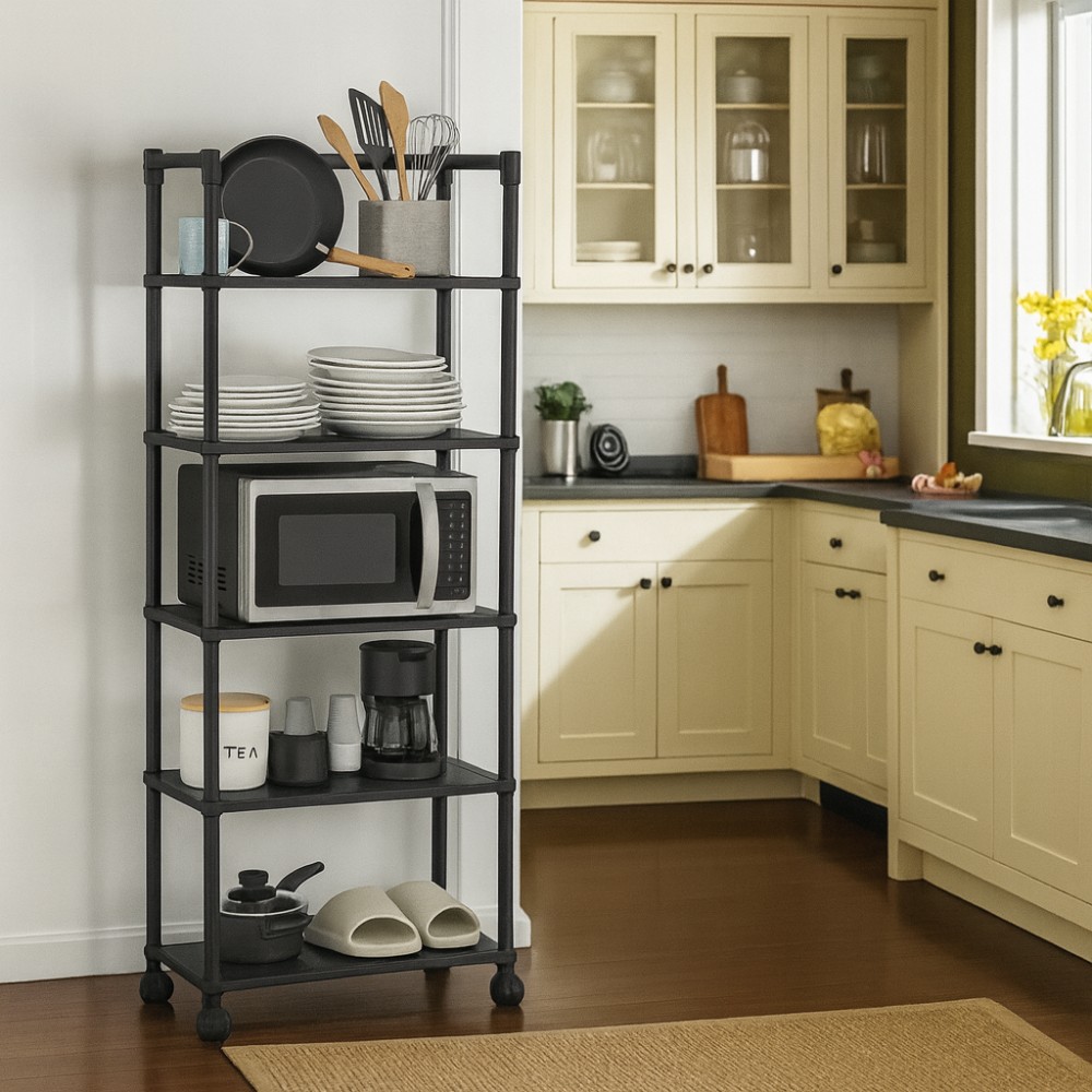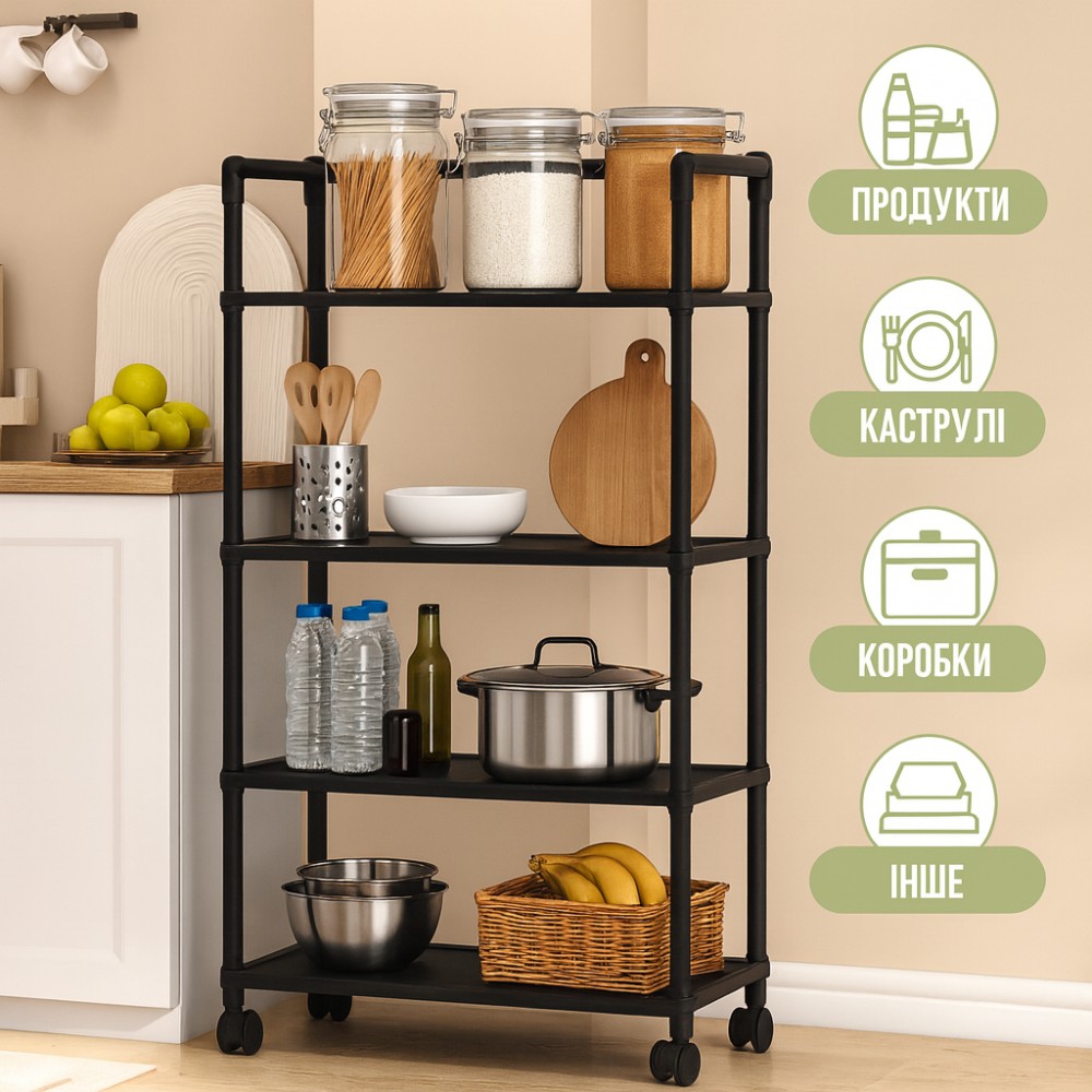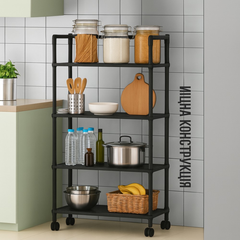 Опис товару Етажерка-стелаж — це універсальне рішення для акуратного зберігання вдома, в офісі або на кухні. Конструкція з міцного металу з пластиковими елементами забезпечує стійкість і довговічність, а 5 містких полиць дають змогу розмістити посуд, побутову хімію, книги, інструменти або косметику. Завдяки коліщаткам етажерку легко переміщати навіть у завантаженому стані — зручно змінювати розташування або прибирати під стіну. Лаконічний чорний колір і мінімалістичний дизайн дають змогу вписати її в будь-який інтер'єр — від кухні до ванної або комори. Етажерка постачається в розібраному вигляді, збирається за кілька хвилин без інструментів. Переваги 5 просторих ярусів для зберігання різних речей. Колеса забезпечують мобільність і легкість переміщення. Міцна металева конструкція витримує великі навантаження. Універсальний розмір — підходить для кухні, ванної, офісу або балкона. Короткий дизайн і сучасний чорний колір. ???? Характеристики Тип: підлогова етажерка-стелаж Кількість полиць: 5 Матеріал: метал + пластик Розмір: 120 × 50 × 26 см Цвет: чорний Призначення: для кухні, ванної кімнати, офісу, спальні, балкона Особливості: на коліщатках, легке складання, стійка конструкція Максимальне навантаження: до 30 кг