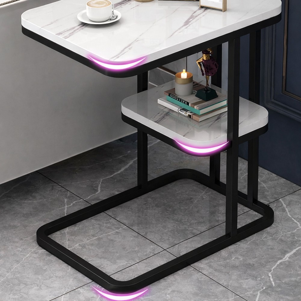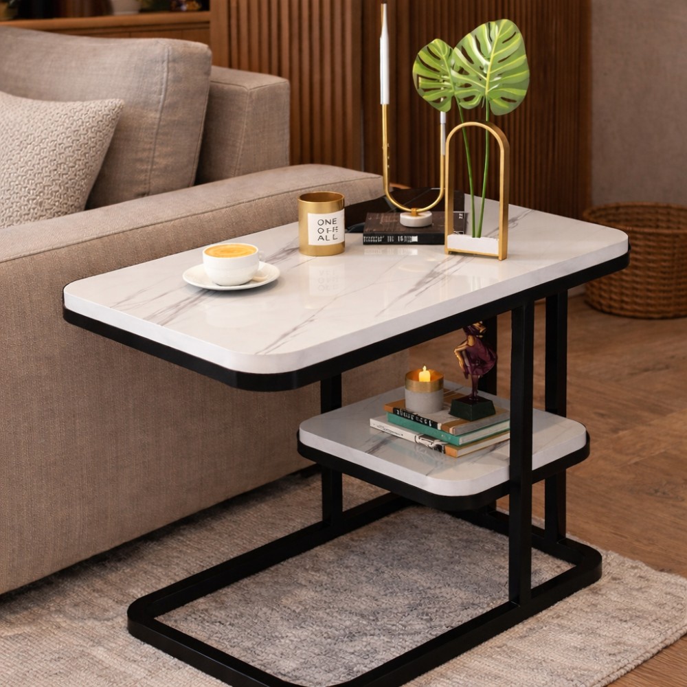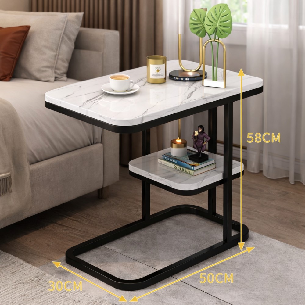Інтер’єрний прикроватний столик DASH-5496 — компактний та функціональний столик для використання біля ліжка, дивана або крісла. С-подібна конструкція дозволяє заїжджати основі під меблі, завдяки чому стільниця розміщується максимально близько до користувача без зайвого простору. Верхня стільниця розміром 50×30 см виконана з МДФ з мармуровим покриттям, що надає столику акуратного та сучасного вигляду. Поверхня підходить для чашки кави, ноутбука, книги або декоративних предметів. Висота столика 58 см оптимальна для використання в зоні дивана або ліжка. Конструкція доповнена нижньою полицею, яка дозволяє зберігати книги, аксесуари або декор, не захаращуючи основну поверхню. Металевий каркас чорного кольору забезпечує стійкість і надійність конструкції при щоденному використанні. Столик органічно вписується в інтер’єр спальні, вітальні або кабінету та підходить для сучасних стилів оформлення. Підходить для використання як: прикроватний столик диванний столик для кави столик для ноутбука підставка для книг або декору Характеристики Тип: інтер’єрний прикроватний столик Модель: DASH-5496 Форма стільниці: прямокутна Розміри: 50×30×58 см Кількість рівнів: 2 Матеріал стільниці: МДФ з мармуровим покриттям Матеріал каркасу: метал Колір стільниці: білий мармур Колір каркасу: чорний