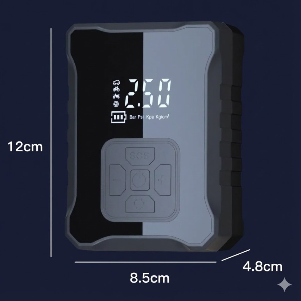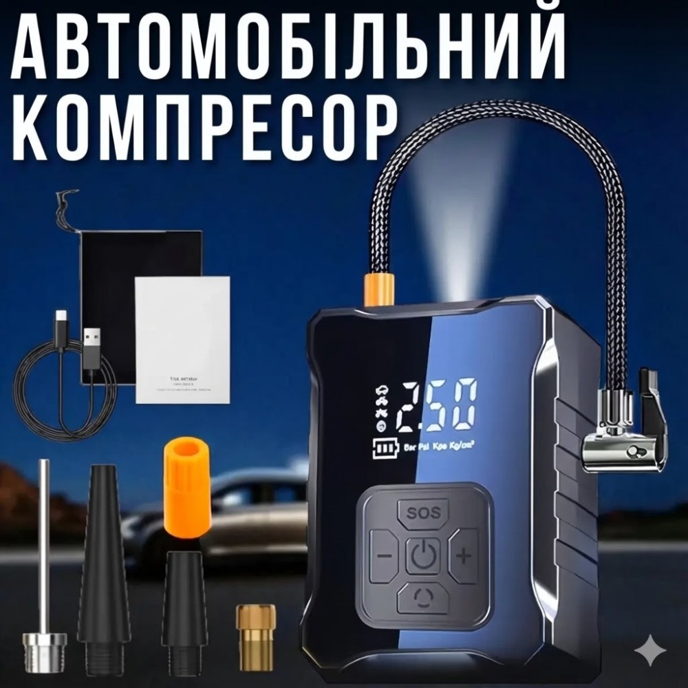 Опис товару: Автомобільний акумуляторний компресор М-007 — компактний і потужний помічник для автомобіліста та не тільки. Завдяки вбудованому акумулятору та світлодіодному ліхтарю він дасть змогу швидко накачати шини автомобіля, велосипеда, мотоцикла, самоката, а також м'ячі та інші надувні вироби в будь-яких умовах, без доступу до розетки та прикурювача. Основні переваги Автономна робота від акумулятора: не потрібно тягнути дроти до прикурювача, зручно використовувати вдома, у гаражі та в дорозі. Високий тиск: до 150 PSI — підходить для більшості легкових авто, велосипедів і мотоциклів. Вбудований LED-ліхтарик: допоможе користуватися компресором у темну пору доби та за поганого освітлення. Цифровий дисплей: показує поточний і заданий тиск, зручно контролювати процес накачування. Автовимкнення: компресор автоматично припиняє роботу у разі досягнення встановленого тиску, захищаючи шину від перекачування. Кілька режимів: встановлені режими для авто, велосипеда, мотоцикла, м'ячів та ін. Компактний корпус: легко зберігати в бардачку, під сидінням або в рюкзаку. Універсальний набір насадок: підходить для різних типів ніпелів і надувних виробів. Характеристики Тип: автомобільний акумуляторний компресор Модель: М-007 Максимальний тиск: до 150 PSI Джерело живлення: вбудований акумулятор Ємність акумулятора: до 6000 mAh (залежно від партії) Дисплей: цифровий, з індикацією тиску Підсвітка: вбудований LED-ліхтарик Керування: кнопкове, з вибором режиму та встановленням тиску Сфера застосування: шини автомобілів, мотоциклів, велосипедів, самокатів, м'ячі та ін. Тип підключення до коліс: шланг із перехідниками/насадками Компактність: портативний, ручний форм-фактор Комплектація Акумуляторний компресор М-007 Повітряний шланг Набір насадок/перехідників (для автоніпеля, велосипеда, м'ячів та ін.) Кабель для заряджання Інструкція користувача Паковання Переваги для покупця Завжди під рукою запас повітря для шин і надувних виробів. Економія часу та грошей — не потрібно їхати на СТО або шукати шиномонтаж. Зручно в поїздках, на дачі, на відпочинку та в міських умовах. Просте керування — впорається навіть новачок.
