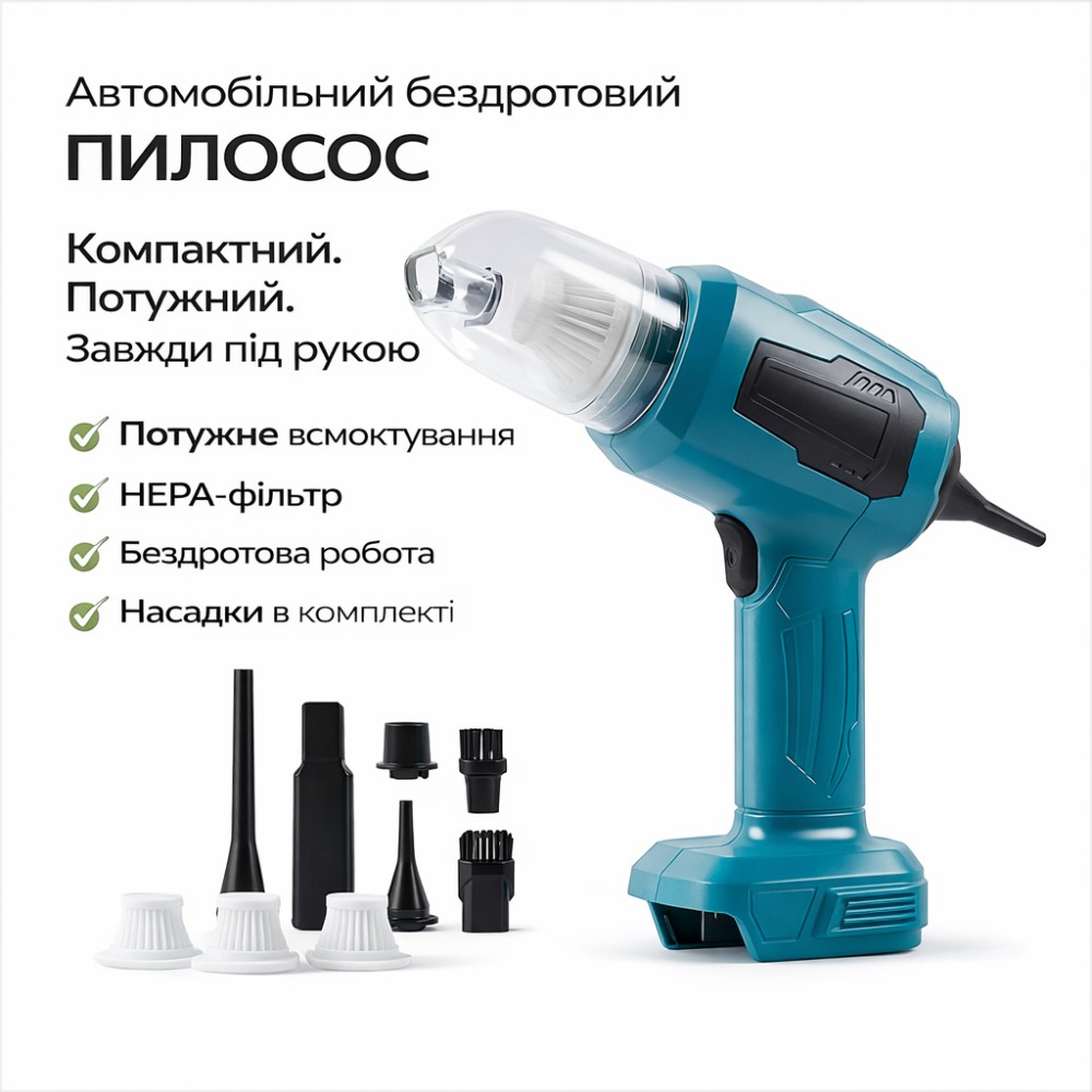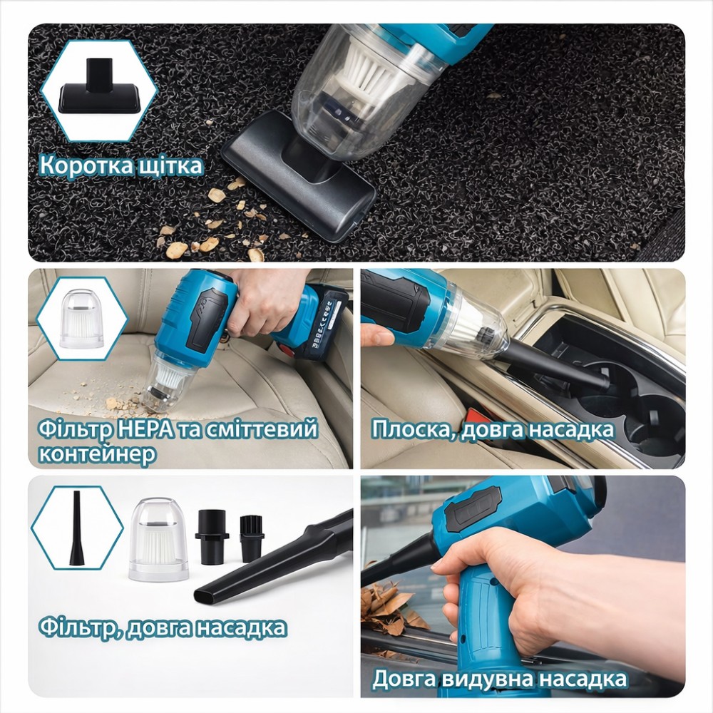 Опис → Автомобільний портативний бездротовий пилосос ПРОФІ-2 AND-292 — це компактний, потужний та універсальний пристрій для швидкого й ефективного прибирання салону автомобіля, комп'ютерів, меблів та інших поверхонь. Він працює повністю без дротів, що робить його ідеальним для використання у важкодоступних місцях. Ергономічний і легкий дизайн забезпечує зручність експлуатації навіть у замкнутому просторі. Пилосос обладнаний високопродуктивним мотором, НЕРА-фільтром і набором насадок для різних завдань, що дає змогу легко справлятися з пилом, крихтами, шерстю тварин і дрібним сміттям. Пристрій особливо підходить тим, хто цінує чистоту в автомобілі, компактне зберігання і швидкий доступ до прибирання без зайвих дротів. Завдяки акумуляторному живленню та продуманій комплектації цей пилосос стає надійним помічником як у поїздках, так і в побуті. Переваги → ✔ Бездротова робота — максимум свободи та зручності ✔ Компактний і легкий — ідеально для автомобіля та дому ✔ НЕРА-фільтрація — ефективне очищення від пилу й алергенів ✔ Висока потужність всмоктування — продуктивне прибирання ✔ Універсальний набір насадок — для різних поверхонь ✔ Ергономічний дизайн — комфортна експлуатація Характеристики → Тип прибирання: суха Джерело живлення: акумуляторний Напруга двигуна: 21 В Продуктивність: 1200 л/хв Максимальне розрядження: 5,5 кПа Тип фільтра: тканинний HEPA Об'єм пилозбірника: 180 мл Рівень шуму: 65 дБ Габарити: 240×160×70 мм Вага (з акумулятором): ~0,8 кг Тип живлення: 18-21 В Комплектація → Пилосос CVC21-CORE — 1 шт. Корпус фільтра — 1 шт. Прямокутна всмоктувальна насадка — 1 шт. Щілинна насадка — 1 шт. Широка насадка — 1 шт. Подовжена насадка для обдування — 1 шт. Насадка для обдування — 1 шт. Прямокутний пензель — 1 шт. Кругла мініпензель — 1 шт. НЕРА-фільтр — 3 шт. Інструкція з експлуатації — 1 шт.