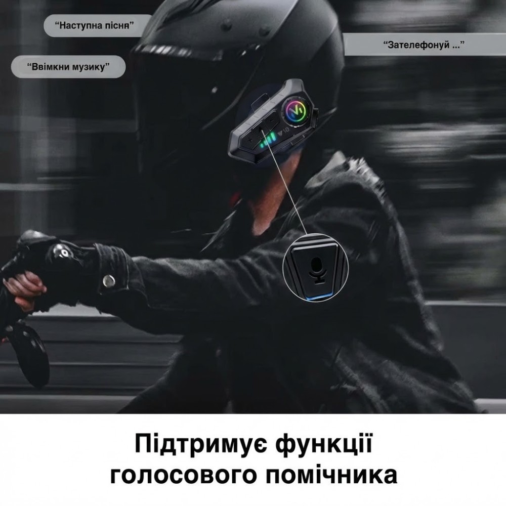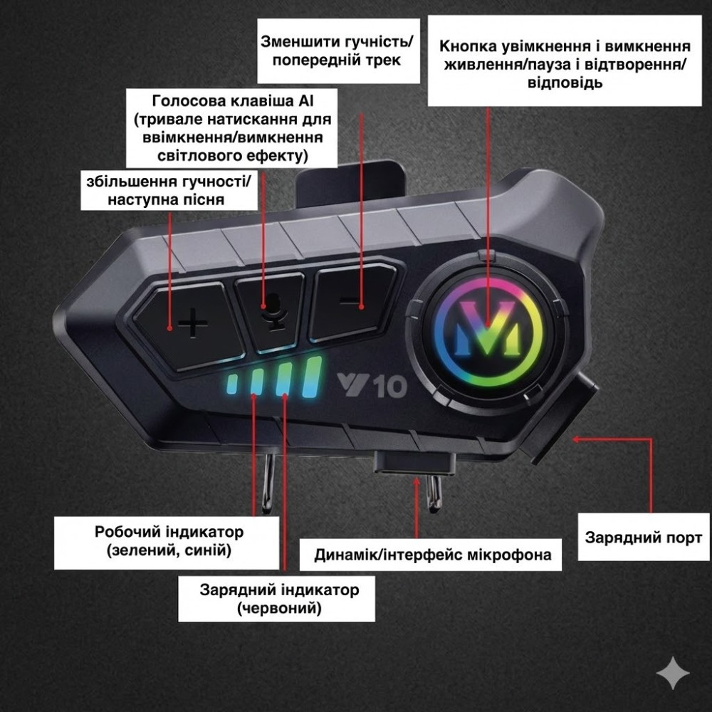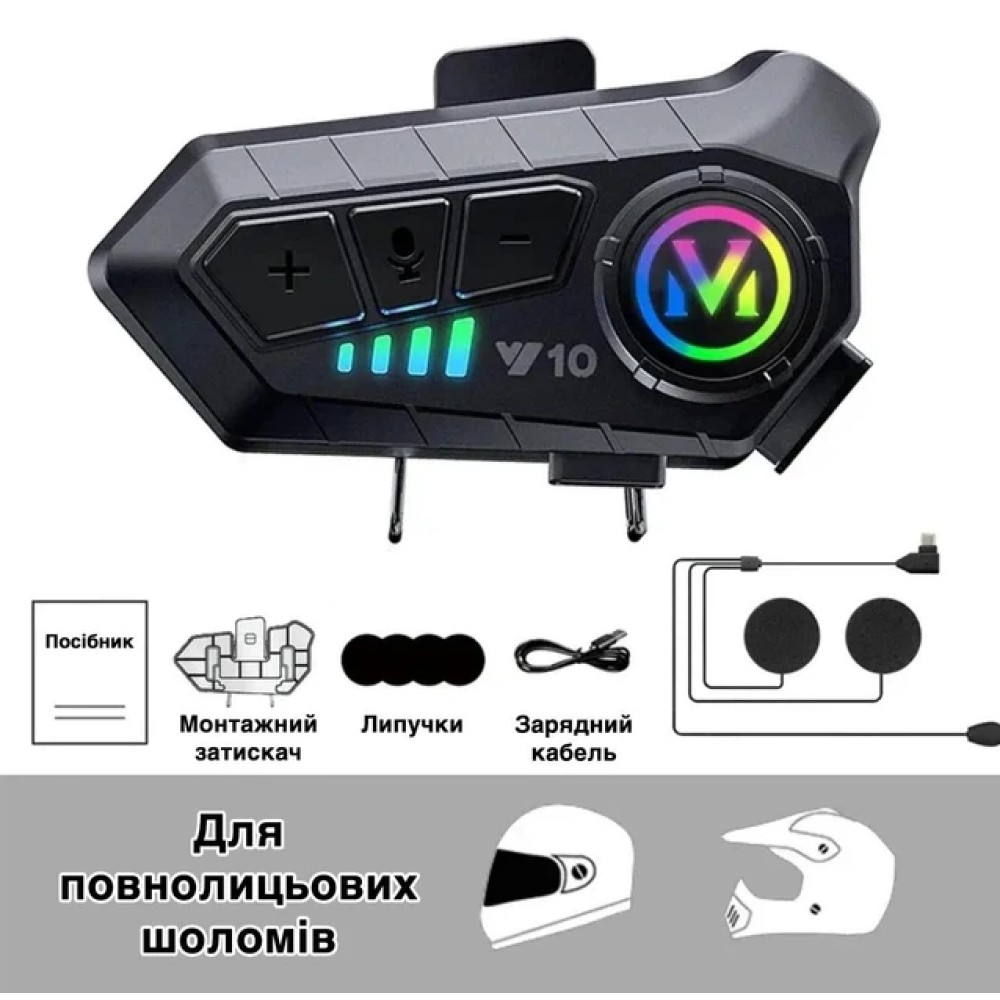 Бездротова мотогарнітура Y10 являє собою передовий пристрій для мотоциклістів, що забезпечує чудову якість звуку та багатофункціональні можливості. Гарнітура підтримує не тільки передавання звуку та розмови через Bluetooth, а й дає змогу прослуховувати музику, використовувати голосові помічники (наприклад, Siri). Вбудований акумулятор забезпечує тривалий час роботи без заряджання, що зручно для тривалих поїздок на мотоциклі. Гарнітура Y10 легко монтується на шолом завдяки кріпленню в комплекті, що забезпечує зручність у керуванні кнопками навіть у захисних рукавичках. Бездротова мотогарнітура Y10 — це надійне та зручне рішення для тих, хто цінує комфорт і безпеку під час поїздок на мотоциклі, водночас не бажаючи відмовлятися від зв'язку та музичного супроводу. Особливості: Інтелектуальне шумозаглушення, якість звуку на рівні HIFI. Підтримує функції голосового помічника. Прості механічні кнопки дають змогу налаштовувати гарнітуру в рукавичках. Гарнітура дає змогу під'єднати два пристрої одночасно, вільно вибирати, перемикати пристрої однією кнопкою для прослуховування пісень, навігації та відповіді на дзвінки. Для Android і Apple. Підходить для повнолицевих шоломів. Характеристики: Розмір: приблизно 8.5 х 3.5 см. Матеріал: пластик + метал. Колір: чорний. Bluetooth: 5.3. Час розмови: приблизно 30 годин. Час відтворення: приблизно 25 годин (максимальна гучність музики). Час у режимі очікування: приблизно 18 місяців. Відстань передавання: 20 м (без перешкод). Частотна характеристика: 100 Гц ~ 18 КГц. SNR: 78 дБ. Інтерфейс: USB Type-C. Комплектація Мотогарнитура. М'який мікрофон. Монтажний затискач. Липучки. Зарядний кабель. Інструкція користувача.