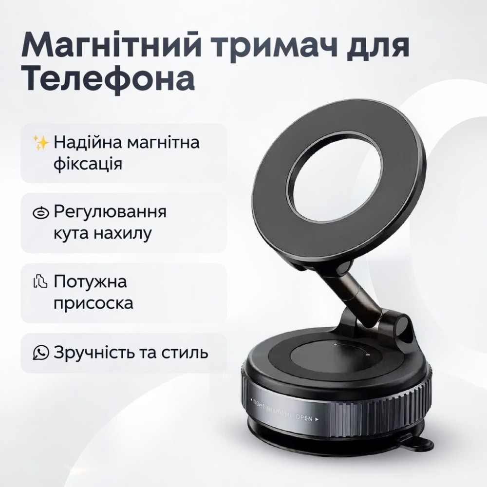 Опис Надійний вакуумний магнітний тримач із технологією MagSafe — ідеальне рішення для безпечного використання смартфона в автомобілі. Потужний неодимовий магніт силою 20N забезпечує миттєву та надміцну фіксацію телефона, а вакуумний присосок витримує навантаження до 5 кг навіть на нерівних дорогах і під час різких маневрів. Виготовлений із преміальних матеріалів: ABS-пластик, TPU, сплав цинку — міцний, стильний і довговічний. Повна свобода позиціювання: обертання на 360° і нахил на 180° дають змогу встановити ідеальний кут огляду для навігації, дзвінків або музики. Повна сумісність з iPhone 12-16 серії (MagSafe) і будь-якими смартфонами завдяки комплектному магнітному кільцю. Компактний (60×40 мм у складеному вигляді), легкий (93,5 г) і має преміальний вигляд — чудовий вибір для щоденного використання та в подарунок. Зробіть водіння комфортнішим і безпечнішим — телефон завжди під рукою, без зайвих рухів і ризику падіння! Переваги Надміцна фіксація — магніт 20N + вакуумний присосок до 5 кг Повна сумісність з MagSafe (iPhone 12-16) і всіма смартфонами 360° обертання і 180° нахил — будь-який зручний кут огляду Не залишає слідів на склі/торпедо завдяки потужному вакууму Преміальні матеріали: ABS + TPU + цинковий сплав Дуже компактний і легкий — усього 93,5 г Швидке встановлення/зняття телефона однією рукою Стильний мінімалістичний дизайн, має дорогий вигляд Характеристики Тип кріплення: вакуумний присосок + магніт MagSafe Сила магніту: 20 N (неодимові магніти) Максимальне навантаження присоска: 5 кг Кут обертання: 360° Угол наклона: 180° Матеріали: ABS-пластик, TPU, сплав цинку Розмір у складеному вигляді: 60 × 40 мм Вага: 93,5 г Сумісність: iPhone 12-16 (MagSafe), Android + магнітне кільце Колір: чорний/сірий металік Комплектація Вакуумний магнітний тримач — 1 шт. Магнітне кільце для не-MagSafe смартфонів — 1 шт. Серветка для очищення поверхні — 1 шт. Інструкція зі встановлення