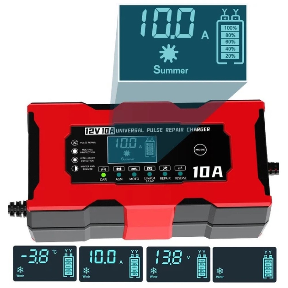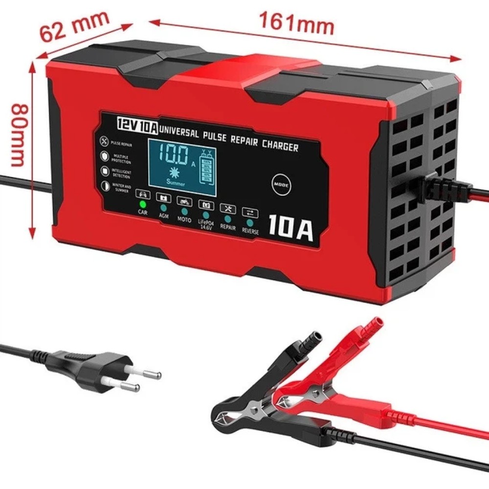 Зарядний пристрій для акумуляторів 12 V 10 A XJB1210-2 з дисплеєм Розумний зарядний пристрій XJB1210-2 — це компактне й ефективне рішення для заряджання 12-вольтових акумуляторів різного типу: олив'яно-кислотних, гелевих, AGM, кальцієвих, EFB та ін. Завдяки триетапного інтелектуального заряджання і вбудованому мікропроцесору, прилад забезпечує максимально безпечне та ефективне заряджання, включно з відновленням сульфатованих акумуляторів. Пристрій повністю автоматичне, обладнане LCD-дисплеєм, на якому показується стадія заряджання та відсоток заряду. Захист від переполюсування, перегрівання, короткого замикання та інших аварійних ситуацій робить використання максимально безпечним. Переваги: Автоматичне 3-ступеневе заряджання Режим відновлення (деульфатація) Звукові сповіщення про закінчення або помилки LCD-дисплей із зображенням заряду на % Захист від переполюсування, КЗ, перегрівання та перенапруги Розумний процесор для безпечної роботи Вбудований вентилятор охолодження Сумісність із різними типами АКБ: AGM, GEL, EFB та ін. Характеристики: Модель: XJB1210-2 Тип: інтелектуальний зарядний пристрій Матеріал корпусу: пластик Розмір: 150 × 82 × 60 мм Вихідна напруга: 12 В Ток заряда: 10 А Типи АКБ: свинцево-кислотні, AGM, гелеві, кальцієві, EFB Діапазон батарей: від 4 до 100 А·год Мінімальна напруга запуску: 8 В Вхідна напруга: 110–220 В / 50–60 Гц Температура спрацьовування захисту: 65°С ±5°С Охолодження: активне, з вентилятором Сертифікати: CE, FCC, ROHS, CMA Комплектація Зарядний пристрій XJB1210-2 Паковання