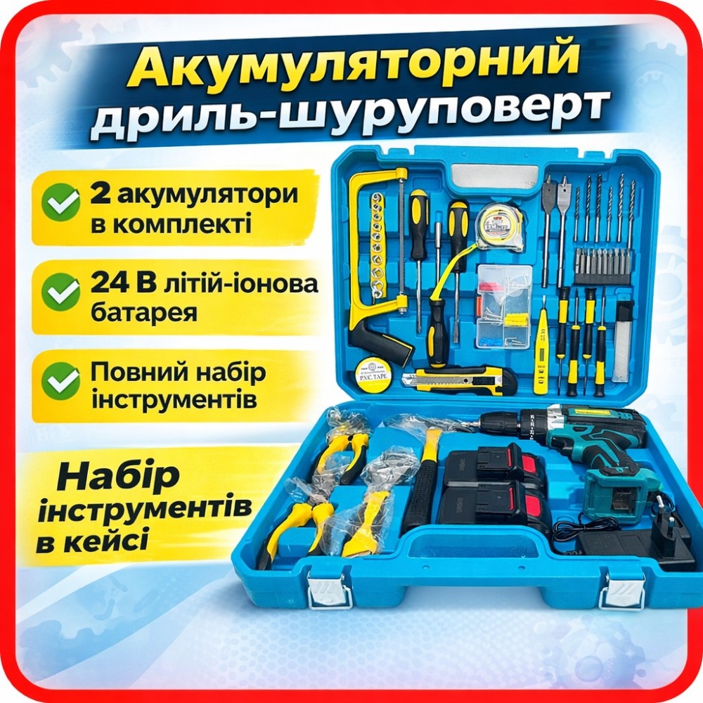 ОПИС ТОВАРУ Акумуляторний шурупокрут MulinSen C016B 24 В призначений для виконання робіт зі свердління та загортання кріплення. Інструмент працює від акумулятора, що дає змогу використовувати його без під'єднання до електричної мережі та виконувати роботи в місцях без доступу до розетки. Модель належить до категорії дрилів-шурупокрутів і використовує літій-іонний акумулятор. До комплекту постачання входять два акумулятори, що дає можливість продовжувати роботу, поки один із них є на заряджанні. Шурупокрут постачається з набором інструментів і пластиковим кейсом для зберігання і транспортування. Інструмент призначений для виконання стандартних побутових і допоміжних монтажних завдань. Акумуляторне живлення робить його зручним для використання під час ремонту, складання конструкцій та інших робіт, де потрібна мобільність і автономність. Переваги Акумуляторне живлення без потреби під'єднання до мережі Напруга акумулятора 24 В Літій-іонний тип акумулятора Два акумулятори в комплекті Наявність набору інструментів Постачання в пластиковому кейсі Технічні характеристики Тип інструмента — дриль-шурупокрут Джерело живлення — акумулятор Тип акумулятора — літій-іонний (Li-ion) Напруга акумулятора — 24 В Кількість акумуляторів — 2 шт. Комплектація Акумуляторний шурупокрут Акумуляторні батареї Зарядний пристрій Набір інструментів Пластиковий кейс