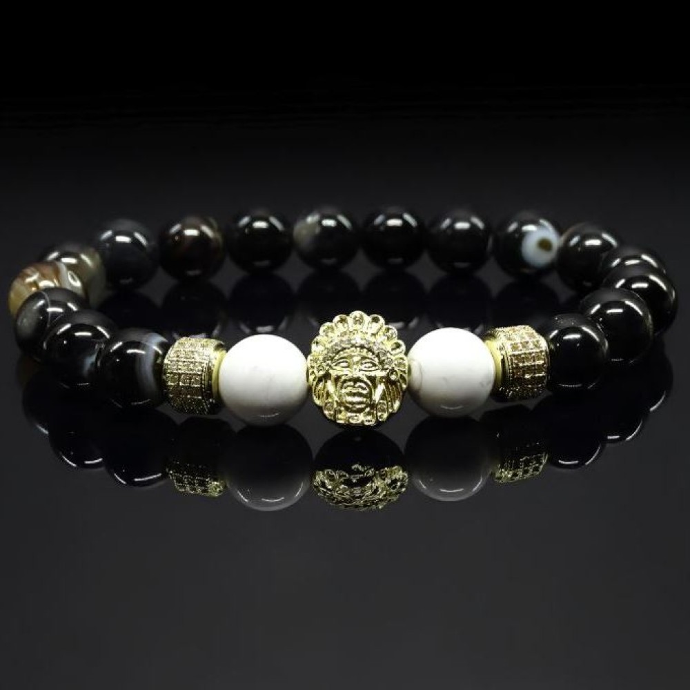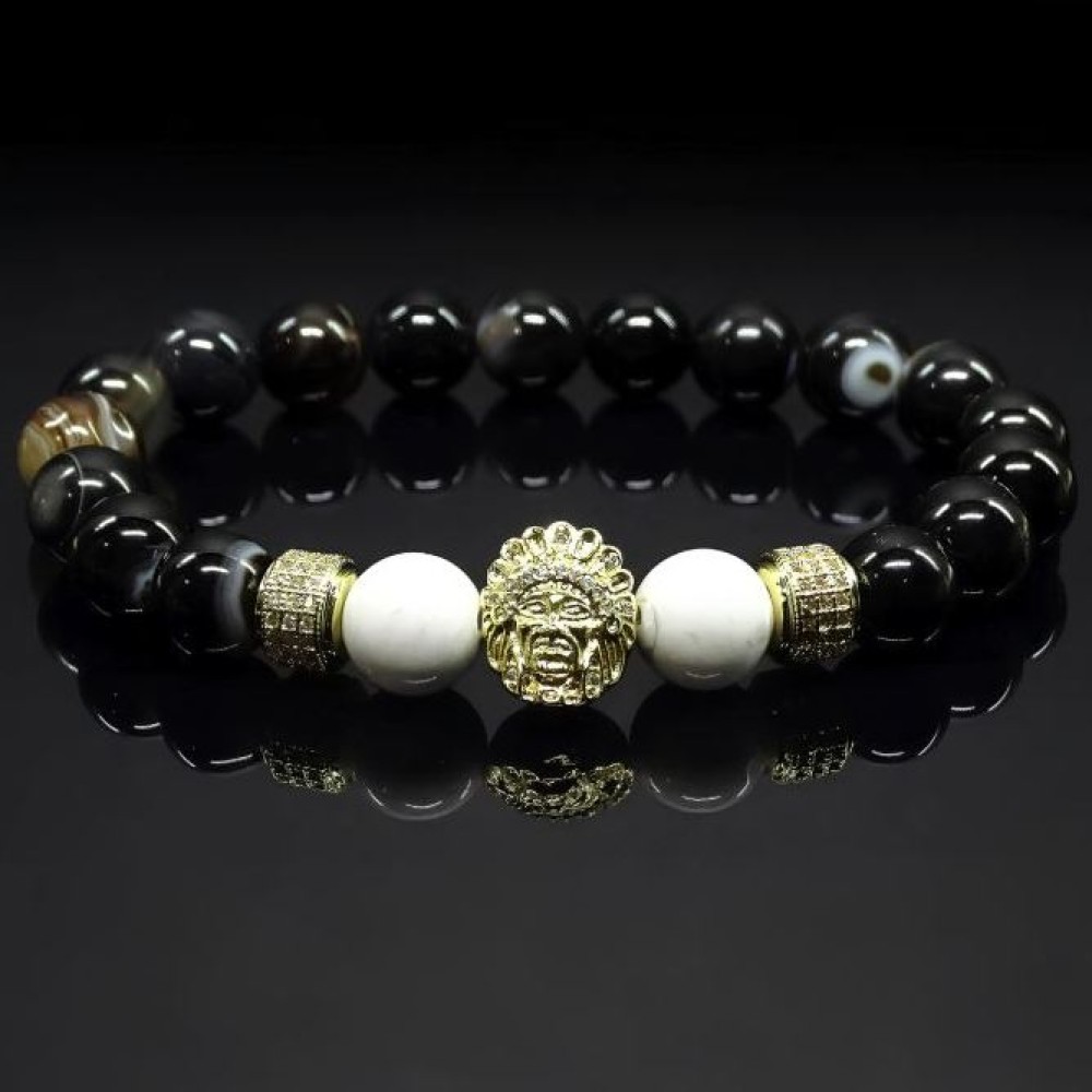 Браслет складається з круглих бусин 10мм, нанизаних на еластичну нитку. Основні матеріали бусин включають: Кахолонг - гладкі округлі бусини нежного молочно-білого кольору з характерними сірими прожилками. Чорний глянсовий бус агату. Вони надають браслету строгий та елегантний вигляд. Додатково до браслету включені металеві роздільники металевий елемент з інкрустацією дрібним камінням, який додає вишуканості. Загальний стиль аксесуара – елегантний та шляхетний.