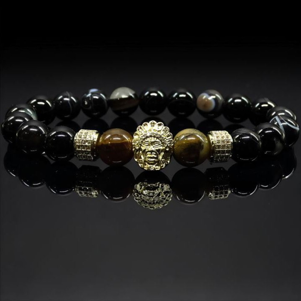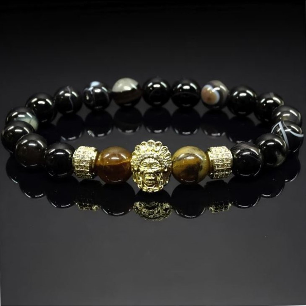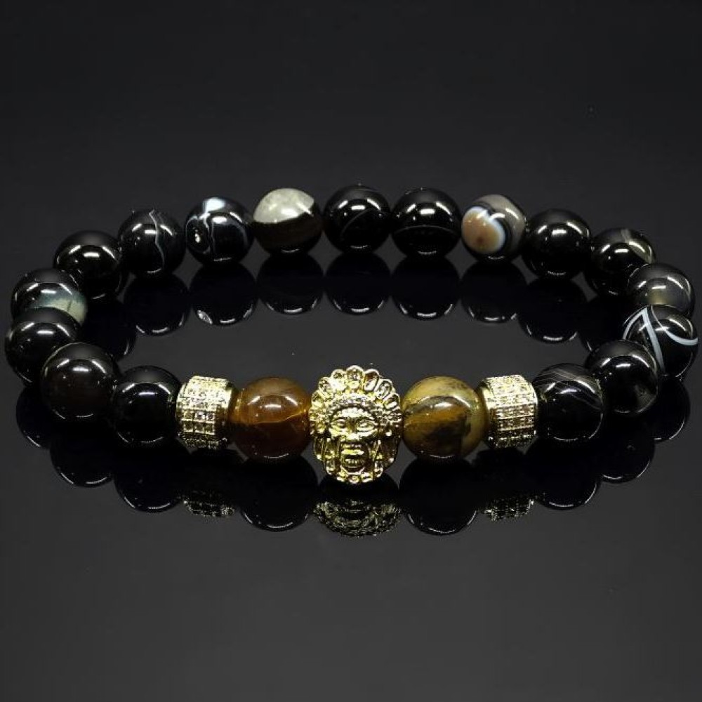 Браслет складається з круглих намистин 10мм, нанизаних на еластичну нитку. Основні матеріали намистин включають: Тигрове око – коричнево-золотисті намистини з характерними переливами. Чорний глянсовий намист з агату. Вони надають браслету строгий і елегантний вигляд. Додатково в браслет включені металеві роздільники металевий елемент з інкрустацією дрібним камінням, який додає вишуканості. Загальний стиль аксесуара – елегантний та шляхетний.