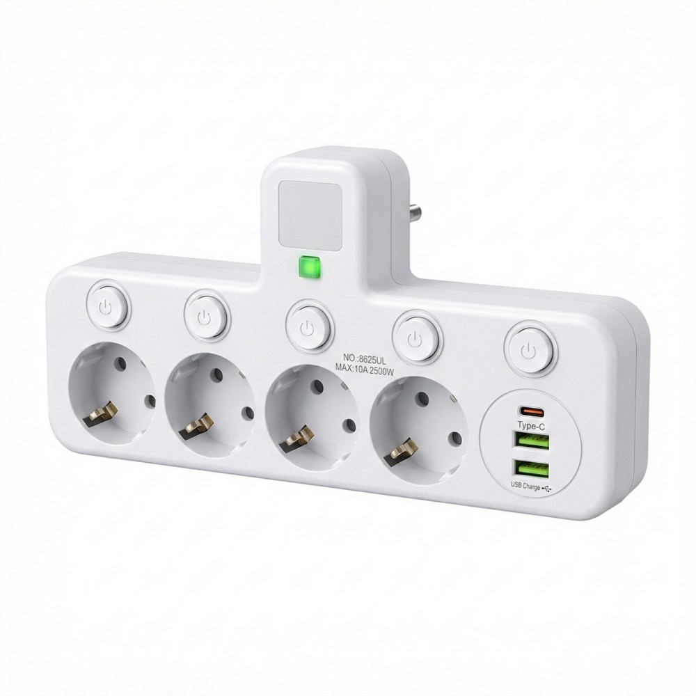 Мережевий адаптер 8625UL — це ідеальне рішення для тих, хто цінує порядок та функціональність. Пристрій дозволяє перетворити одну стандартну настінну розетку на потужну станцію для живлення та зарядки 7 пристроїв одночасно, не займаючи при цьому місця на підлозі чи столі зайвими дротами. Ключові переваги моделі 8625UL: Розумне керування живленням: Кожна з 4 євро-розеток оснащена власним індивідуальним LED-вимикачем. Це дозволяє знеструмлювати прилади окремо, що значно економить електроенергію та продовжує термін служби вашої техніки. Сучасний зарядний блок: Окрім стандартних розеток, пристрій має 3 USB-порти для прямої зарядки гаджетів. Серед них — швидкісний порт Type-C з підтримкою Power Delivery (PD) для сучасних смартфонів та планшетів. Висока потужність та надійність: Адаптер розрахований на навантаження до 2500 Вт (10 А), що дозволяє підключати до нього не лише зарядні пристрої, а й побутову техніку. Компактний дизайн: Конструкція "Moveable Socket" (без шнура) забезпечує щільне прилягання до стіни. Це робить його ідеальним для використання за меблями, на кухні або в офісі. Безпека понад усе: Корпус виготовлено з вогнестійкого пластику, а розетки мають захисні шторки та контакти з фосфористої бронзи для надійного з'єднання. Технічні характеристики: Модель: 8625UL. Максимальна потужність: 2500 Вт. Максимальний струм: 10 А. Кількість розеток: 4 шт. (220 В). Кількість USB-портів: 3 шт. (2 x USB-A, 1 x USB Type-C PD). Тип підключення: Безпосередньо у розетку. Особливості: Індивідуальні LED-вимикачі для кожної розетки. Комплектація: Мережевий розгалужувач 8625UL. Фірмова картонна упаковка.