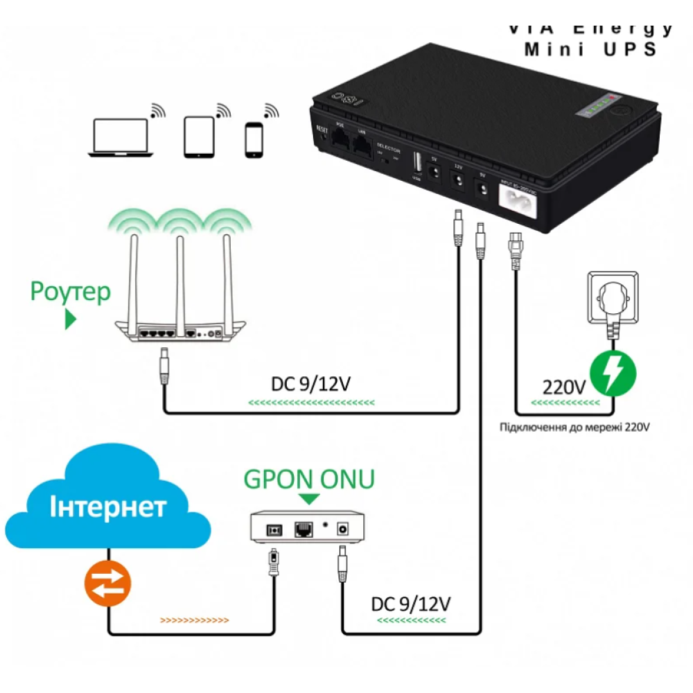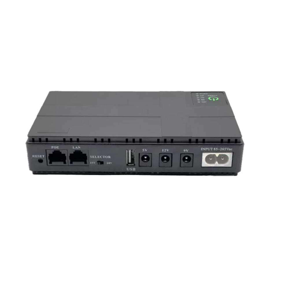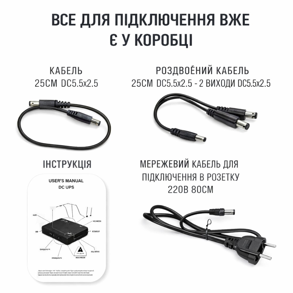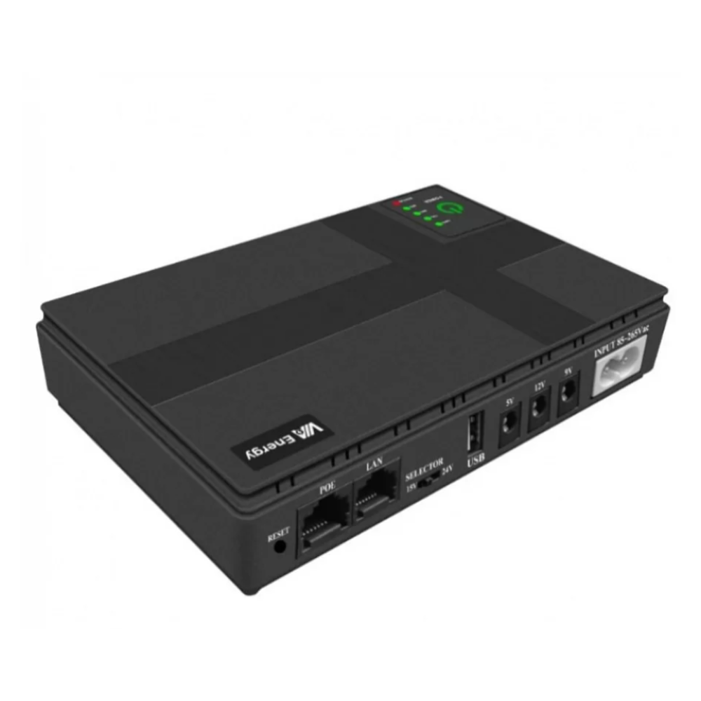 Опис Міні ДБЖ призначений для забезпечення резервного живлення роутерів, ONU, оптоволокондних модемів та іншого мережевого обладнання у разі вимкнення електроенергії. Пристрій автоматично перемикається на живлення від вбудованого акумулятора у разі зникнення мережі та повертається в мережевий режим після відновлення електропостачання без перезавантаження під'єднаного обладнання. Компактний корпус дає змогу розміщувати ДБЖ поруч із роутером або іншим обладнанням. Підходить для використання вдома або в офісі. Переваги Автоматичне перемикання між мережею й акумулятором Підтримка автономної роботи до 10 годин Підходить для роутерів і ONU Компактний корпус Характеристики Тип: мини ИБП (UPS) Призначення: роутер, ONU, мережеве обладнання Ємність акумулятора: 20000 мА·год Вихідна потужність: 36 W Автономна робота: до 10 годин Перемикання живлення: автоматичне Індикація: світлодіодна Колір: чорний Стан: нове Комплектація Міні ДБЖ (UPS) Кабелі для під'єднання обладнання Кабель живлення Паковання