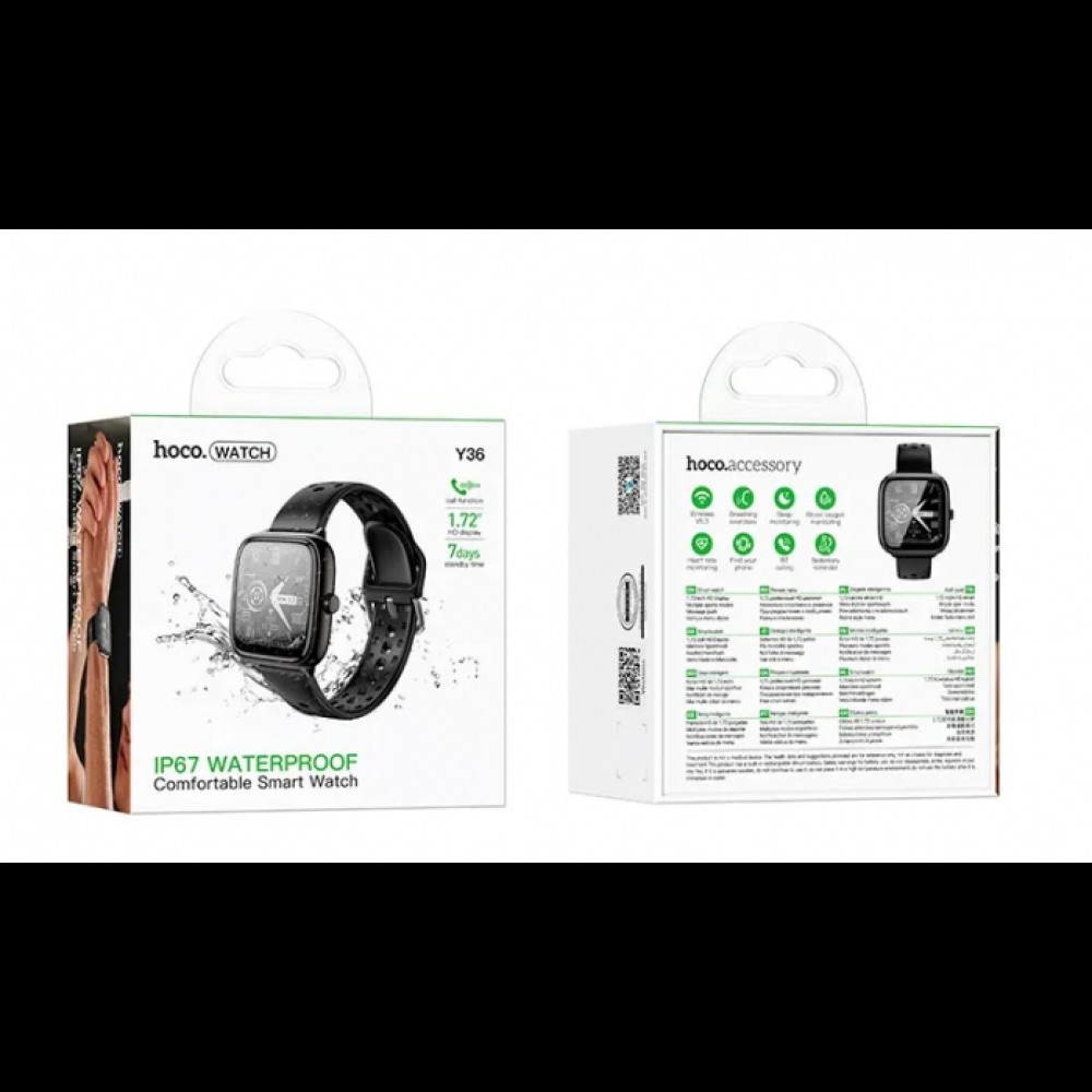 Hoco Y36 – это современные умные часы с большим 1.72-дюймовым TFT-дисплеем (разрешение 360x360) и поддержкой звонков через Bluetooth 5.3. Корпус с защитой IP67 надежно выдерживает дождь, брызги и пот, что делает модель удобной для повседневного использования.
