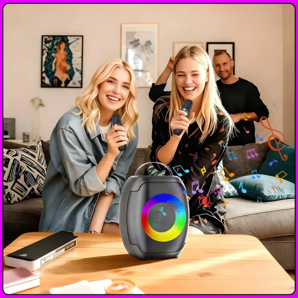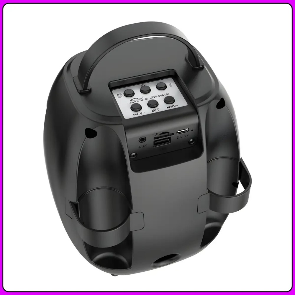 Портативна Bluetooth колонка ZQS-W4107 - це компактна акустична система, призначена для прослуховування музики та караоке вдома, на природі або під час зустрічей з друзями. Колонка оснащена 4-дюймовим динаміком потужністю 8 Вт, який забезпечує чисте та досить гучне звучання для невеликих приміщень. RGB-підсвітлення створює додатковий візуальний ефект під час відтворення музики, роблячи пристрій більш атмосферним. Колонка підтримує сучасне бездротове підключення Bluetooth 5.3 з дальністю до 15 метрів, а також відтворення музики з USB-накопичувачів, карт пам'яті TF та через AUX-вхід. До комплекту входять два бездротових мікрофони, завдяки чому пристрій можна використовувати для караоке. Зручна ручка для переноски робить колонку практичною та зручною для транспортування. Переваги: