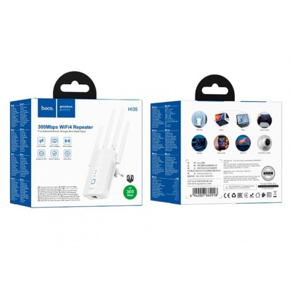 Hoco HI35 WiFi4 – мощный усилитель Wi-Fi сигнала со скоростью передачи до 300 Мбит/с и поддержкой стандарта Wi-Fi 802.11b/g/n.