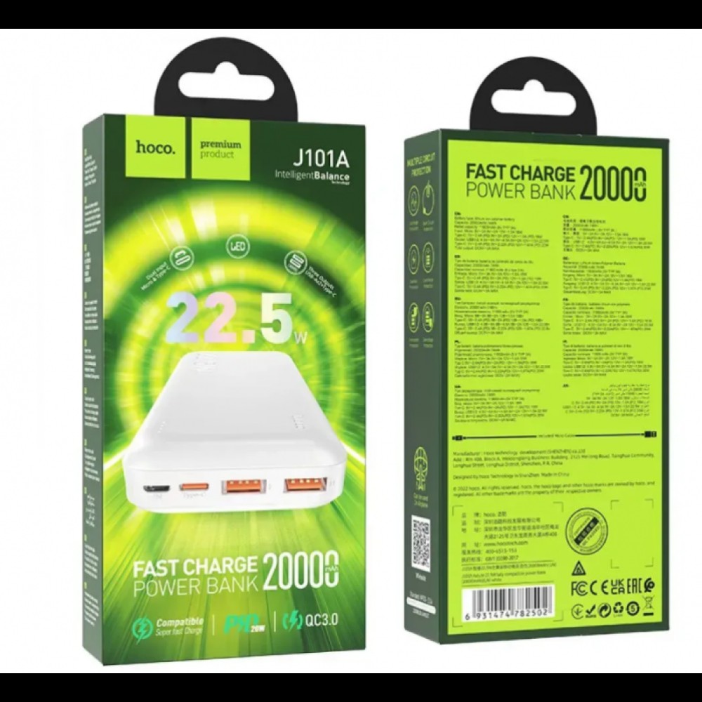 Внешний аккумулятор Power bank HOCO J101A Astute 22.5W 20000mAh PD22,5W+QC3.0 батарея Белый