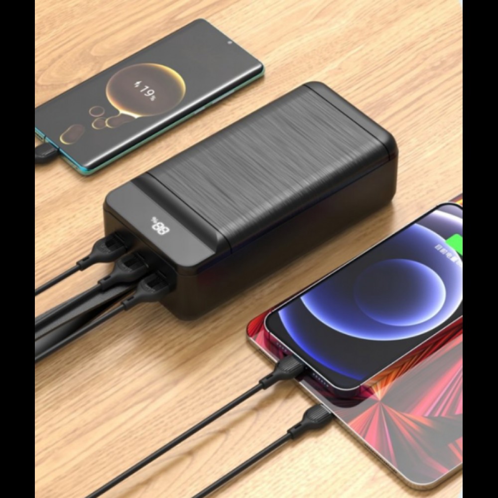 Для изготовления аксессуара используют высококачественные огнестойкие материалы и пластик ABS, поэтому этот павербанк способен прослужить долгие годы. Стильный и современный дизайн и приятная на ощупь поверхность предоставляет дополнительный комфорт при использовании павербанка. Сверху находится крепкий кожаный ремешок для большего удобства. На лицевой стороне находится LED-дисплей, изображающий уровень заряда в процентах. На тыльной стороне корпуса расположен фонарик. В торце устройства находятся разъемы Micro-USB и Lightning, два USB порта с общей силой тока на выходе 2А, USB порт с выходной мощностью 22.5Вт, а также универсальный разъем Type-C, впускающий ток в обе стороны, выходная мощность 20Вт. Максимальная мощность на входе – 18Вт.