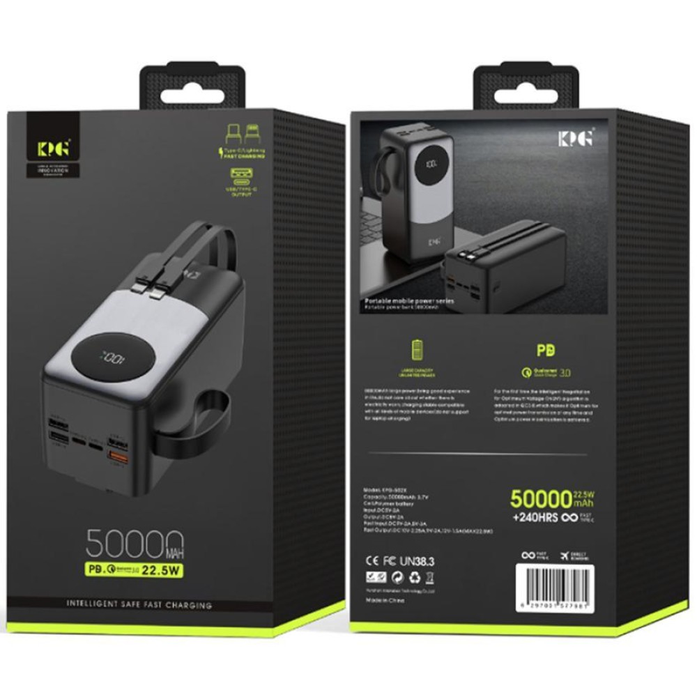 Опис Зовнішній акумулятор KPG KPG-502X — це високий портативний зарядний пристрій на 50 000 мА·год, створений для забезпечення тривалої автономності ваших мобільних девайсів. Модель обладнана вбудованими кабелями та декількома вихідними портами, що дає змогу заряджати кілька ґаджетів одночасно без потреби пошуку додаткових аксесуарів. Підтримка протоколів швидкого заряджання потужністю до 22.5 Вт істотно скорочує час відновлення енергії. Компактний для своєї ємності корпус доповнений інформативним цифровим дисплеєм, який показує точний рівень заряду акумулятора. Характеристики Бренд: KPG Модель: KPG-502X Місткість: 50 000 мАч Тип акумулятора: Полімерний (Polymer) Вхід: 2 x Type-C (22.5 Вт) Вихід USB і Type-C: 22.5 Вт Вбудований кабель Type-C: 22.5 Вт Вбудований кабель Lightning: 15 Вт Дисплей: Цифровий LCD Особливості: Підтримка швидкого заряджання (Fast Charging) Переваги * Екстремальна ємність: 50 000 мА·год дають змогу залишатися на зв'язку впродовж багатьох днів, що ідеально для поїздок і умов браку електроенергії. Інтегровані кабелі: Вбудовані дроти Type-C і Lightning роблять використання пристрою максимально зручним. Висока потужність: Підтримка 22.5 Вт забезпечує швидке заряджання як самого повербанка, так і під'єднаних пристроїв. Точний контроль: Цифровий дисплей позбавляє невизначеності, показуючи залишок заряду у відсотках. Універсальність: Наявність різних інтерфейсів дає змогу під'єднувати техніку будь-яких брендів. Комплектація * Зовнішній акумулятор KPG KPG-502X Заводське паковання