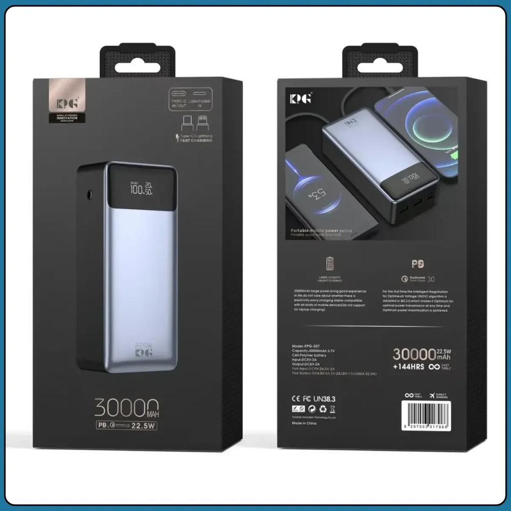 Повербанк 30000 mAh з вбудованими кабелями Type-C і Lightning KP KPG-307 22.5W Зовнішній акумулятор KP KPG-307 ємністю 30000 мА·год призначений для тривалого та стабільного харчування мобільних пристроїв у будь-яких умовах. Він підтримує швидке заряджання потужністю до 22,5 Вт і автоматично визначає оптимальний струм для під'єднаного пристрою завдяки системі розумної ідентифікації. Це дає змогу безпечно й ефективно заряджати смартфони, планшети, навушники та інші ґаджети. Повербанк обладнаний кількома портами та вбудованими кабелями, що дає можливість одночасно заряджати кілька пристроїв без потреби носити додаткові дроти. Корпус виготовлений із вогнестійкого ABS-пластику, а вбудована система захисту запобігає перегріванню, короткому замиканню, перенапруженню й перезаряджанню, забезпечуючи надійну та довговічну експлуатацію. Переваги: Висока місткість: 30000 мА·год для багаторазового заряджання пристроїв Швидке заряджання: підтримка Quick Charge 3.0 до 22,5 Вт Розумна ідентифікація: автоматичний підбір оптимального струму Багатопортове під'єднання: заряджання декількох пристроїв одночасно Вбудовані кабелі: Type-C і Lightning завжди під рукою Цифровий дисплей: зображення відсотка заряду напруги та сили струму Підвищена безпека: захист від перегрівання короткого замикання та перенапруги Характеристики: Тип пристрою: зовнішній акумулятор power bank Модель: KP KPG-307 Тип акумулятора: літій-полімерний (Li-Pol) Ємність акумулятора: 30000 мА·год (3.7 В) Максимальна потужність: 22.5 Вт Підтримка швидкого заряджання: Quick Charge 3.0 Вхідна напруга: DC 5V 2A Швидкий вхід: DC 9V 2A, 5V 3A Вихідна напруга: DC 5V 2A Швидкий вихід: DC 4.5V 5A, 9V 2A, 12V 1.5A Роз'єми: 2 USB, 2 Type-C Вбудовані кабелі: Type C, Lightning Дисплей: цифровий (світлодіодний) Матеріал корпусу: вогнестійкий ABS-пластик Розміри: 15 х 6.5 х 3.5 см Комплектація Зовнішній акумулятор KP KPG-307 Зарядний кабель USB