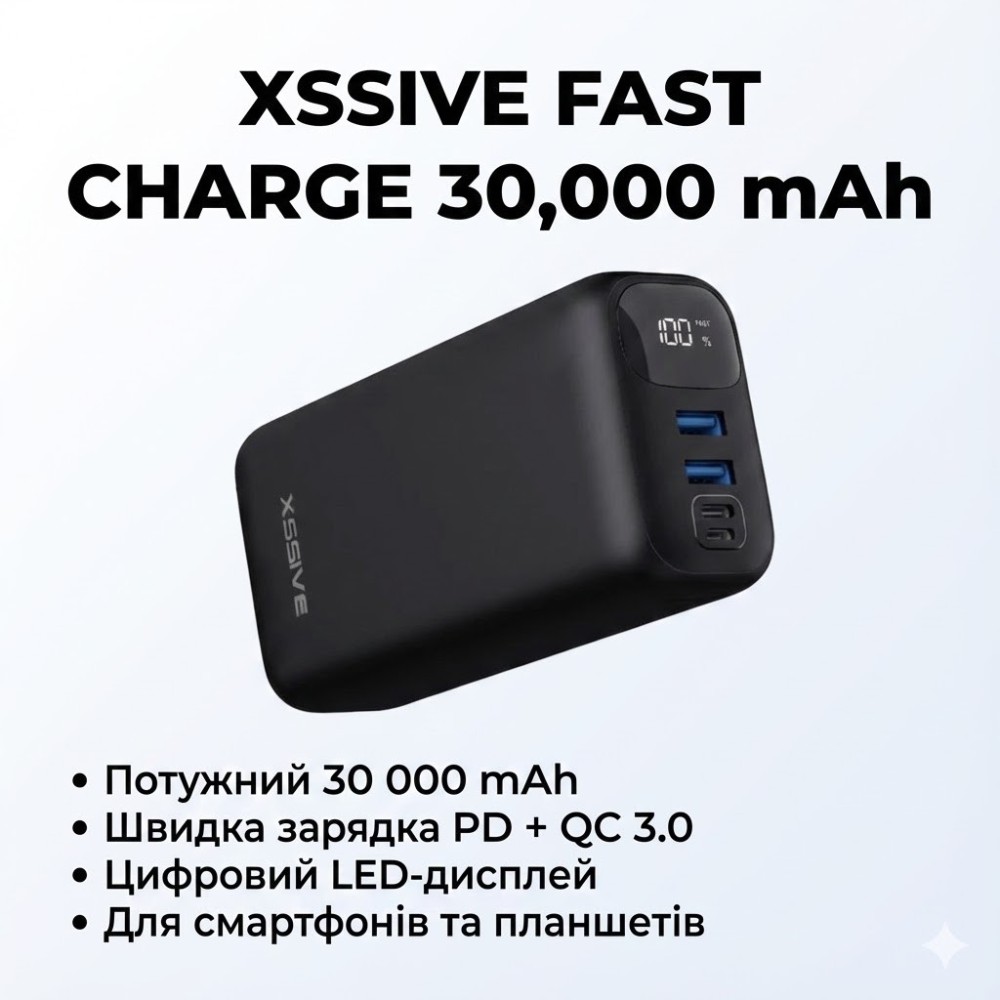 Опис Потужний зовнішній акумулятор XSSIVE XSS-PB23 ємністю 30 000 мА·год — це універсальне рішення для заряджання ваших ґаджетів далеко від розеток. Пристрій підтримує сучасні протоколи швидкого заряджання, що дає змогу оперативно відновити енергію смартфона, планшета або інших сумісних девайсів, економлячи ваш час. Компактний корпус із міцних матеріалів та інформативний дисплей роблять використання повербанка максимально зручним і безпечним у будь-яких умовах Переваги: Висока місткість: Запас енергії у 30 000 мА·год дає змогу зарядити телефон кілька разів, що ідеально підходить для подорожей, походів або тривалої відсутності електрики. Швидке заряджання: Підтримка технологій PD (Power Delivery) і QC 3.0 забезпечує підвищену ефективність і швидкість заряджання сумісних пристроїв. Універсальність: Підходить для заряджання пристроїв на базі Android, Apple, Huawei, Samsung і Xiaomi. Інформативний екран: Цифровий LED-дисплей точно показує рівень заряду, що залишився, усуваючи потребу гадати за індикаторами. — Багаторівневий захист: Захист схеми PCBA гарантує безпеку процесу заряджання для ваших ґаджетів. Одночасне заряджання: Наявність декількох виходів дає змогу під'єднувати різні пристрої одночасно Технічні характеристики: Модель: XSS-PB23. Ємність акумулятора: 30 000 мА·год. Матеріал корпусу: PC + ABS (вогнистий пластик). Вхідні роз'єми: Type-C: 5V-3A, 9V-2A. Micro-USB: 5V-2A, 9V-2A. Вихідні роз'єми: USB-A (OUT1/OUT2): 4.5V-5A, 5V-4.5A, 9V-2A, 12V-1.5A. Type-C: 5V-3A, 9V-2.22A, 12V-1.5A. Вага нетто: 606,5 г. Розміри: 136,8×70×40,8 мм Комплектація зовнішній акумулятор XSSIVE кабель для заряджання — паковання