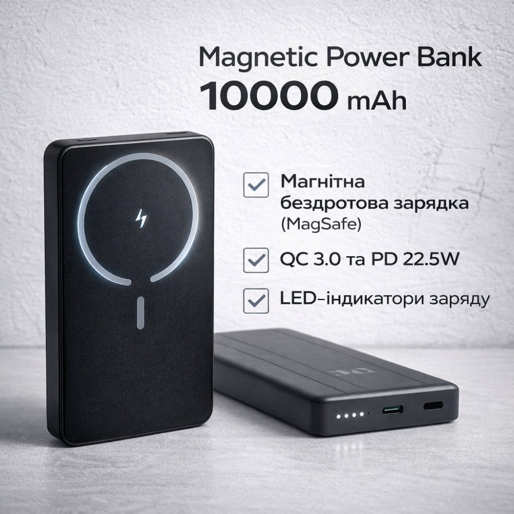 Опис товару Power Bank King Power WPG-104 Magnetic — компактний портативний акумулятор для щоденного використання, створений для зручної зарядки смартфонів та інших мобільних пристроїв удома, в дорозі або на роботі. Модель підтримує бездротову зарядку з магнітною фіксацією (MagSafe), що забезпечує надійне кріплення смартфона під час заряджання. Також передбачена швидка дротова зарядка за стандартами QC 3.0 та Power Delivery з максимальною потужністю до 22.5 W. Індикація рівня заряду виконана у вигляді світлодіодних індикаторів, що дозволяє швидко перевірити залишок енергії. Лаконічний дизайн і компактні розміри роблять цей power bank зручним для щоденного носіння та подорожей. ⚙️ Характеристики Тип: портативний акумулятор (Power Bank) Бренд: King Power Модель: WPG-104 Ємність: 10000 mAh Тип акумулятора: Li-Pol Підтримка швидкої зарядки: QC 3.0, Power Delivery Максимальна потужність: 22.5 W Бездротова зарядка: є Потужність бездротової зарядки: до 15 W Магнітна фіксація (MagSafe): є Вихідні інтерфейси: USB-A, USB-C Вхідний інтерфейс: USB-C Індикація заряду: LED-індикатори Одночасна зарядка кількох пристроїв: так ⭐ Переваги Магнітна бездротова зарядка MagSafe Швидка зарядка QC 3.0 та PD до 22.5 W Можливість зарядки до трьох пристроїв одночасно Компактний корпус і мінімалістичний дизайн Зручна LED-індикація рівня заряду Ідеальний для щоденного використання та подорожей ???? Комплектація Power Bank King Power WPG-104 Кабель для зарядки Упаковка