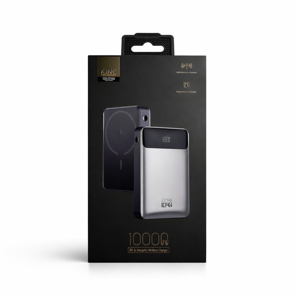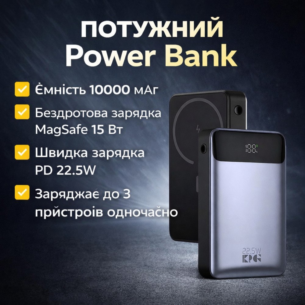 Опис Power Bank King Power WPG-108 — компактний портативний акумулятор для щоденного використання, призначений для заряджання смартфонів та інших мобільних пристроїв удома, у дорозі або на роботі. Модель обладнана підтримкою швидкого заряджання та бездротового заряджання з магнітною фіксацією, що робить процес заряджання максимально зручним. Корпус виготовлений у лаконічному дизайні та розрахований на комфортне утримання. Power Bank дає змогу одночасно заряджати декілька пристроїв, включно з бездротовим заряджанням, що особливо зручно під час активного використання смартфона. Характеристики Тип: портативний акумулятор (Power Bank) Бренд: King Power Модель: WPG-108 Ємність акумулятора: 10000 mAh Тип акумулятора: Li-Pol Підтримка швидкого заряджання: Power Delivery Максимальна потужність швидкого заряджання: 22.5 W Бездротове заряджання: є Потужність бездротової зарядки: 15 W Магнітна фіксація (MagSafe): є Вихідні інтерфейси: USB-A, USB-C Вхідний інтерфейс: USB-C Можливість одночасного заряджання пристроїв: є Переваги Підтримка швидкого заряджання Power Delivery Бездротова зарядка з магнітним кріпленням Можливість заряджання до трьох пристроїв одночасно Компактні розміри та зручність перенесення Підходить для повсякденного використання й поїздок Комплектація Power Bank King Power WPG-108 Кабель для заряджання Паковання