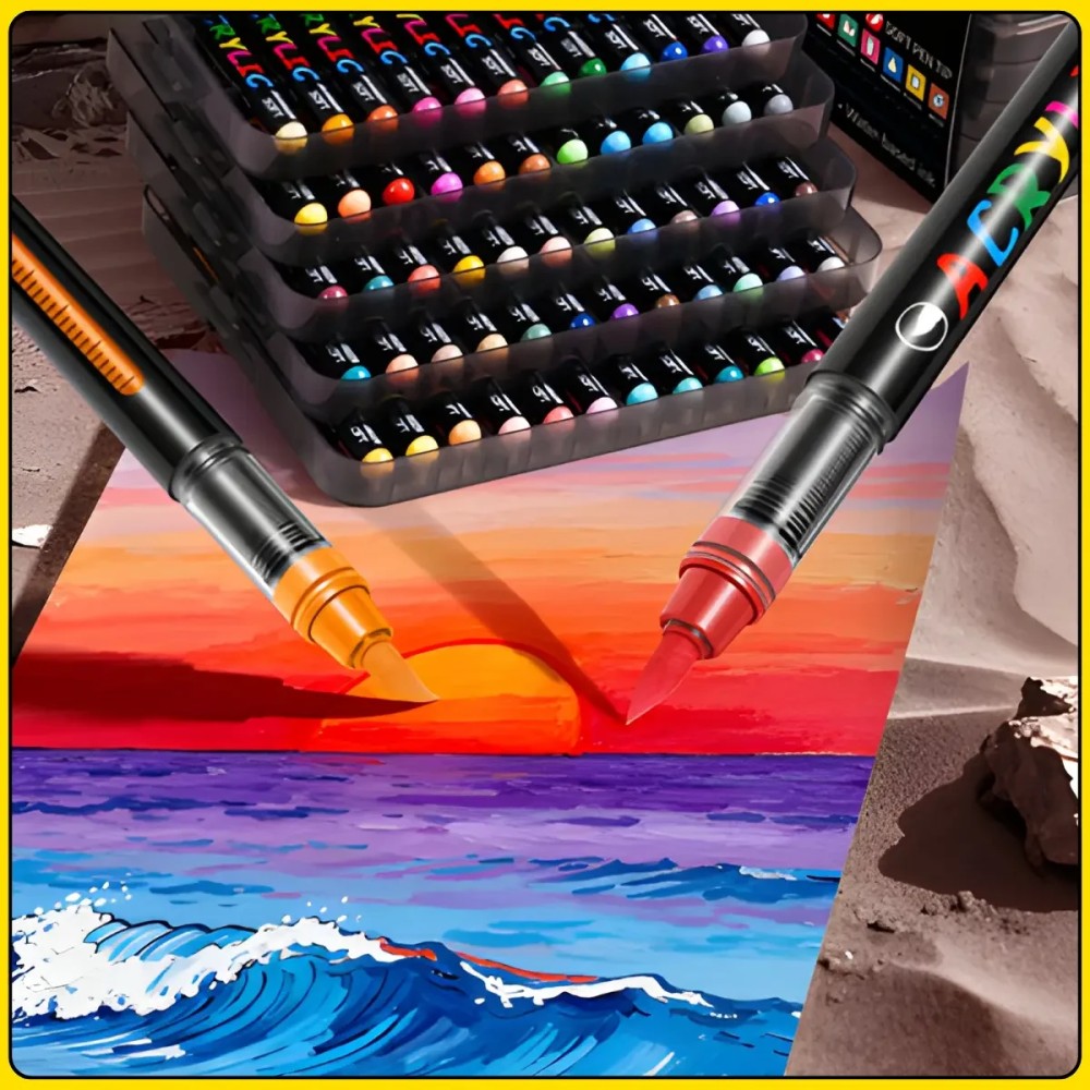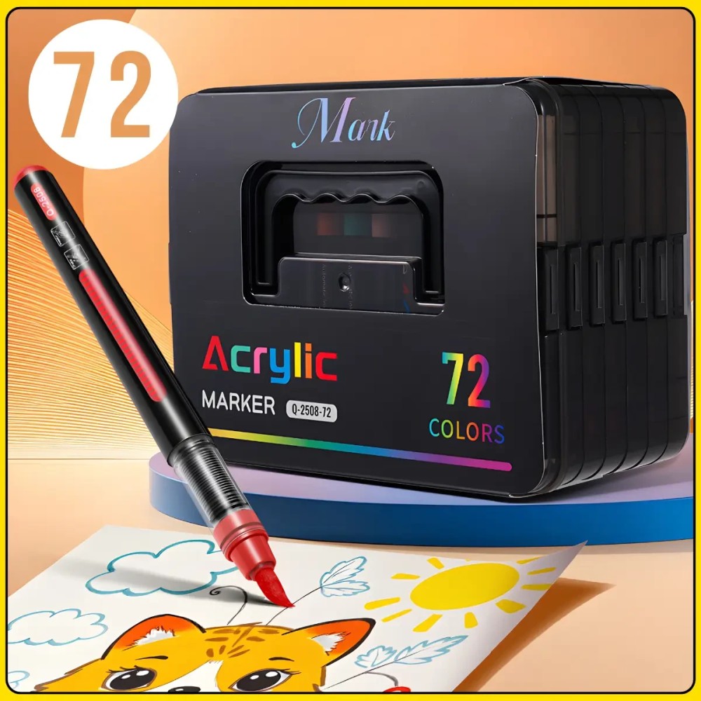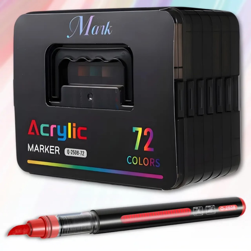 Набір акрилово-акварельних маркерів 72 кольори з наконечником пензель Acrylic MAP-16 Набір акрилових маркерів для творчості дає змогу створювати яскраві та виразні роботи на різних поверхнях, включно з папером, камінням, полотном, керамікою, металом і склом. Акрилове чорнило швидко висихає, має високу покриваність і не розтікається, забезпечуючи акуратний і насичений результат. Набір чудово підходить як для хобі, так і для декоративних робіт. Маркери обладнані м'яким наконечником-пензлем, який дає змогу варіювати товщину ліній і зручно зафарбовувати як дрібні деталі, так і великі ділянки. Прозорий пластиковий кейс із ручкою забезпечує зручне зберігання і перенесення, а компактний формат робить набір практичним для використання вдома або в дорозі. Переваги: Наконечник-пензлик: зручний для каліграфії та заливання Швидке висихання: без розмазування Висока покриваність: щільне покриття Не розтікаються: акуратні лінії та контури Універсальність: підходять для різних поверхонь Яскраві кольори: насичені відтінки Зручний кейс: зберігання й перенесення Ковпачок: захист від висихання Характеристики: Тип: акрилові маркери Кількість кольорів: 72 Тип маркера: односторонний Наконечник: м'який пензель Основа: водна Тип чорнила: акриловые Призначення: папір, камінь, полотно, кераміка, метал, скло Особливості чорнила: швидко сохнуть, не розтікаються, висока покриваність Розмір маркера: 138 x 14 мм Матеріал кейса: пластик Тип зберігання: кейс із ручкою Тип закриття: ковпачок Формат кейса: прозорий