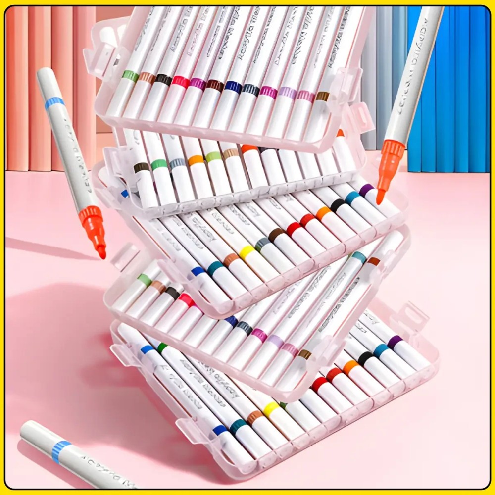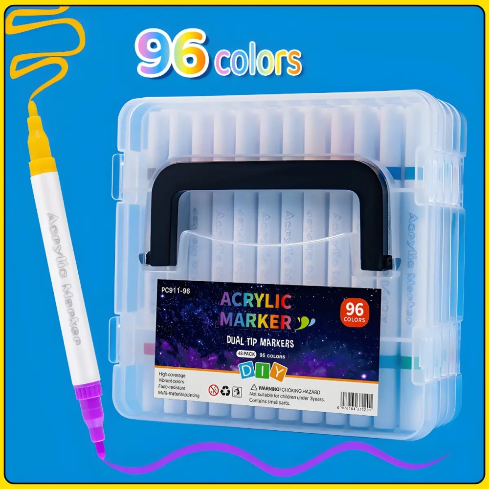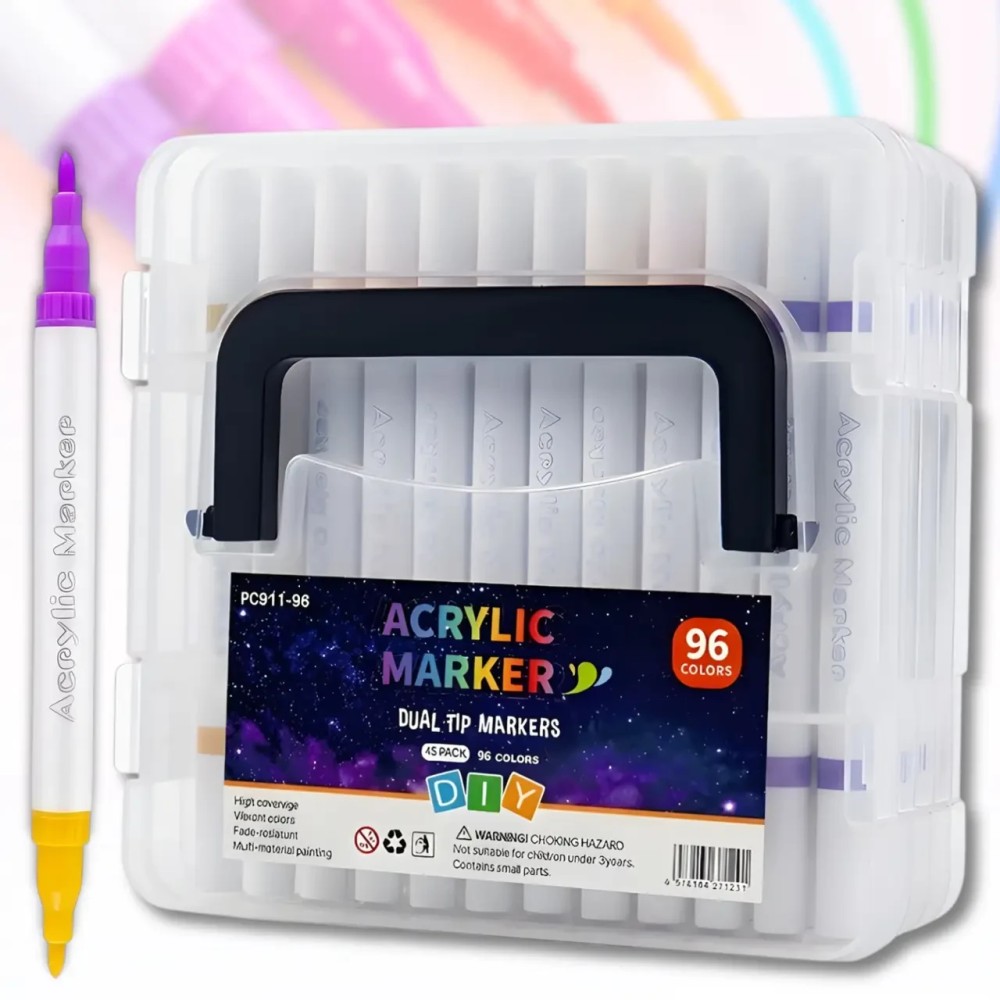 Двосторонні акрилові маркери 96 кольорів з кулястим наконечником у кейсі 48 штук MAP-07 Набір акрилових двосторонніх маркерів містить 48 маркерів з унікальною конструкцією: на кожному маркері розташовані два різні кольори з обох боків, що в сумі дає палітру з 96 відтінків. Це зручне рішення дає змогу економити місце та швидко перемикатися між кольорами в процесі роботи. Маркери підходять для малювання на папері, дереві, склі та кераміці, відкриваючи широкі можливості для творчості та декору. Твердий кулястий наконечник з обох боків забезпечує акуратне та точне нанесення ліній. Чорнило швидко висихає й дає щільне рівномірне покриття без розводів. Прозорий пластиковий кейс із ручкою робить зберігання і перенесення максимально зручними, а компактні розміри дають змогу брати набір із собою. Переваги: Два кольори в одному маркері: економія місця та зручність Двостороння конструкція: швидкий доступ до різних кольорів Твердий наконечник: точні й акуратні лінії Щільне покриття: рівномірне нанесення Швидке висихання: без розмазування Універсальність: підходить для різних поверхонь Характеристики: Тип: акрилові маркери Кількість маркерів: 48 шт. Кількість кольорів: 96 Конструкція: двосторонні, два кольори в одному маркері Наконечник: твердий (пулеподібний) Призначення: папір, дерево, скло, кераміка Особливості чорнила: швидко сохнуть, щільне покриття Закриття: ковпачок Розмір маркера: 131 x 9 мм Розмір кейса: 33 x 5 x 22 см Тип зберігання: кейс Матеріал кейса: пластик Колір кейса: прозорий