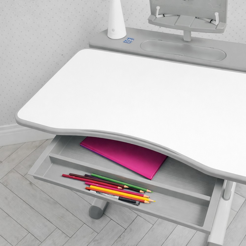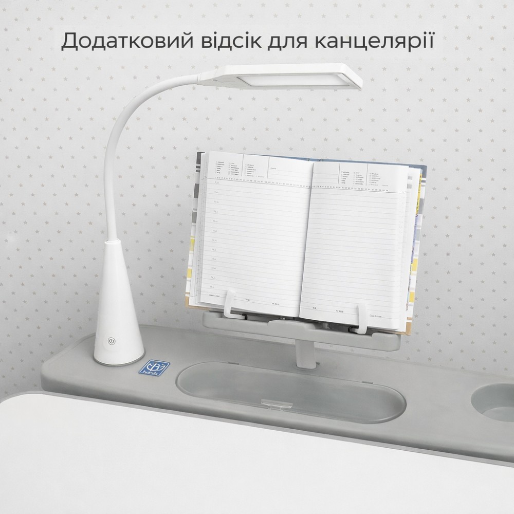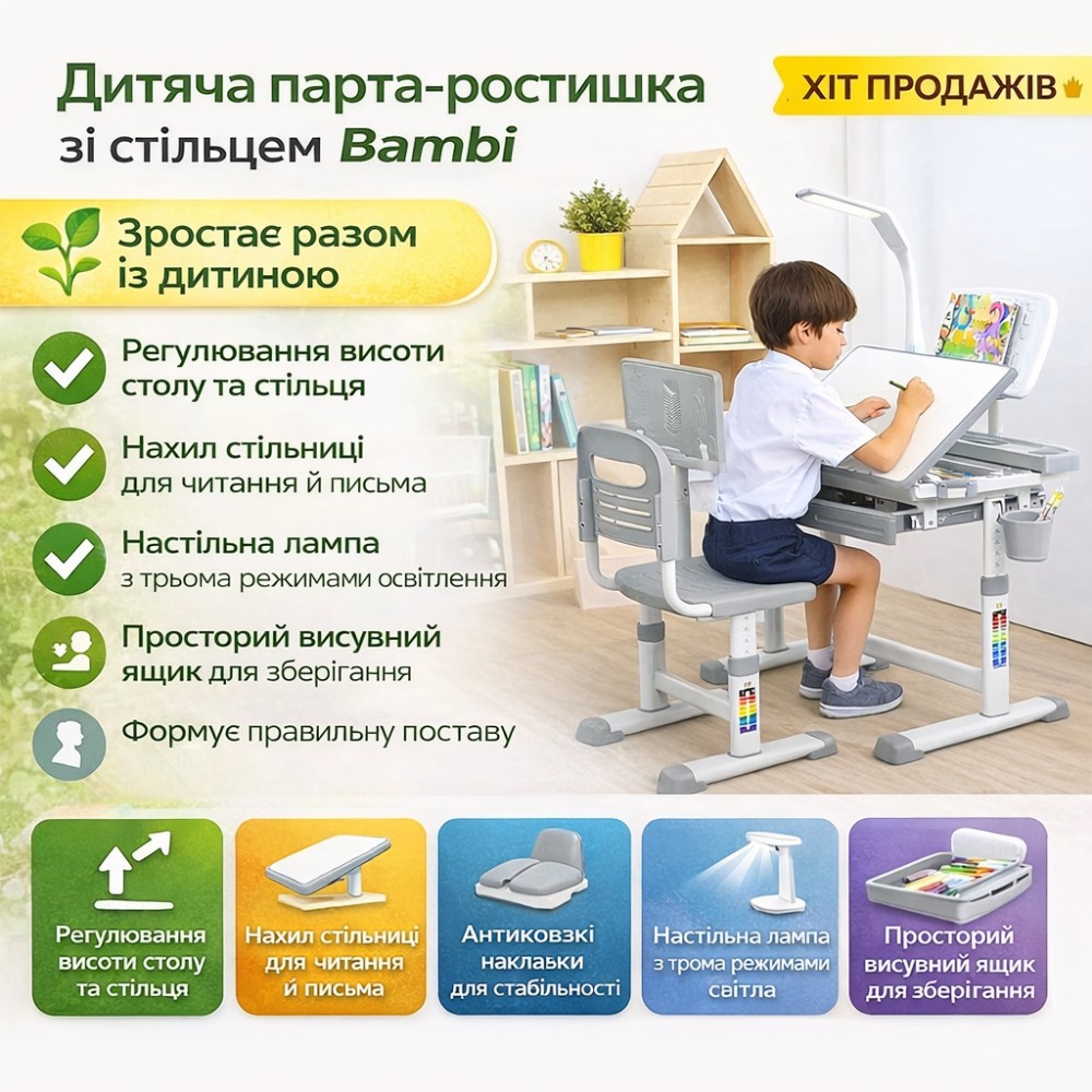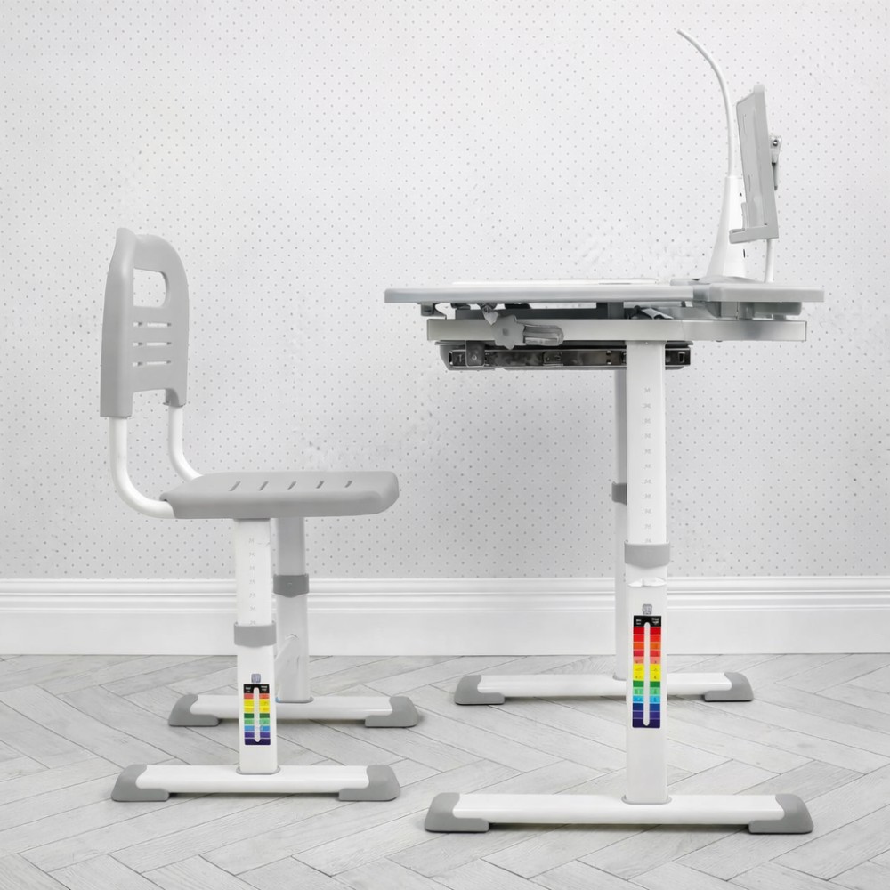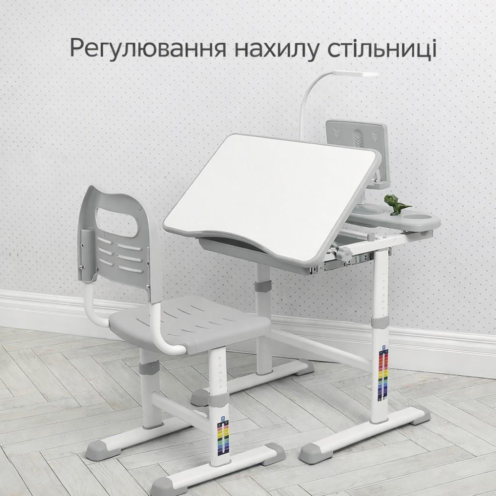 Дитяча металопластикова парта-ростишка зі стільчиком із регулюванням висоти та лампою Bambi M 4428-11 Сірий Парта учнівська Bambi M 4428 — стане чудовим робочим місцем для вашої дитини, завдяки своїй компактності вона не займе в кімнаті багато місця, до комплекту входить яскрава настільна лампа. Дитяча парта M 4428 має в комплекті столик і стільчик, їх висоту можна регулювати під зріст дитини, ця модель — це чудовий варіант для тих, хто цінує якість, надійність і комфорт, парта має міцний металевий каркас, що забезпечує їй високу надійність і довговічність. Дитяча учнівська Bambi M 4428 чудово підходить для виконання занять та занять творчістю, на стільниці є спеціальна підставка для книг, а під стільницею розміщена шухляда для зберігання письмового приладдя. Характеристики: Тип: Парта Лампа: 3 режими світла, працює від мережі Стільчик: Є Ящик під стільницею: так, висувний, усередині таблиця множення Підставка для книг: так, регульований нахил Габаритний розмір: Ширина: 70 см Глибина: 56 см Регульована висота min/max: З підставкою для книги: 77 см / 100 см З лампою: 102 см - 125 см Кількість положень висоти: мультипозиційна Розмір стільниці: Ширина: 70 см Глибина: 38 см Регульований нахил: так Висота до стільниці min/max: 51см - 74см Габаритний розмір: Ширина: 36 см Глибина: 40 см Регульована висота min/max: 62см - 74см Кількість положень висоти: мультипозиційна Сидіння: Ширина: 36 см Глибина: 34 см Висота до сидіння min/max: 30см / 42см
