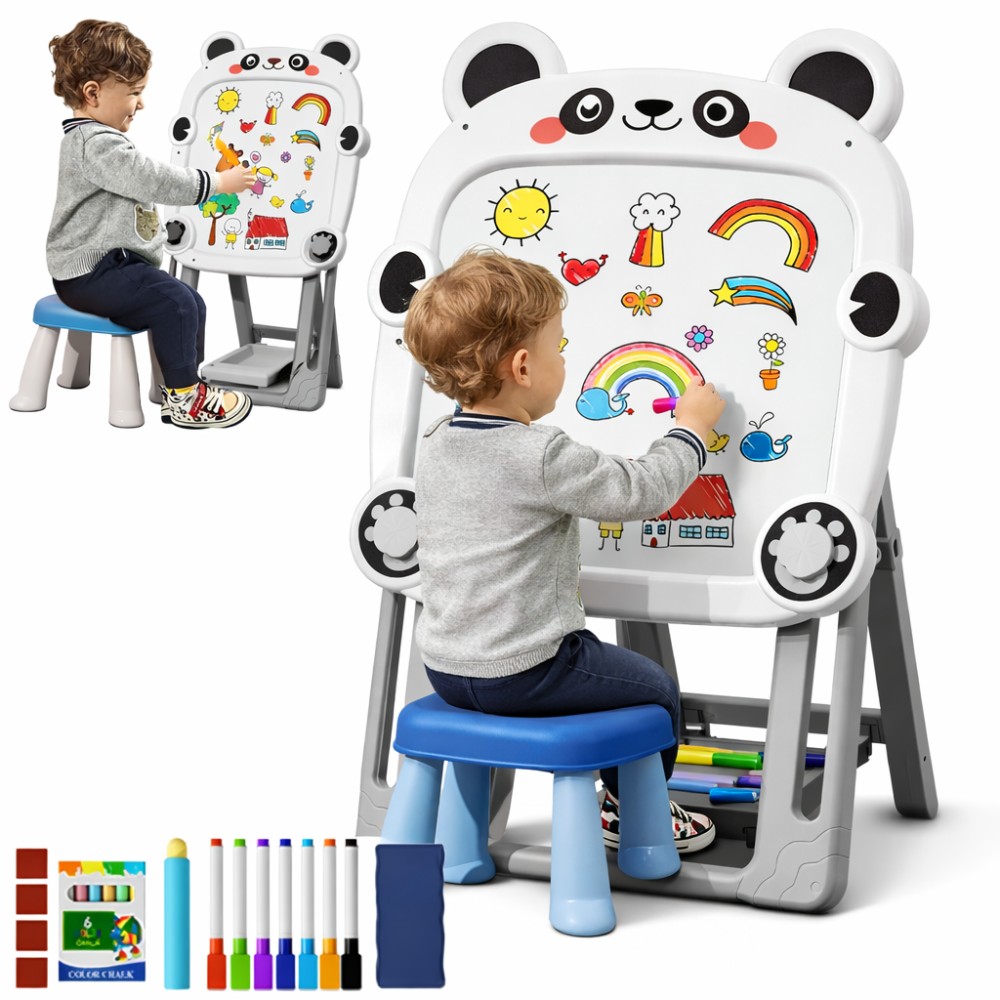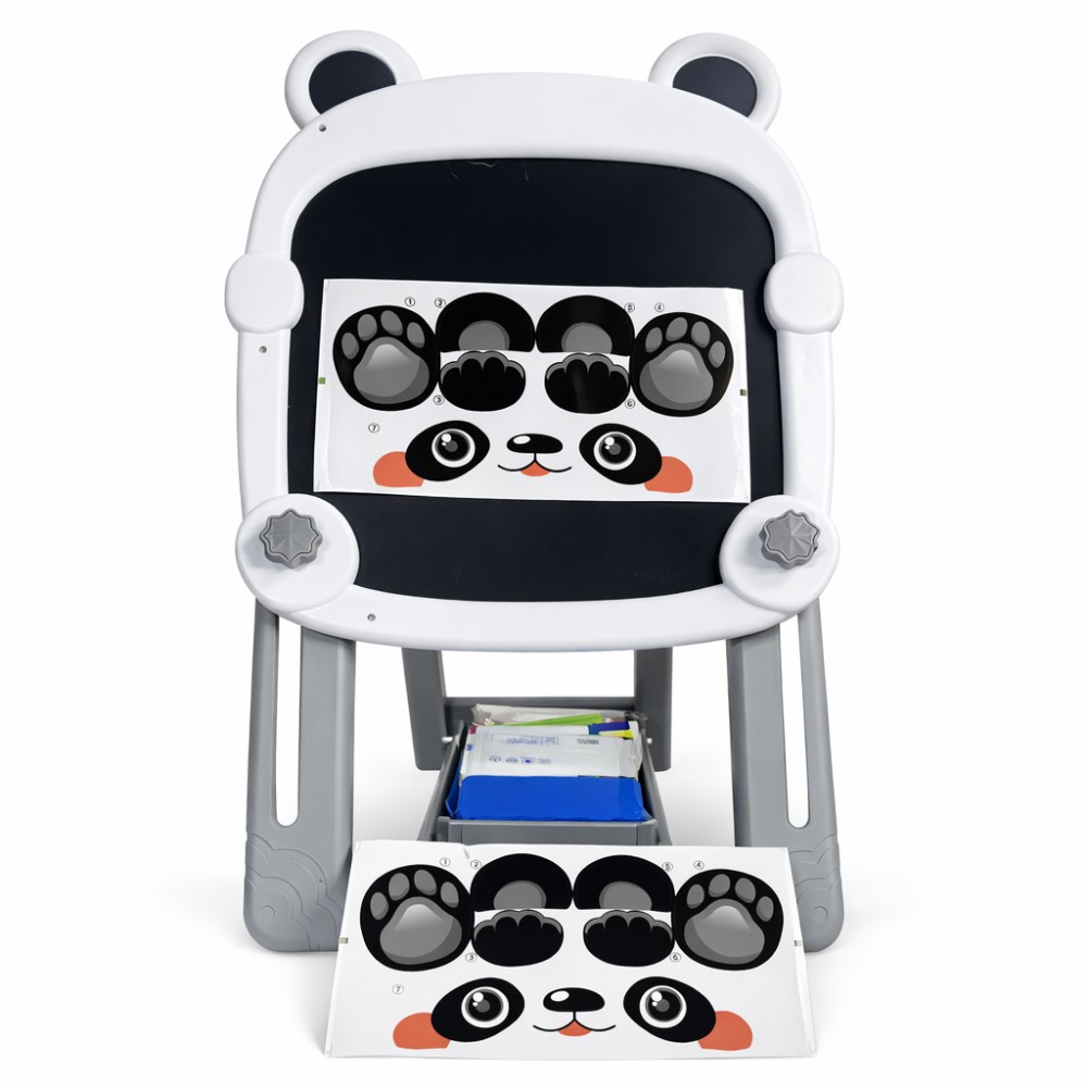 Опис Дитячий мольберт Fan&Fan у дизайні «Панда» призначений для творчості та навчання вдома. Конструкція виготовлена як стійка підлогова стійка з двома робочими поверхнями. Одна сторона — чорна крейдова дошка для малювання крейдою. Друга сторона — біла магнітно-маркерна поверхня для малювання маркерами та кріплення елементів. Мольберт встановлений на ніжках, обладнаний поворотними фіксувальними ручками з боків і нижньою полицею для зберігання аксесуарів. До комплекту входять приладдя для малювання. Підходить для домашнього використання, занять творчістю та розвитку навичок письма та малювання. Переваги Дві сторони для малювання: крейда та маркер Магнітно-маркерна поверхня Стійка підлогова конструкція Полиця для зберігання приладдя Дизайн у формі панди Характеристики Бренд: Fan&Fan Тип: дитячий підлоговий мольберт Конструкція: двостороння Сторона 1: крейдяна (чорна) Сторона 2: магнітно-маркерна (біла) Матеріал корпусу: пластик Колір: біло сірий Встановлення: підлогова Комплектація 1 × мольберт 1 × набір маркерів 1 × набір крейди 1 × губка для стирання 1 × полиця для зберігання