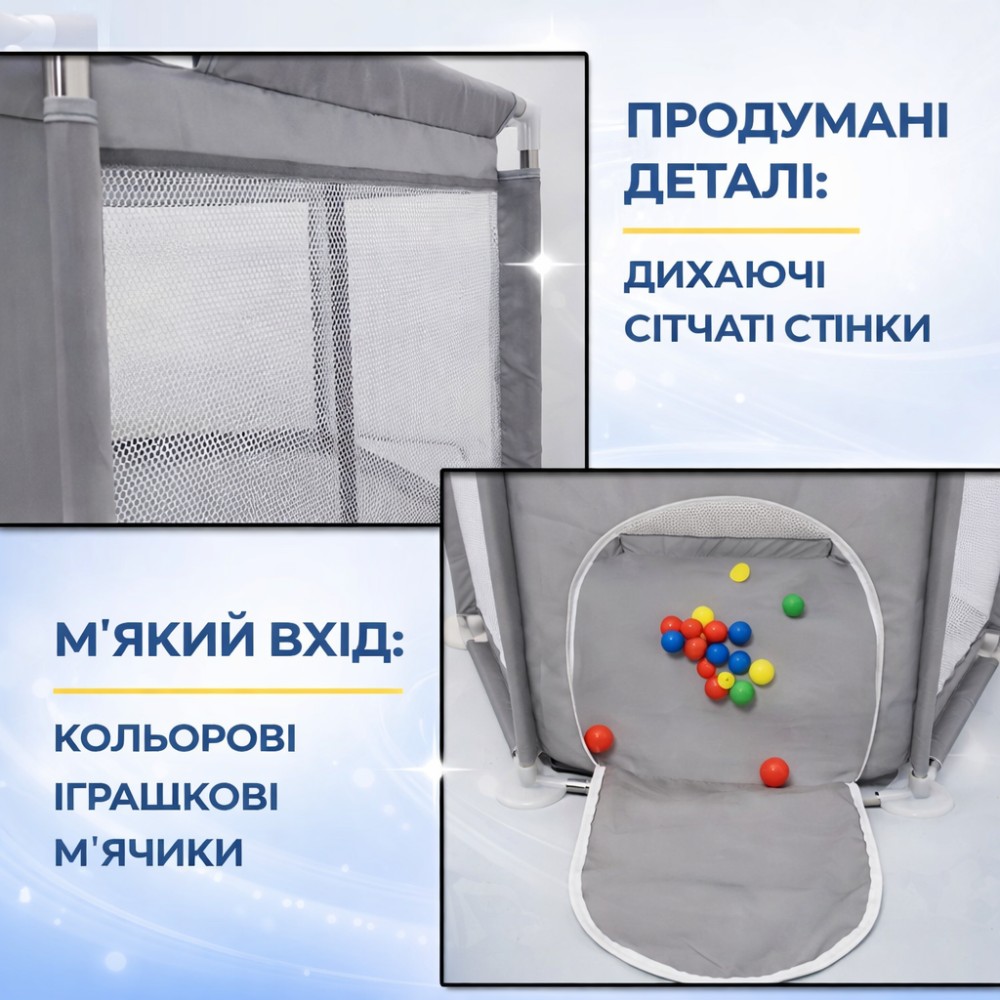 Опис товару Дитячий ігровий манеж шестикутний (напальна огорожа) Організуйте безпечний і захопливий простір для вашої дитини за допомогою зручного шестикутного манежу. Це ідеальне рішення для батьків, які хочуть робити домашні справи, знаючи, що малюк перебуває в безпеці та захоплений грою. Конструкція манежу розроблена так, щоб забезпечити максимальний огляд, стійкість і комфорт для дітей від 6 місяців. Переваги та особливості моделі: Повний огляд і вентиляція: Стінки манежу виготовлені з міцної прозорої сітки. Це дає змогу батькам постійно бачити, чим зайнята дитина, а малюкові — не почуватися ізольованим. Сітка також забезпечує чудову циркуляцію повітря всередині ігрової зони. Безпечний вхід: Манеж обладнаний спеціальним лазом на блискавці з зовнішнього боку. Це дає змогу дитині, що підросла самостійно забиратися всередину та виходити назовні тільки тоді, коли це дадуть змогу батьки (відкрити змійку зсередини неможливо). Стійка конструкція: Каркас складається з металевих трубок і міцних пластикових з'єднувачів. Шестикутна форма забезпечує чудову стійкість — манеж не перевернеться, навіть якщо дитина спирається на стінки. Простота догляду: Текстильна частина манежу виготовлена зі щільної тканини, яка легко очищається від забруднень вологою губкою. Матеріал гіпоалергенний і приємний на дотик. Мобільність: Конструкція легко розбирається й збирається. У складеному вигляді манеж займає мінімум місця, що дає змогу брати його із собою на дачу, природу або в гості. Технічні характеристики: Тип: манеж ігровий, огорожа Форма: шестикутна (6 секцій) Матеріал каркаса: металева трубка, пластик Матеріал стінок: текстиль, сітка Вхід: лаз на блискавці (застібається зовні) Дно: тканинне (рекомендується використовувати з килимком) Вікова група: від 6 місяців до 3 років Комплектація Трубки каркаса (комплект). Пластикові з'єднувачі. Текстильна основа із сіткою. Інструкція зі збирання. Паковання (картонна коробка).