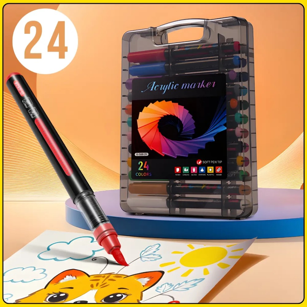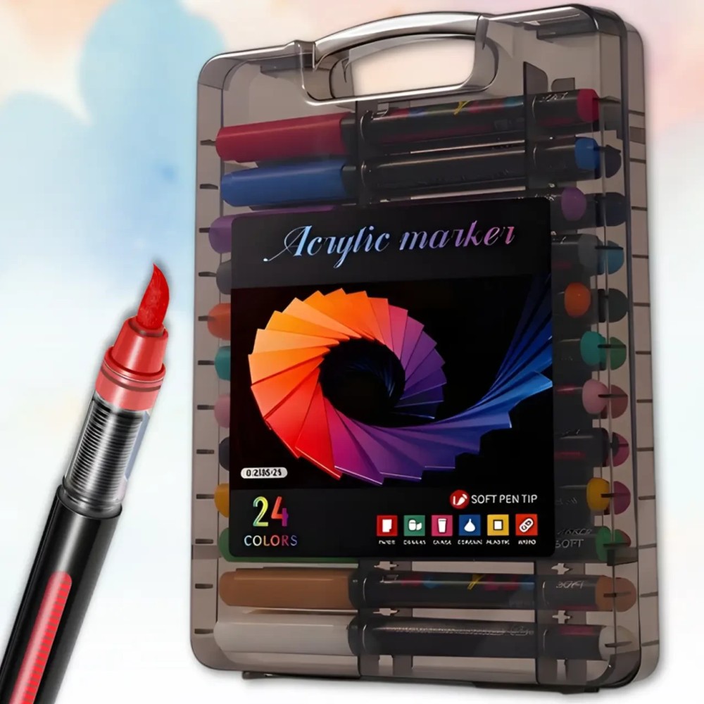 Набір акрилово-акварельних маркерів 24 кольори з наконечником пензель у кейсі Acrylic MAP-12 Набір акрилових маркерів для творчості дає змогу створювати яскраві та виразні роботи на різних поверхнях, включно з папером, камінням, полотном, керамікою, металом і склом. Акрилове чорнило швидко висихає, має високу покриваність і не розтікається, забезпечуючи акуратний і насичений результат. Набір чудово підходить як для хобі, так і для декоративних робіт. Маркери обладнані м'яким наконечником-пензлем, який дає змогу варіювати товщину ліній і зручно зафарбовувати як дрібні деталі, так і великі ділянки. Прозорий пластиковий кейс із ручкою забезпечує зручне зберігання і перенесення, а компактний формат робить набір практичним для використання вдома або в дорозі. Переваги: Наконечник-пензлик: зручний для каліграфії та заливання Швидке висихання: без розмазування Висока покриваність: щільне покриття Не розтікаються: акуратні лінії та контури Універсальність: підходять для різних поверхонь Яскраві кольори: насичені відтінки Зручний кейс: зберігання й перенесення Ковпачок: захист від висихання Характеристики: Тип: акрилові маркери Кількість кольорів: 24 Тип маркера: односторонний Наконечник: м'який пензель Основа: водна Тип чорнила: акриловые Призначення: папір, камінь, полотно, кераміка, метал, скло Особливості чорнила: швидко сохнуть, не розтікаються, висока покриваність Розмір маркера: 138 x 14 мм Матеріал кейса: пластик Тип зберігання: кейс із ручкою Тип закриття: ковпачок Формат кейса: прозорий