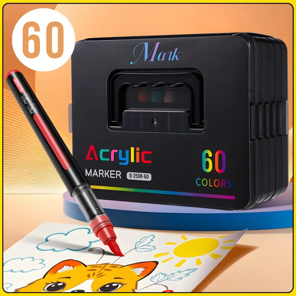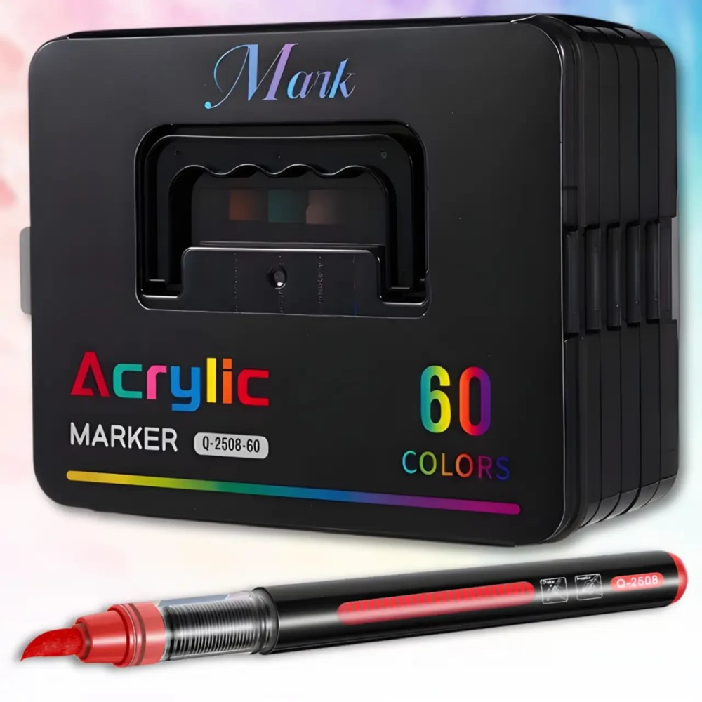 Набір акрилово-акварельних маркерів 60 кольорів у кейсі з наконечником пензель Acrylic MAP-15 Набір акрилових маркерів для творчості дає змогу створювати яскраві та виразні роботи на різних поверхнях, включно з папером, камінням, полотном, керамікою, металом і склом. Акрилове чорнило швидко висихає, має високу покриваність і не розтікається, забезпечуючи акуратний і насичений результат. Набір чудово підходить як для хобі, так і для декоративних робіт. Маркери обладнані м'яким наконечником-пензлем, який дає змогу варіювати товщину ліній і зручно зафарбовувати як дрібні деталі, так і великі ділянки. Прозорий пластиковий кейс із ручкою забезпечує зручне зберігання і перенесення, а компактний формат робить набір практичним для використання вдома або в дорозі. Переваги: Наконечник-пензлик: зручний для каліграфії та заливання Швидке висихання: без розмазування Висока покриваність: щільне покриття Не розтікаються: акуратні лінії та контури Універсальність: підходять для різних поверхонь Яскраві кольори: насичені відтінки Зручний кейс: зберігання й перенесення Ковпачок: захист від висихання Характеристики: Тип: акрилові маркери Кількість кольорів: 60 Тип маркера: односторонний Наконечник: м'який пензель Основа: водна Тип чорнила: акриловые Призначення: папір, камінь, полотно, кераміка, метал, скло Особливості чорнила: швидко сохнуть, не розтікаються, висока покриваність Розмір маркера: 138 x 14 мм Матеріал кейса: пластик Тип зберігання: кейс із ручкою Тип закриття: ковпачок Формат кейса: прозорий