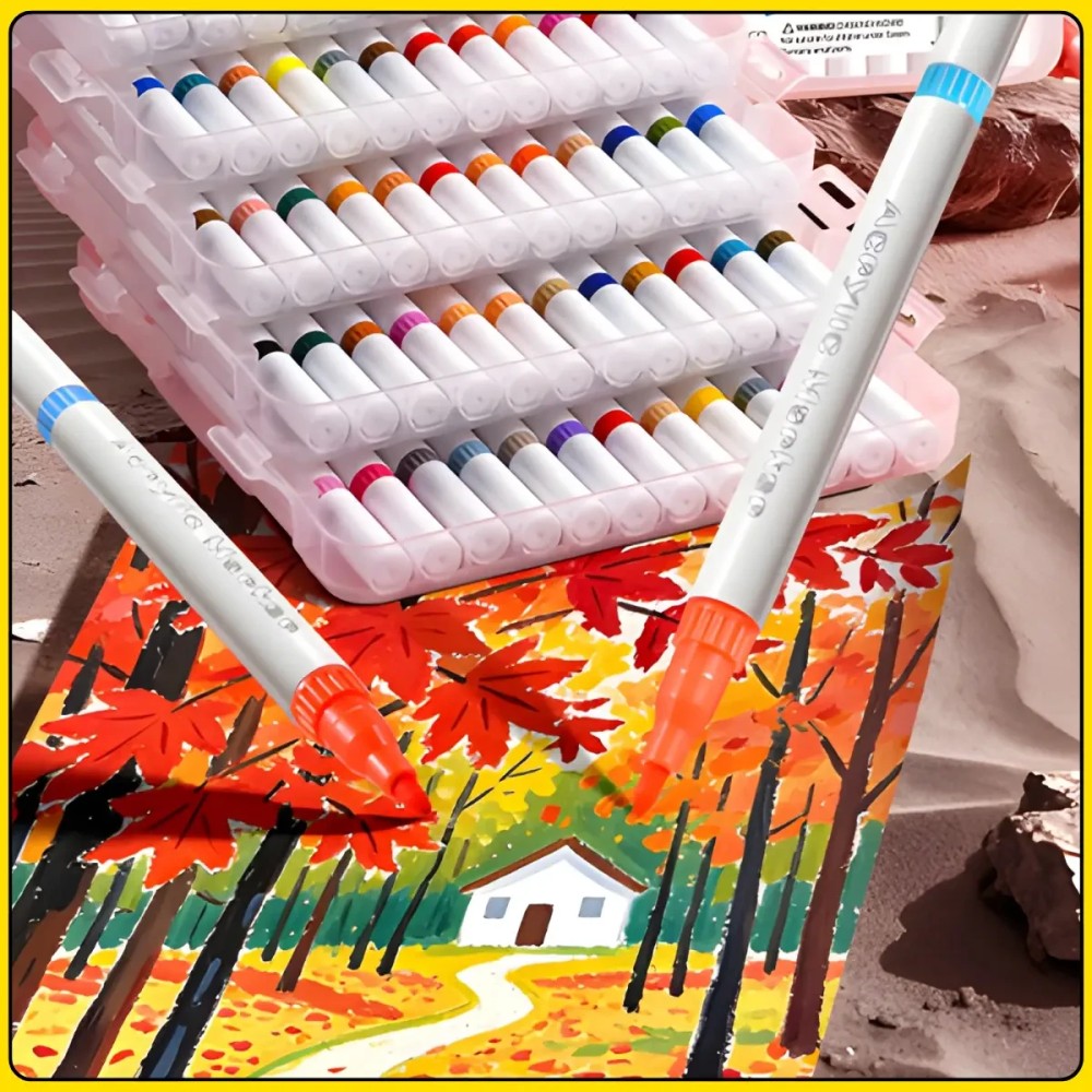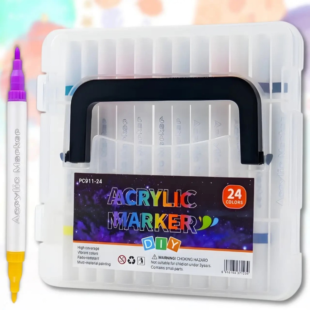 Двосторонні акрилові маркери 24 кольори з кулястим наконечником у кейсі 12 штук MAP-10 Набір акрилових двосторонніх маркерів містить 12 маркерів з унікальною конструкцією: на кожному маркері розташовані два різні кольори з обох боків, що в сумі дає палітру з 24 відтінків. Це зручне рішення дає змогу економити місце та швидко перемикатися між кольорами в процесі роботи. Маркери підходять для малювання на папері, дереві, склі та кераміці, відкриваючи широкі можливості для творчості та декору. Твердий кулястий наконечник з обох боків забезпечує акуратне та точне нанесення ліній. Чорнило швидко висихає й дає щільне рівномірне покриття без розводів. Прозорий пластиковий кейс із ручкою робить зберігання і перенесення максимально зручними, а компактні розміри дають змогу брати набір із собою. Переваги: Два кольори в одному маркері: економія місця та зручність Двостороння конструкція: швидкий доступ до різних кольорів Твердий наконечник: точні й акуратні лінії Щільне покриття: рівномірне нанесення Швидке висихання: без розмазування Універсальність: підходить для різних поверхонь Характеристики: Тип: акрилові маркери Кількість маркерів: 12 шт. Кількість кольорів: 24 Конструкція: двосторонні, два кольори в одному маркері Наконечник: твердий (пулеподібний) Призначення: папір, дерево, скло, кераміка Особливості чорнила: швидко сохнуть, щільне покриття Закриття: ковпачок Розмір маркера: 131 x 9 мм Розмір кейса: 17 x 4 x 14,5 см Тип зберігання: кейс Матеріал кейса: пластик Колір кейса: прозорий